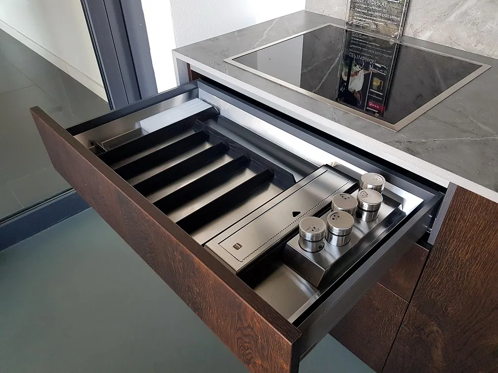 Внутреннее наполнение: встраиваемая вытяжка FABER, вкладыш для столовых приборов для кассеты на 90 см (шпон/нерж.сталь), вкладыш включающий емкости для хранения сыпучих продуктов и разделители внутреннего пространства (шпон / нерж.сталь/стекло)