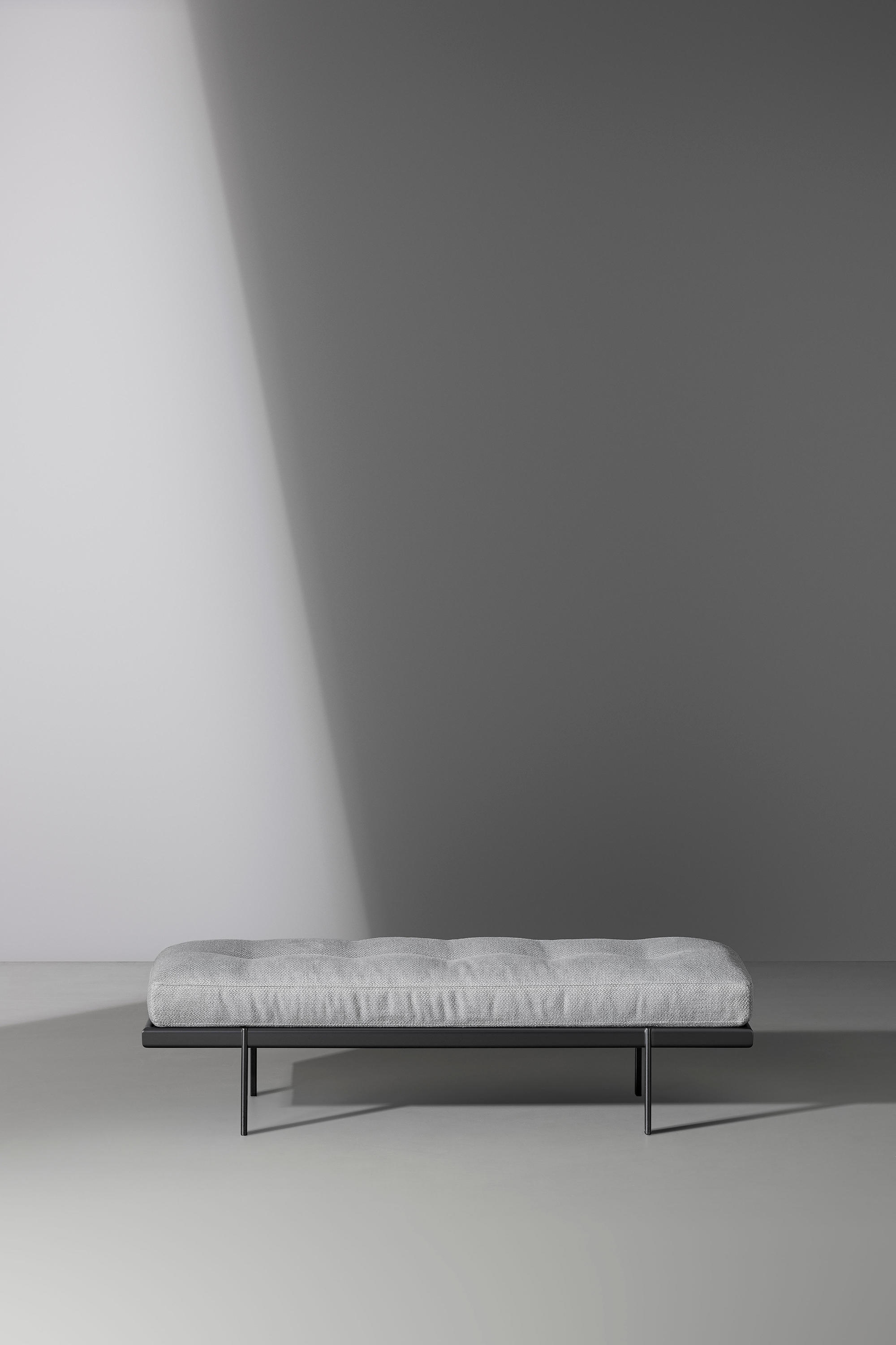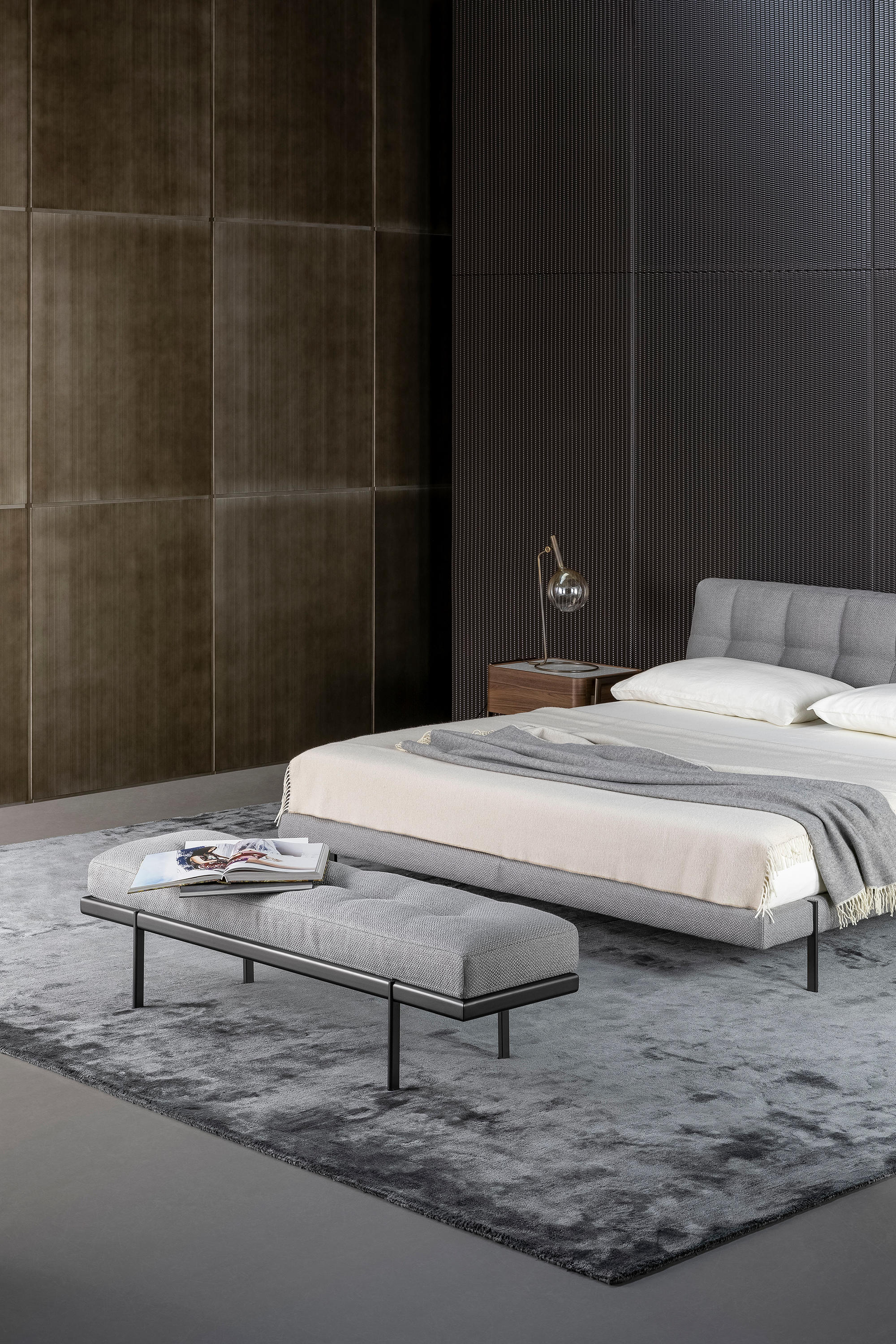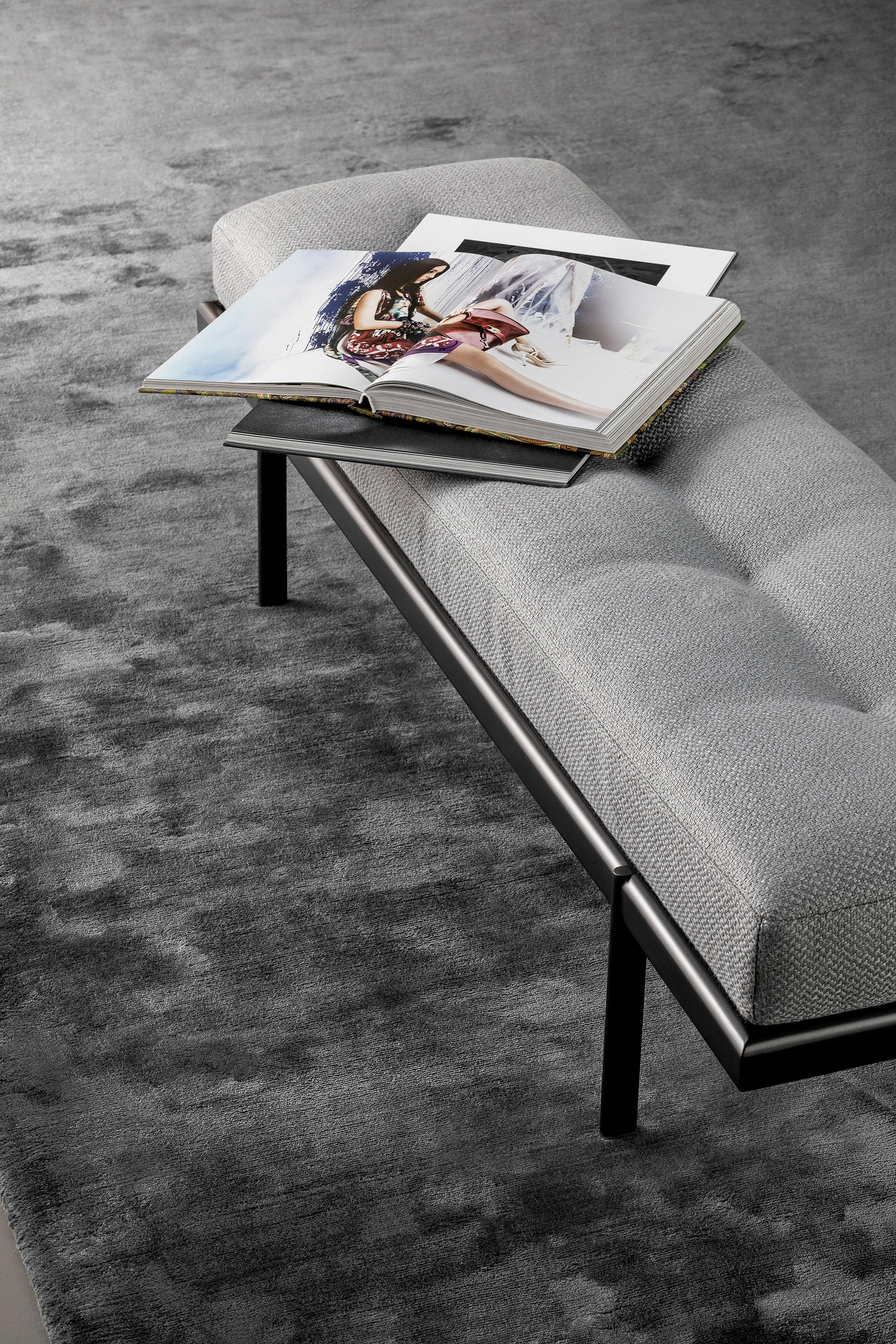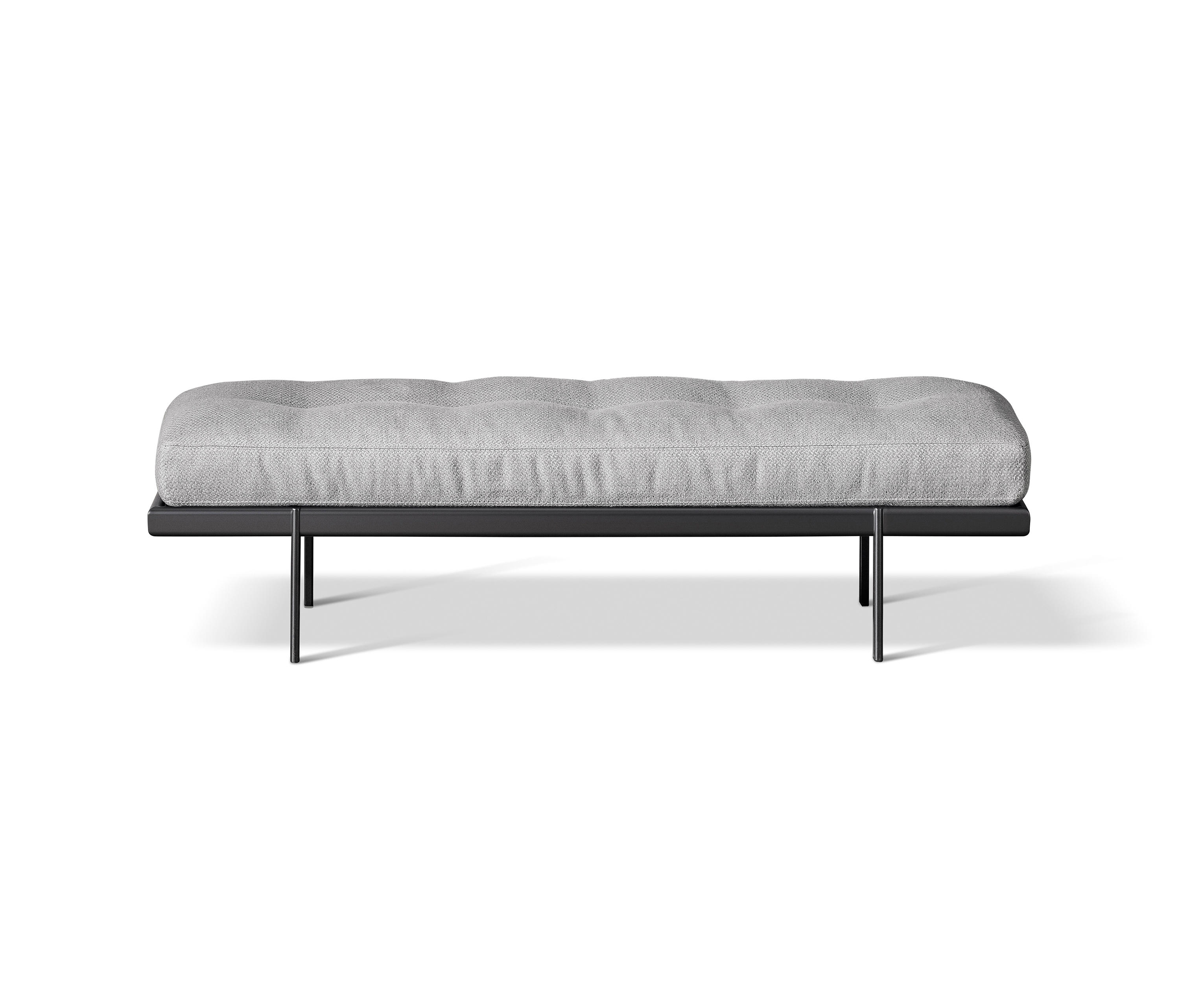Идеальное дополнение к двуспальной кровати того же семейства, скамья James вдохновлена элегантностью, характерной для дизайна 1950-х годов, в частности, изысканными деталями строчек и стежков на обивке мягкого сиденья. Стилистическая тема сиденья контрастирует с минималистичным и строгим дизайном основания, которое выполнено из металла , имеет четкое разграничение между несущим верхом и четырьмя видимыми цилиндрическими ножками. Перед нами умелая игра пропорций и материалов, выходящая за рамки условностей стиля.