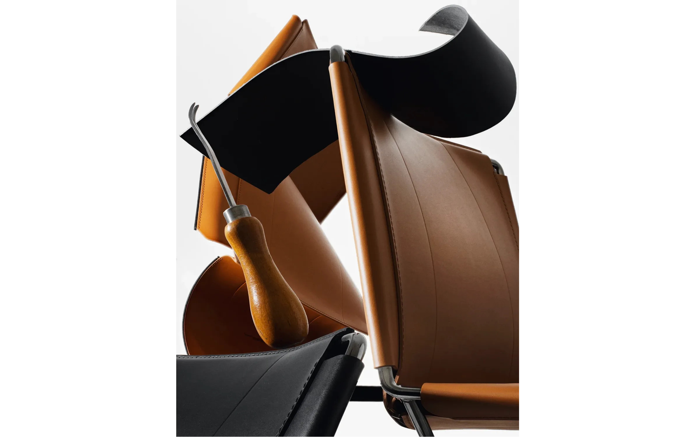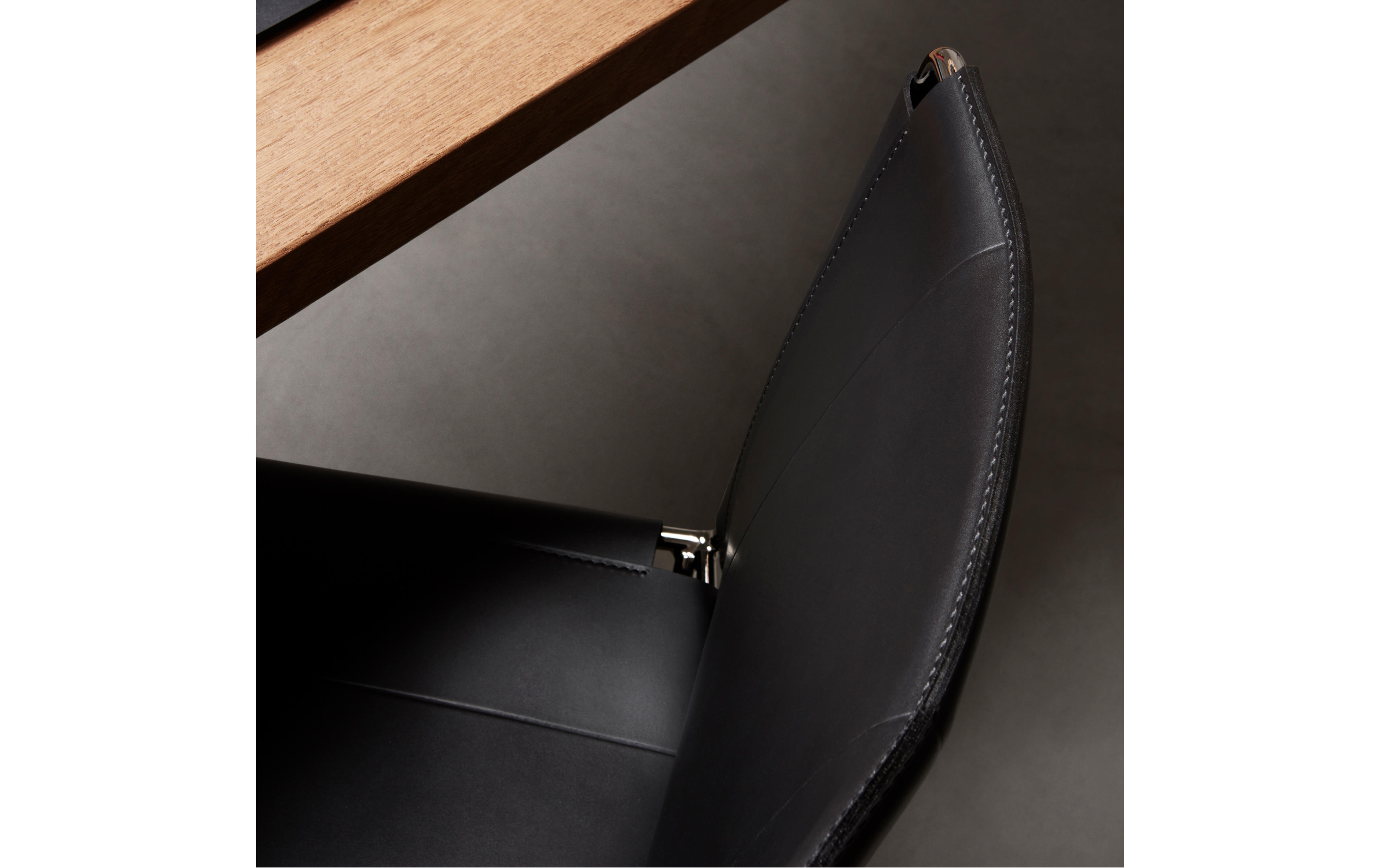 Каркас: хромированный металл. Отделка: черная седельная кожа.