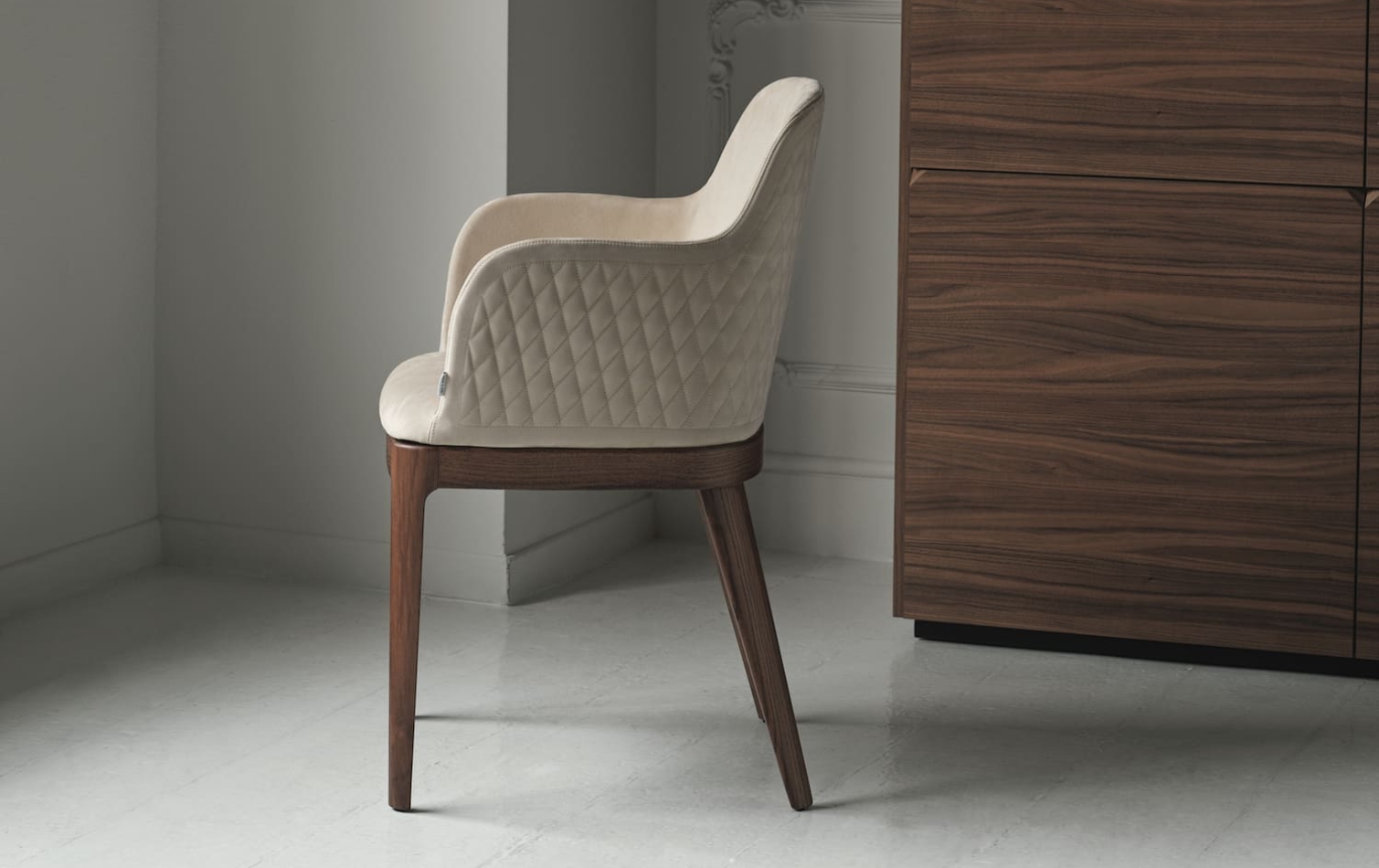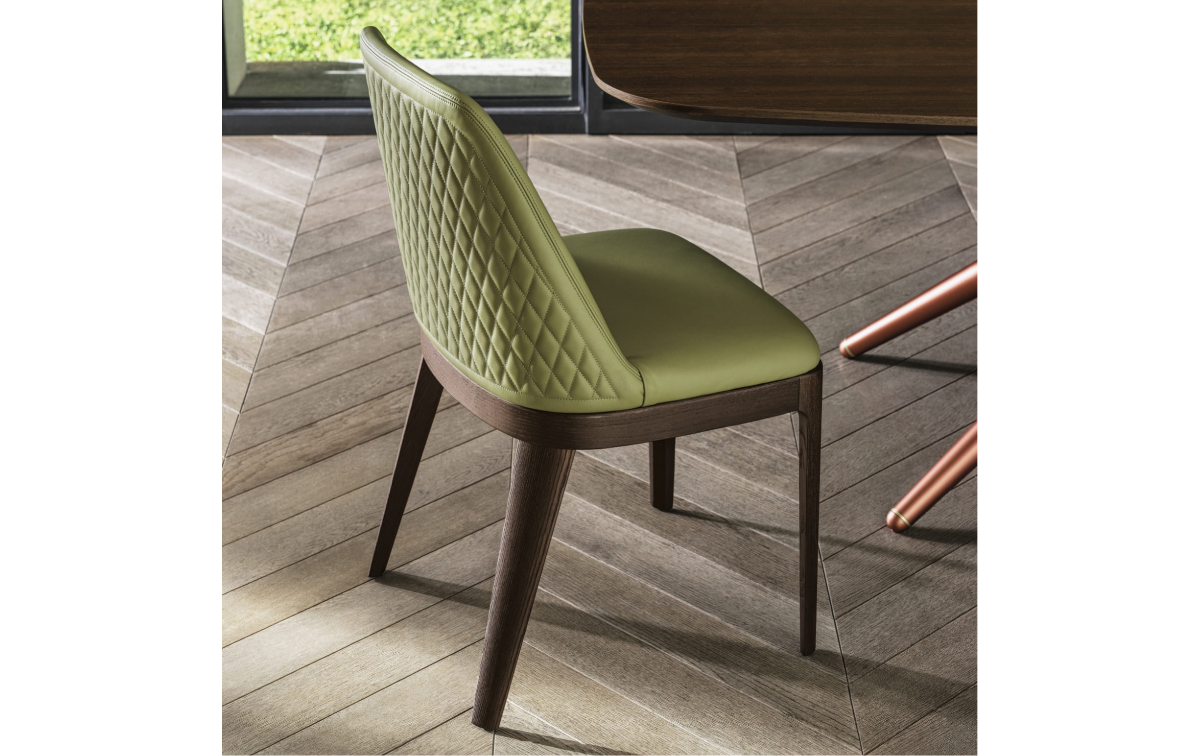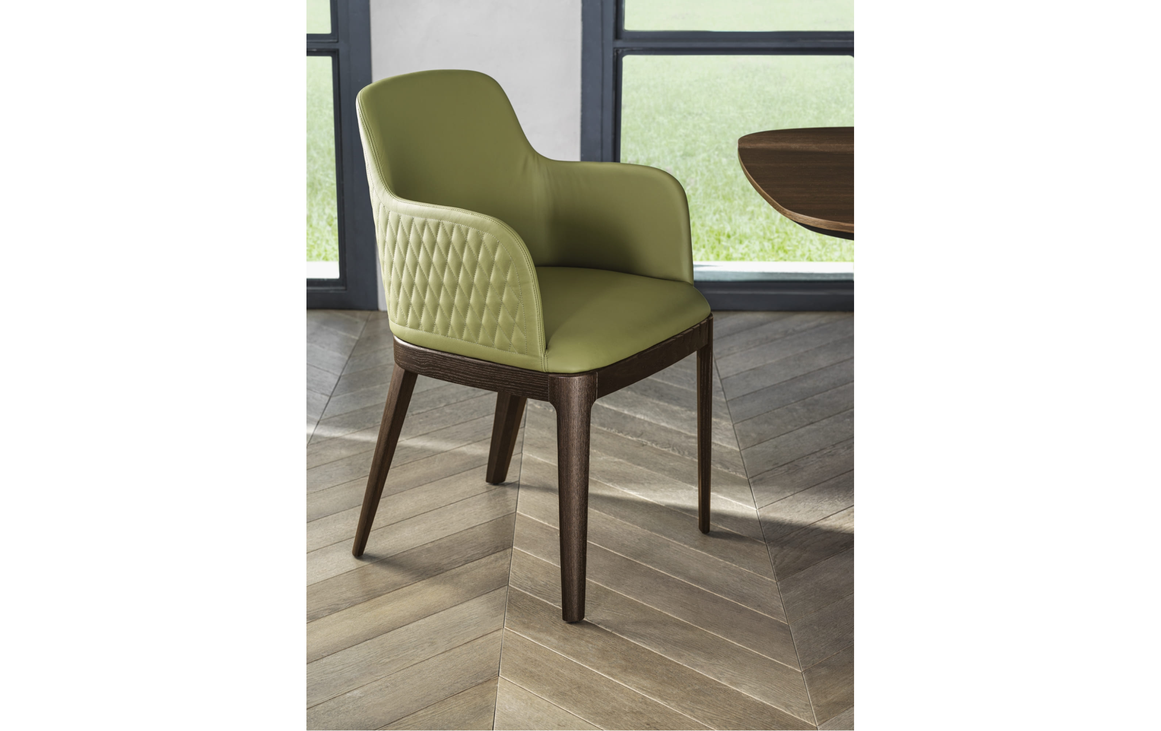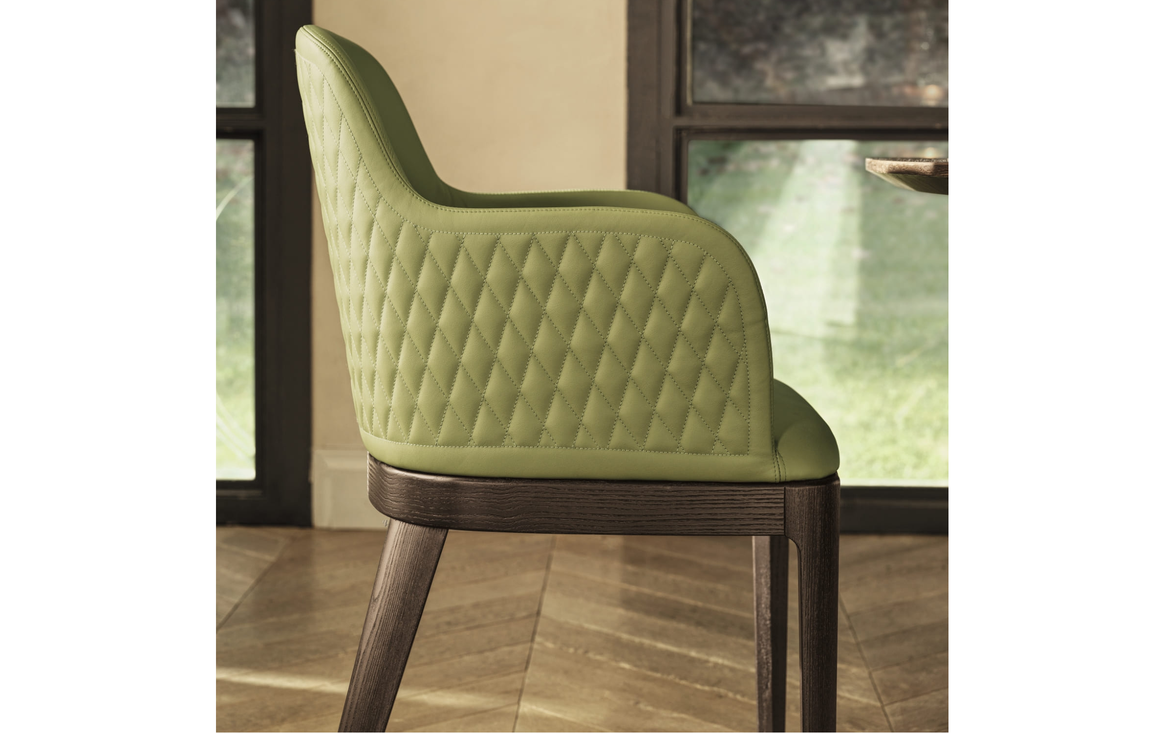 Коллекция стульев Margot в версиях с подлокотниками или без подлокотников. Каркас – массив дерева или сталь. Мягкое монолитное сиденье с обивкой из ткани, кожи или экокожи. Можно заказать стул с прошивкой на спинке (доступно в обивке из нубука, экокожи или кожи премиум). Стул с основанием из массива дерева, мягким монолитным сидением в обивке из экокожи, экологическая кожа премиум, технический бархат, ткани Mambo и Lulù, водонепроницаемого нубука, принта водонепроницаемого нубука, чистой шерсти, бархата и кожи премиум. Стул доступен в версии с прошивкой на спинке (только в обивке из водонепроницаемого нубука, экокожи и кожи премиум).