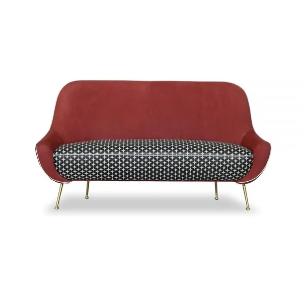 В конструкции предусмотрены устойчивые металлические ножки (матовая латунь); расположенные наклонно. Мягкое сидение наполнено полиуретаном с акриловыми волокнами. Спинка оформлена плавными переходами в боковые части. Основание изготовлено из сосны. В качестве обивочного материала используется комбинация кожи и текстиля в различных цветовых вариациях. Диван возможен в двух видах: двухместном и двухместном-угловом.