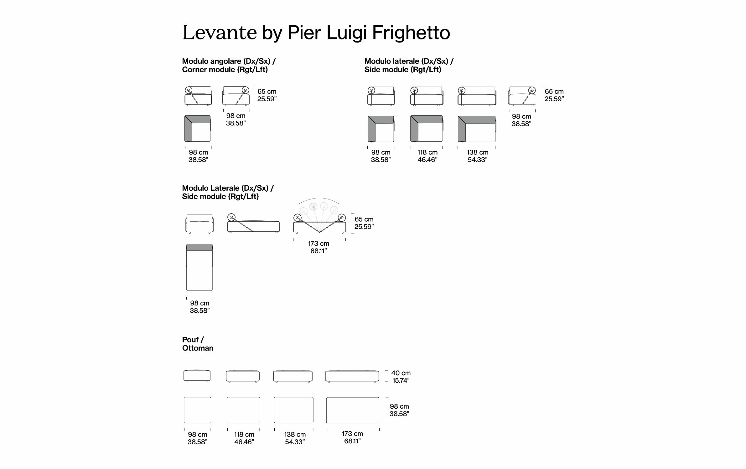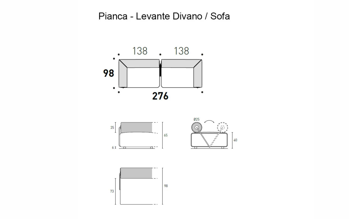Levante от Pianca — это эклектичный модульный диван, разработанный дизайнером Pier Luigi Frighetto, который идеально адаптируется к динамичным потребностям современной гостиной. Нарушая традиционные рамки, сиденье имеет двустороннюю ориентацию, а спинка центрального модуля и шезлонга представлена откидным валиком для легкого переворачивания. Угловые элементы, терминальные модули и пуфы различных размеров позволяют создавать бесконечные конфигурации, подходящие даже для центра комнаты. Компактные плавные формы, подчеркнутые репсовой окантовкой (кантом), делают Levante символом итальянской роскоши и функциональности.