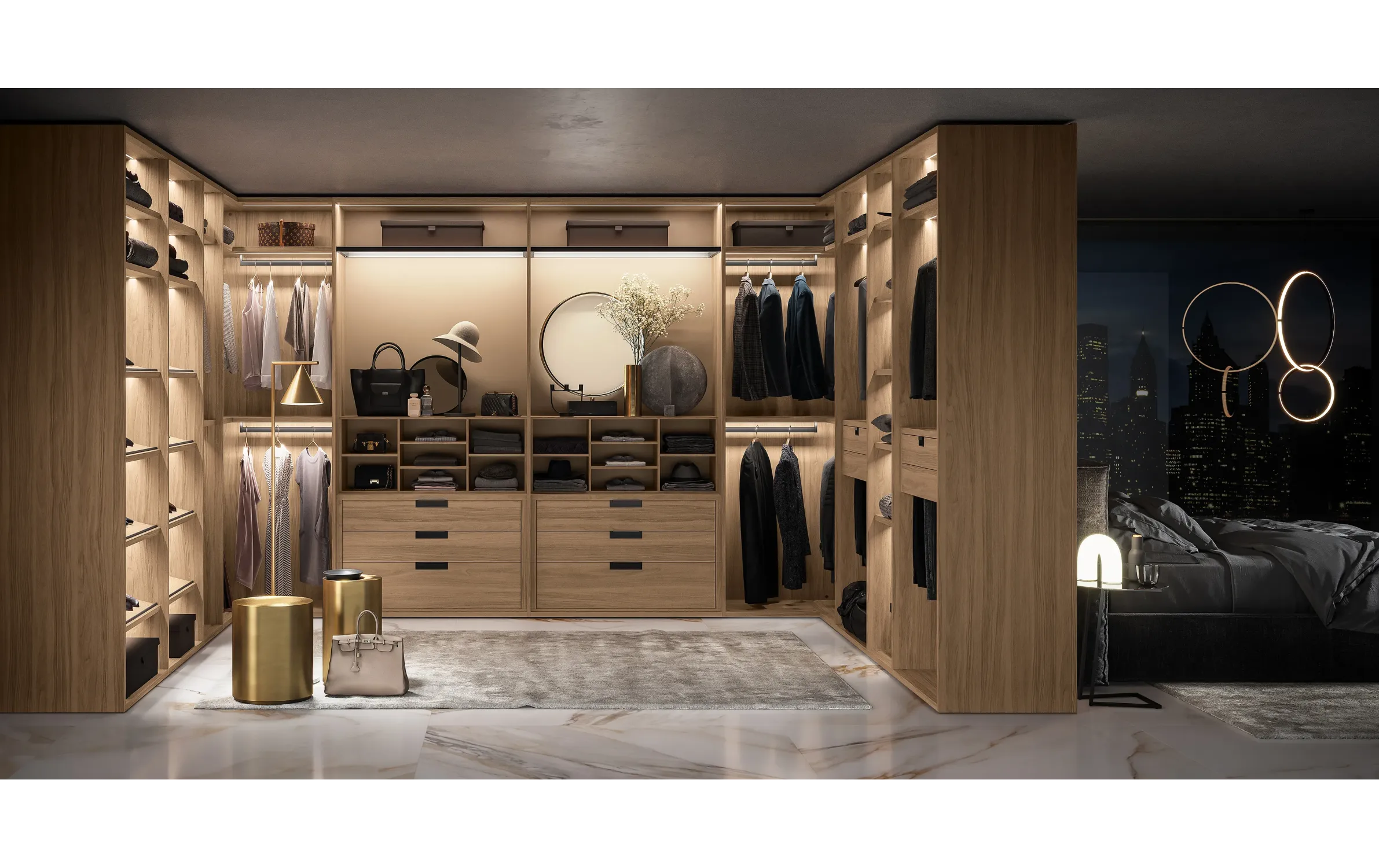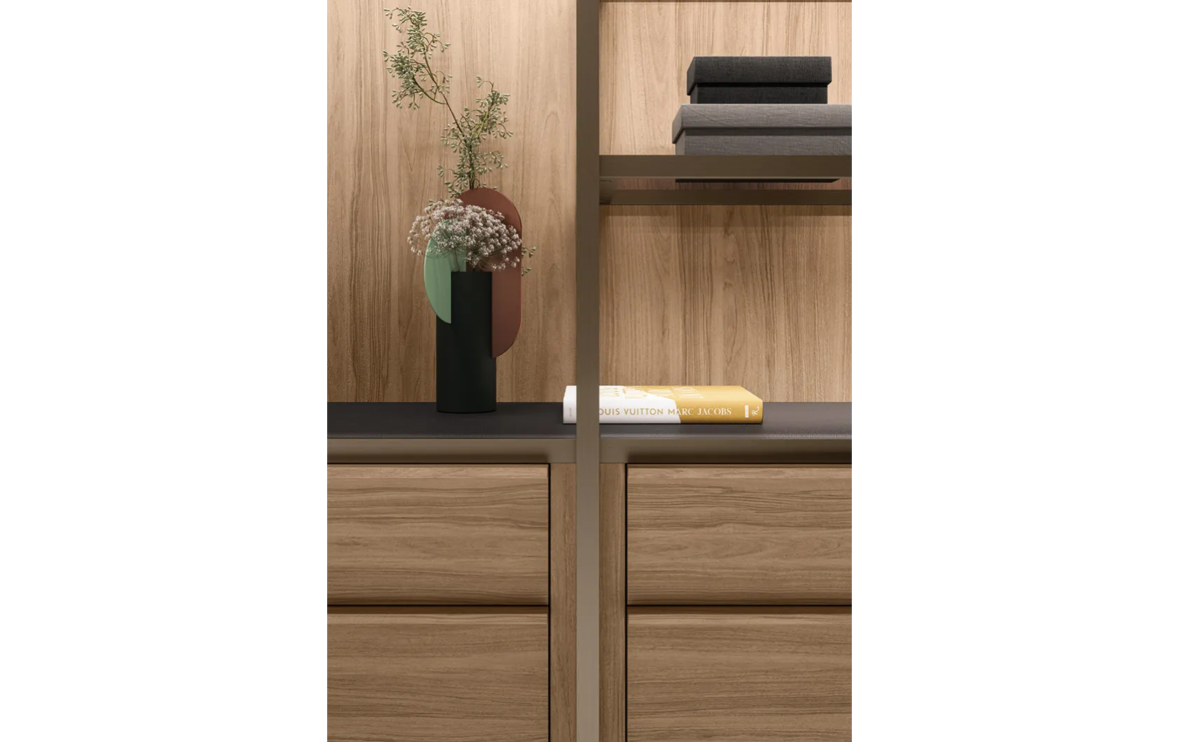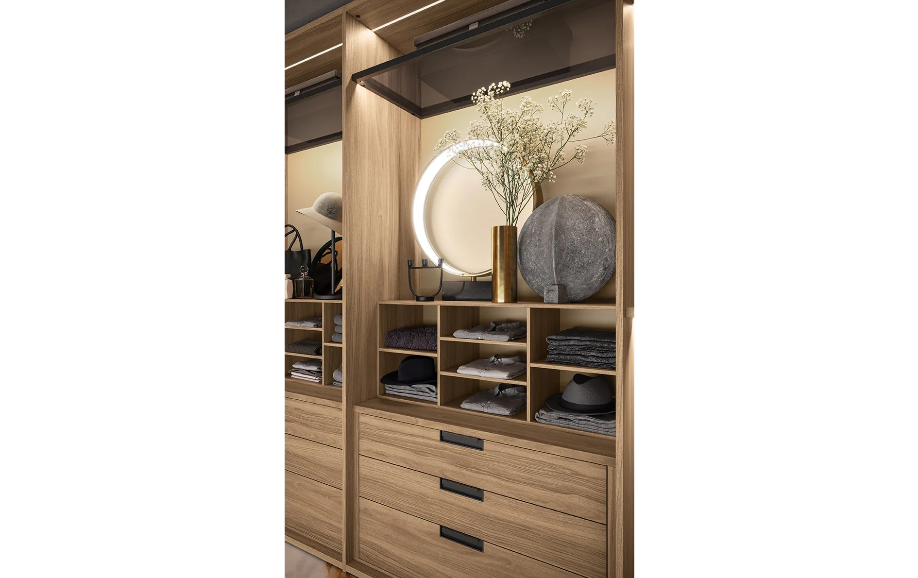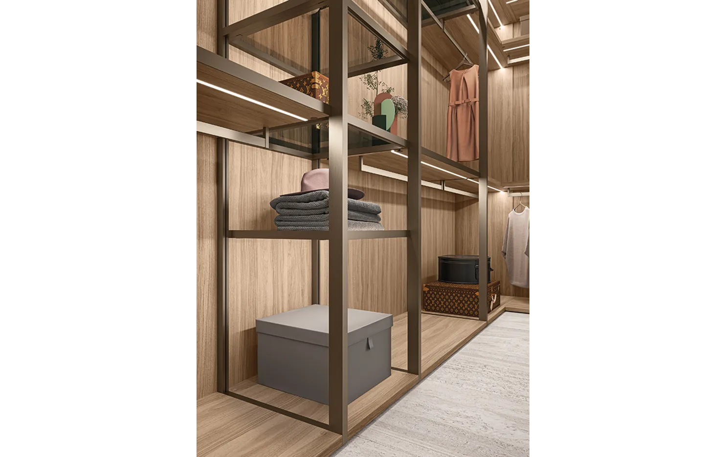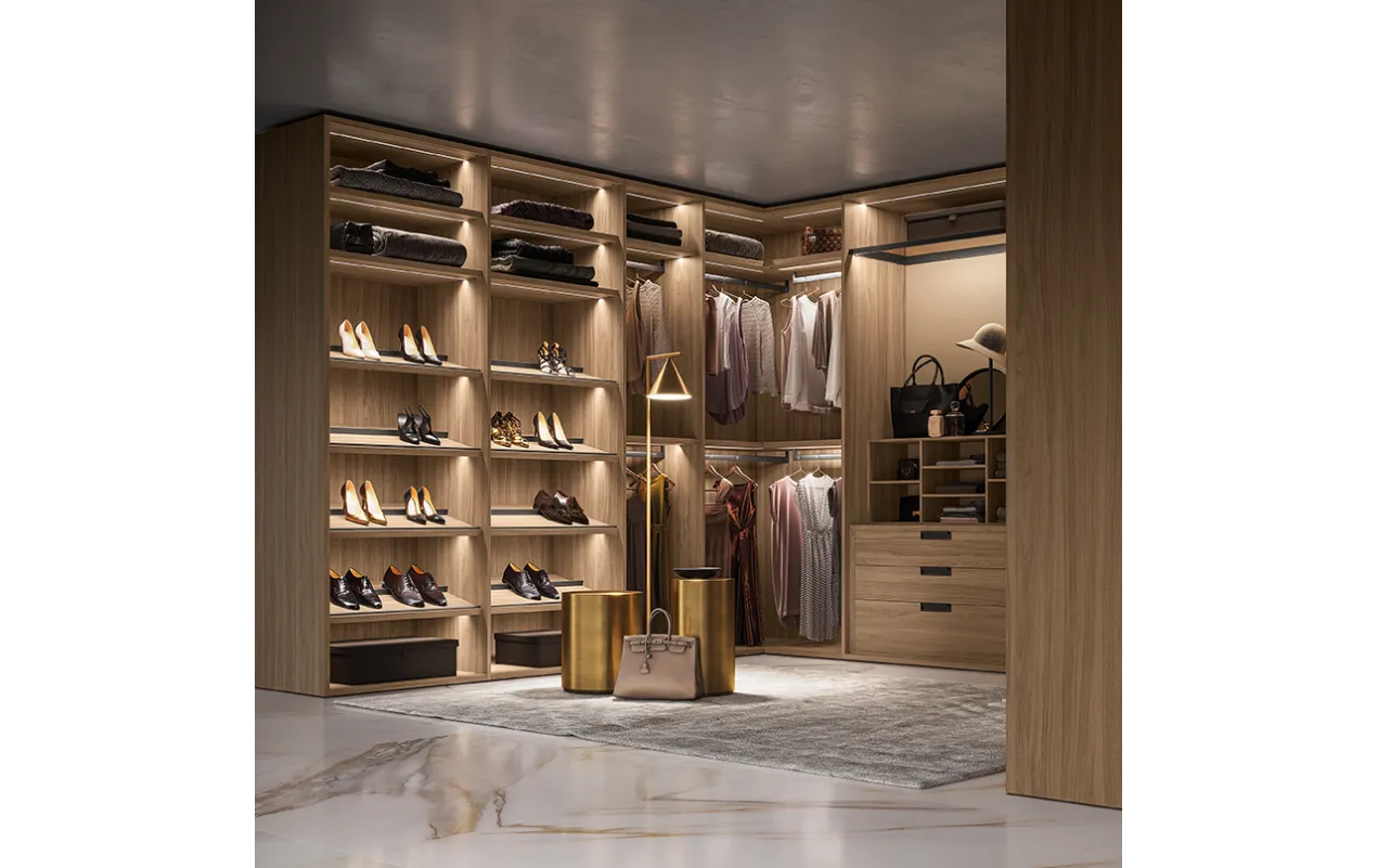 - Модульность и адаптивность: система позволяет конфигурировать различные элементы, такие как полки, ящики, вешала и аксессуары, обеспечивая максимальную гибкость в организации хранения.
