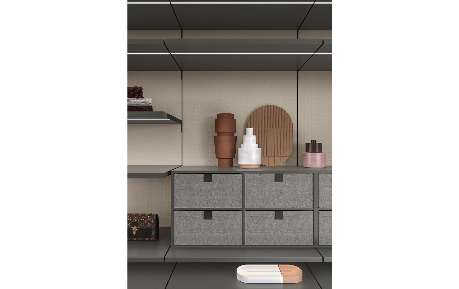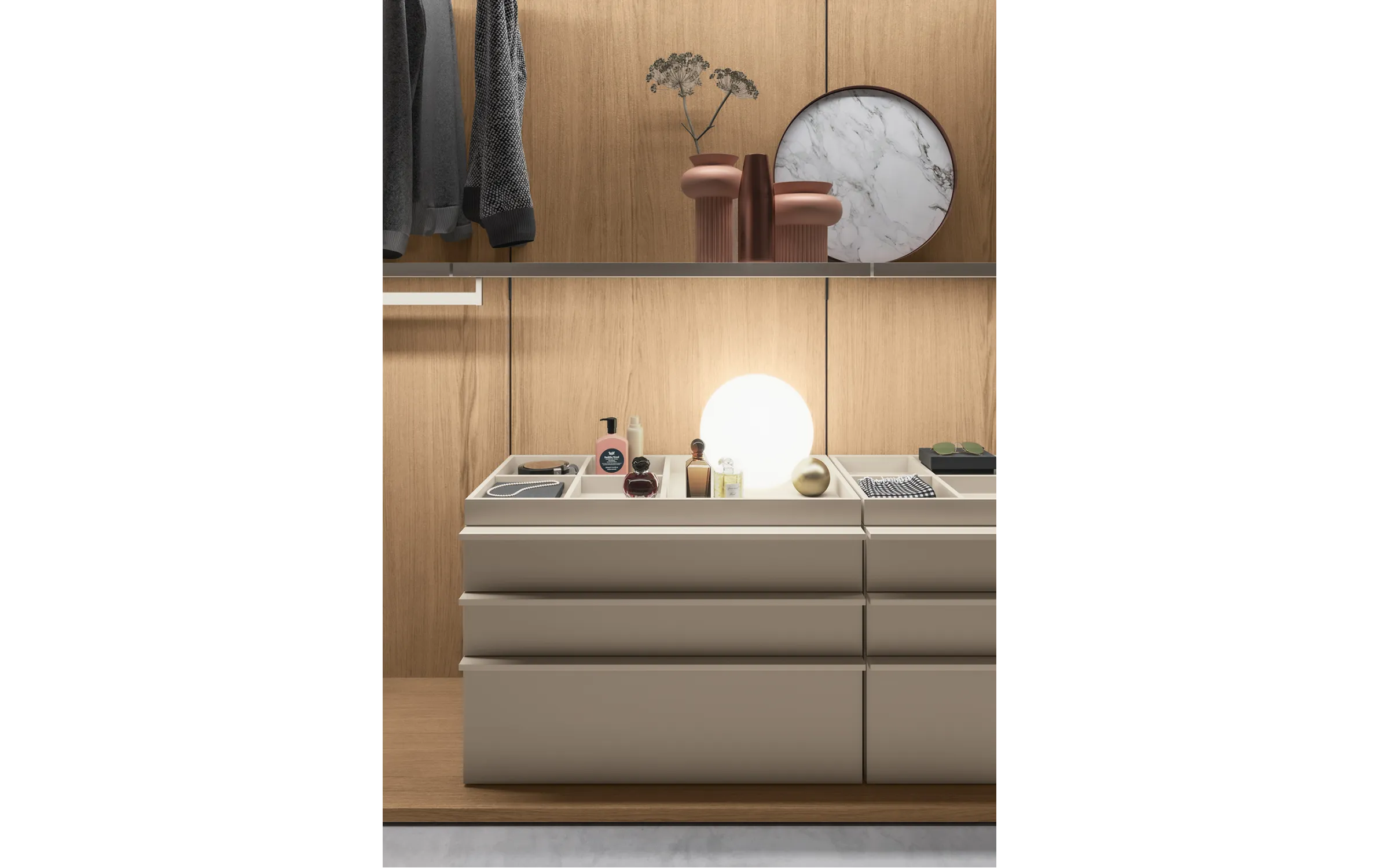 - Модульность: возможность конфигурации различных элементов, таких как полки, ящики, вешала и аксессуары, обеспечивает гибкость в организации хранения.