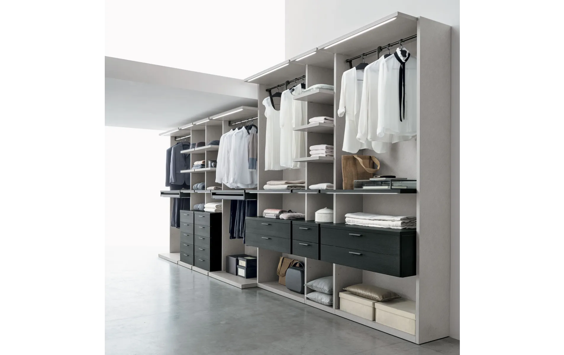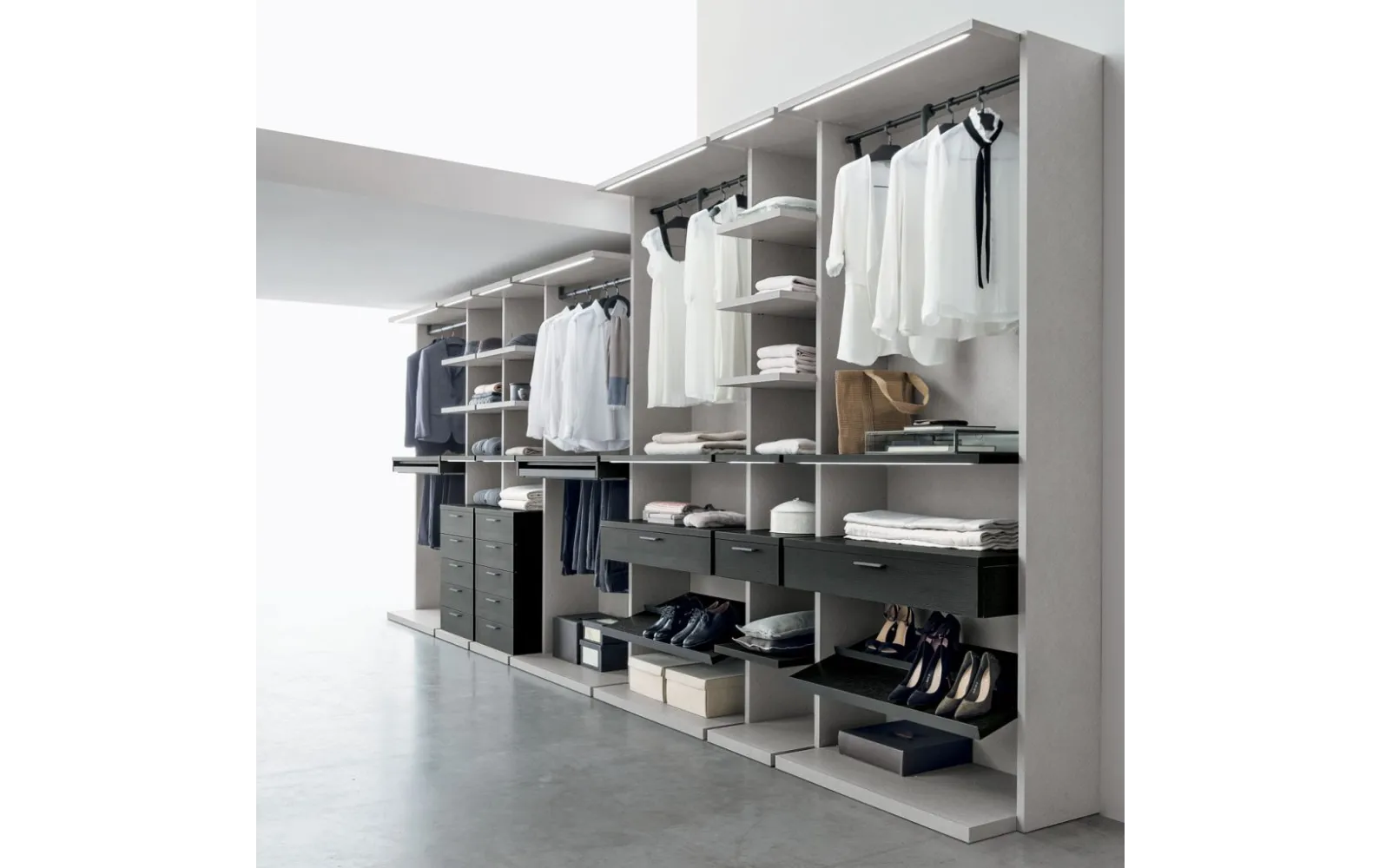 Система состоит из различных элементов: перегородок, полок, выдвижных ящиков и аксессуаров, которые можно комбинировать по вашему желанию, создавая индивидуальное решение для хранения одежды и аксессуаров. Возможность интеграции дополнительных элементов, таких как выдвижные лотки, обувные полки и зеркала, обеспечивает максимальный комфорт и удобство использования.