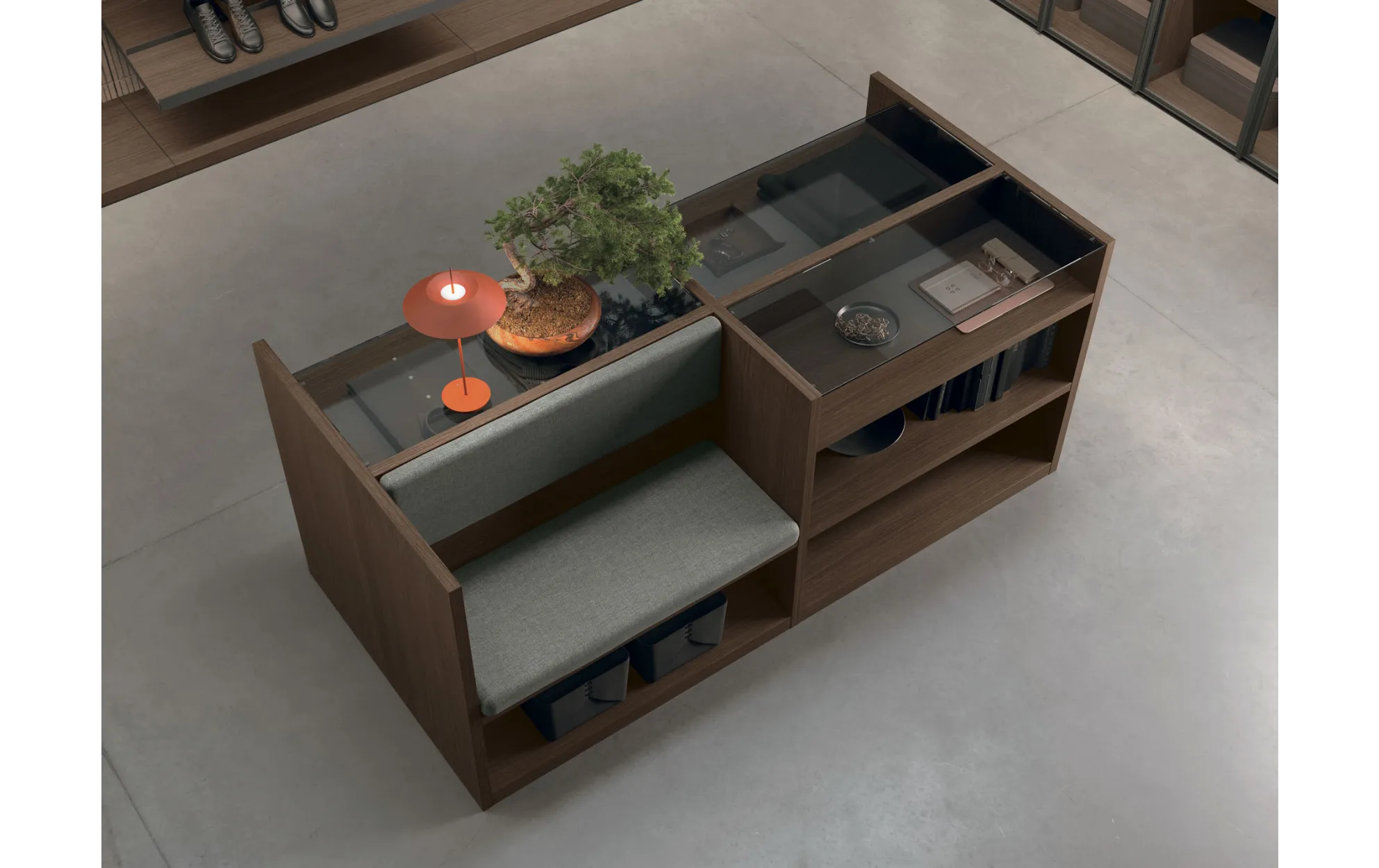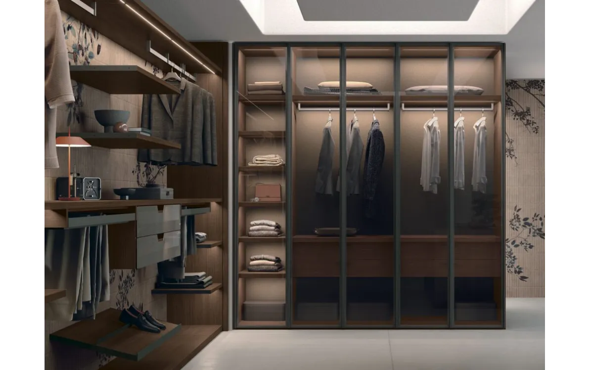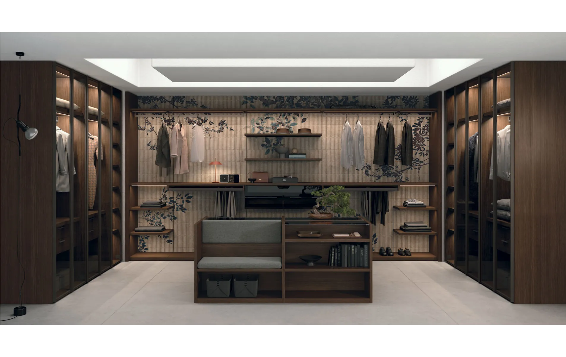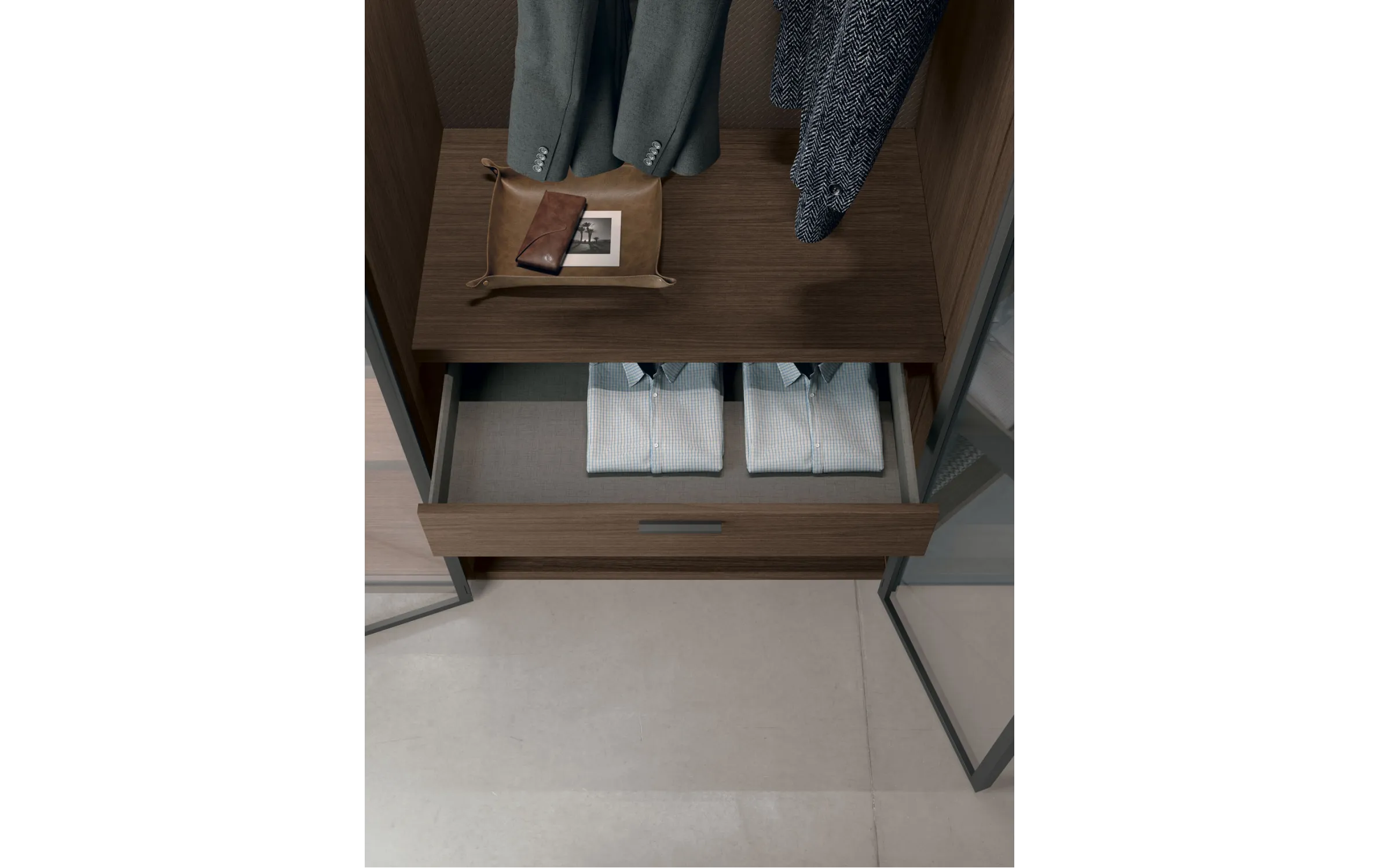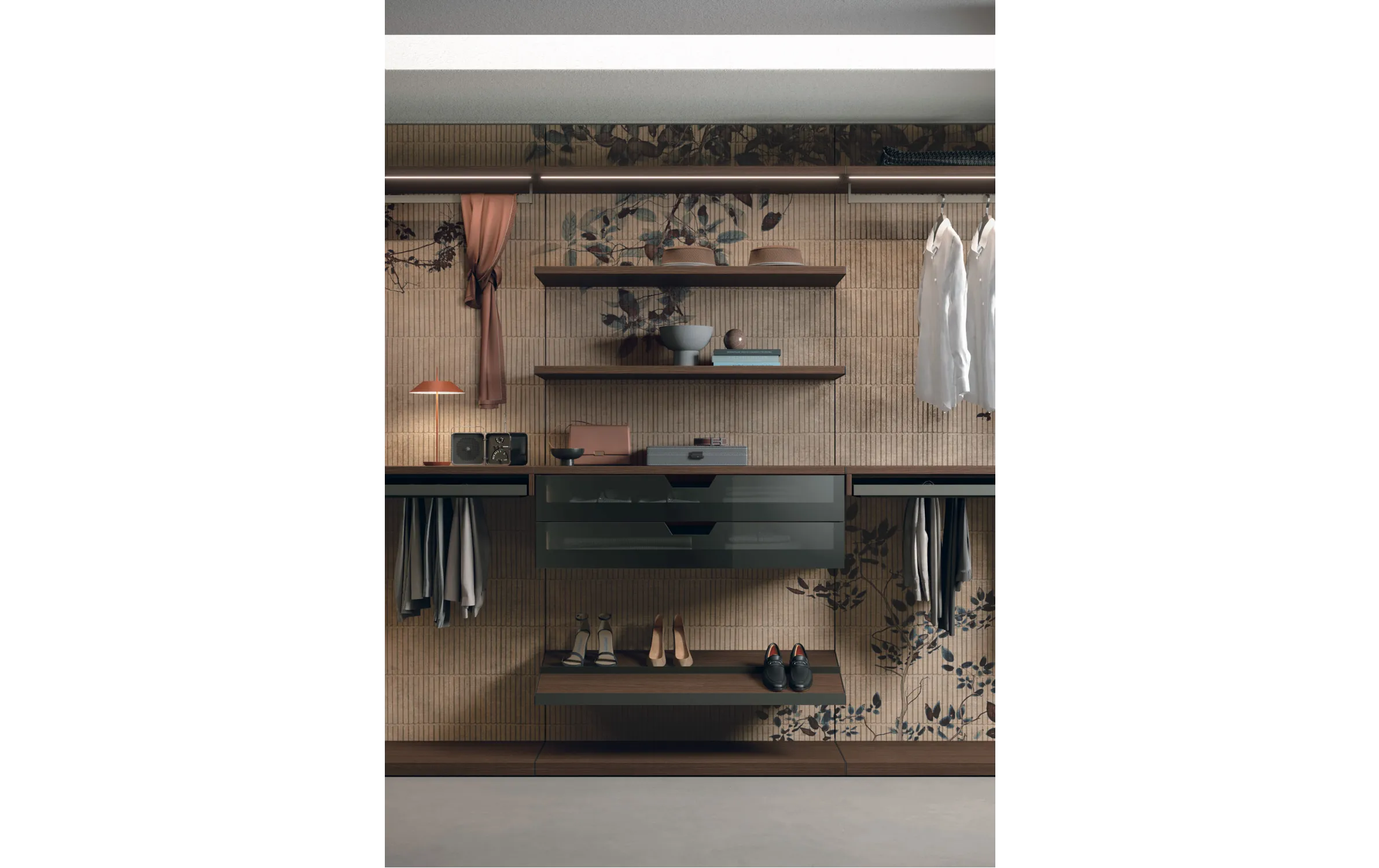 Доступна богатая палитра отделок: от благородных текстур натурального дерева до современных однотонных матовых покрытий. Система включает разнообразные модули — стационарные или выдвижные полки, ящики, вешала, лотки, а также аксессуары для хранения обуви и аксессуаров. Конструктивная лёгкость сочетается с высокой несущей способностью, благодаря чему даже при визуальной «прозрачности» система остаётся надёжной и устойчивой. Все элементы выполнены из качественных материалов с отделкой премиального уровня — дерево, металл, ламинированные и лакированные панели. Pratico создаёт ощущение архитектурной логики и простора в интерьере. Это не просто система хранения, а дизайнерский инструмент, позволяющий выстроить ваш личный ритм жизни с итальянской точностью и комфортом.