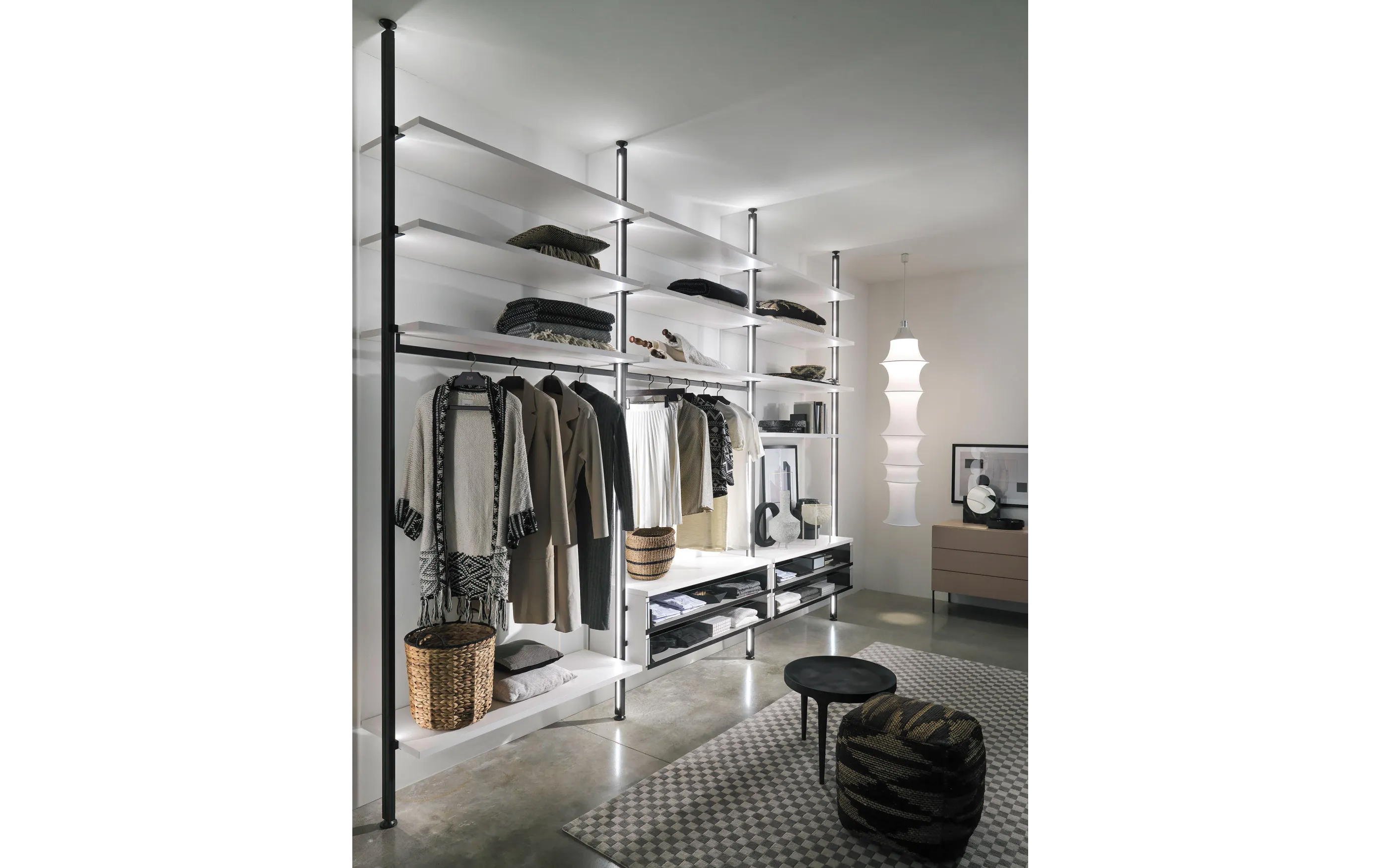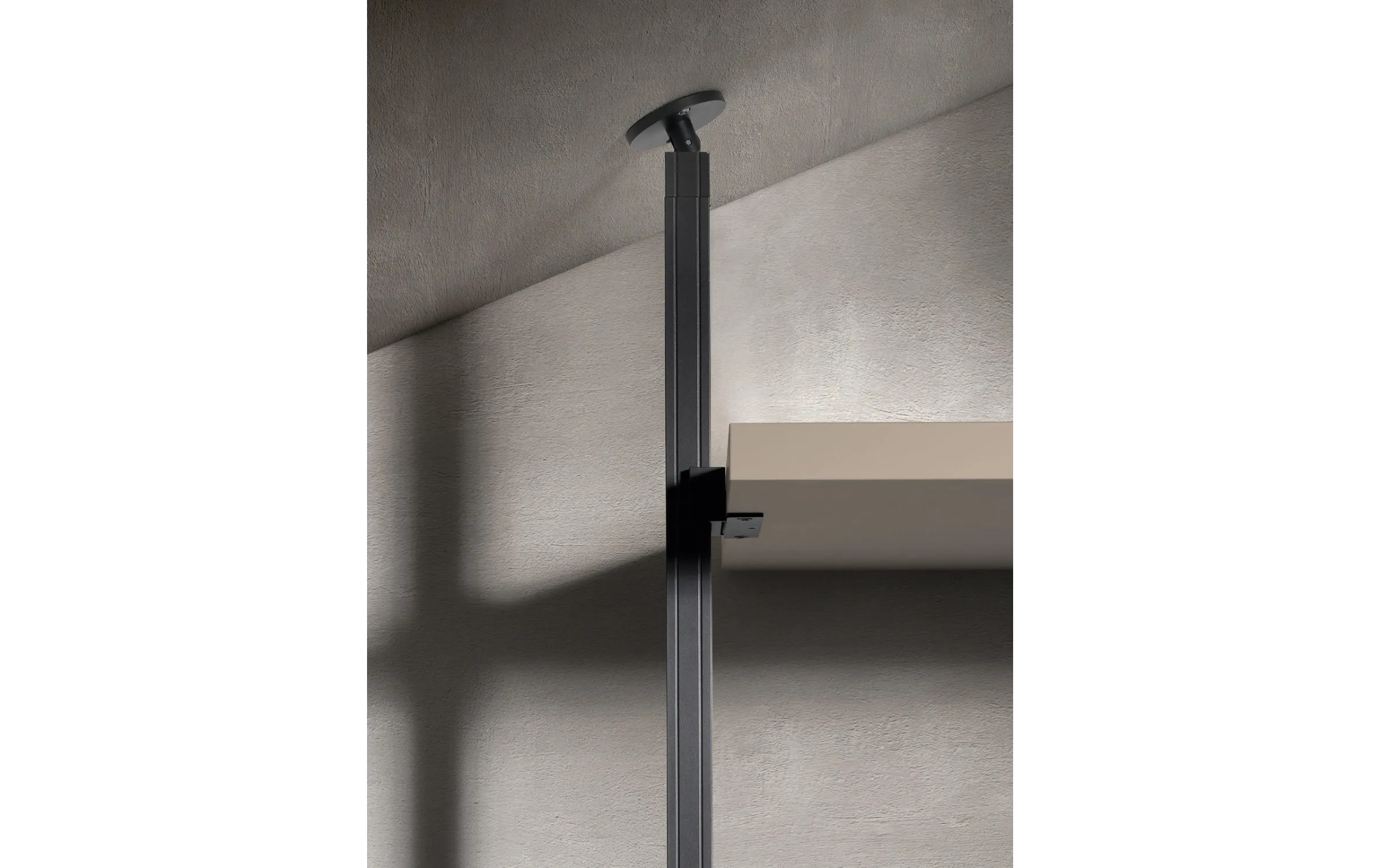 - Модульная конструкция: система состоит из напольных и потолочных стоек, которые могут быть закреплены к стене или установлены свободно, обеспечивая гибкость в планировке пространства.