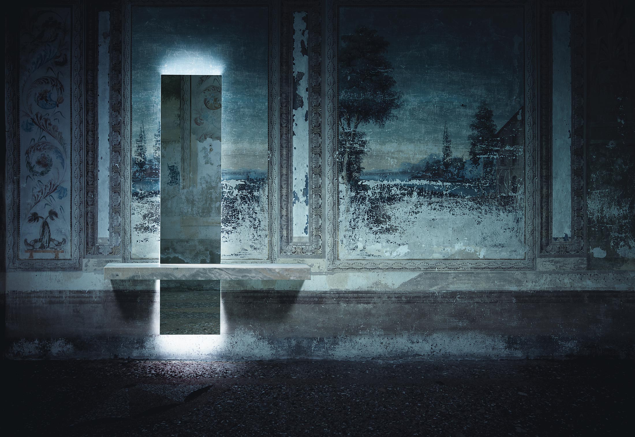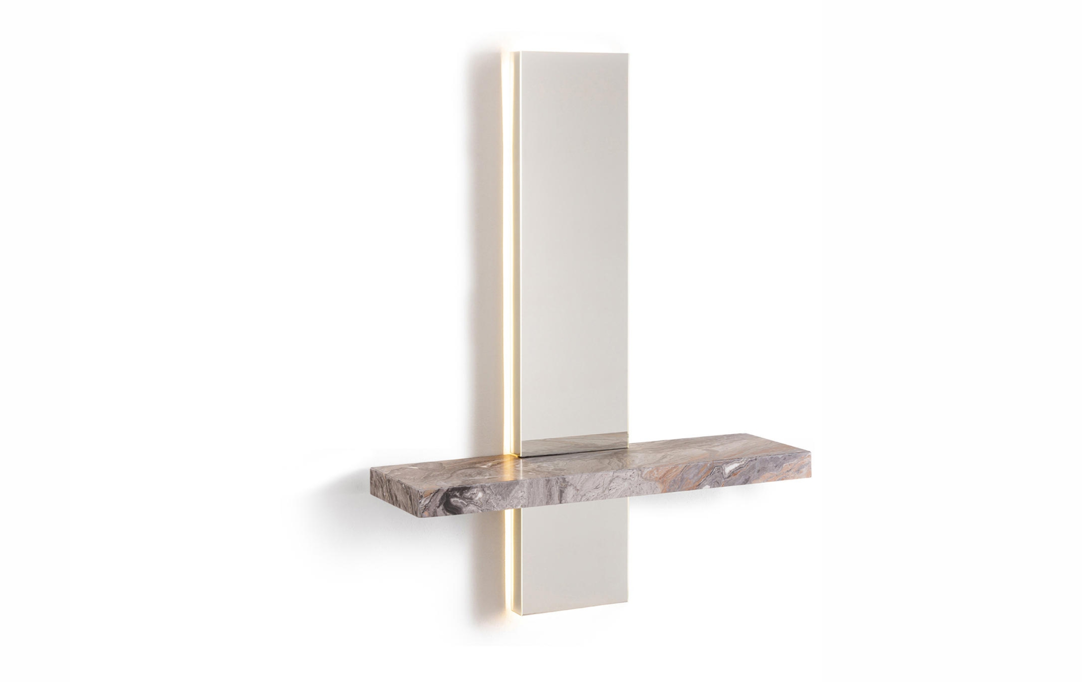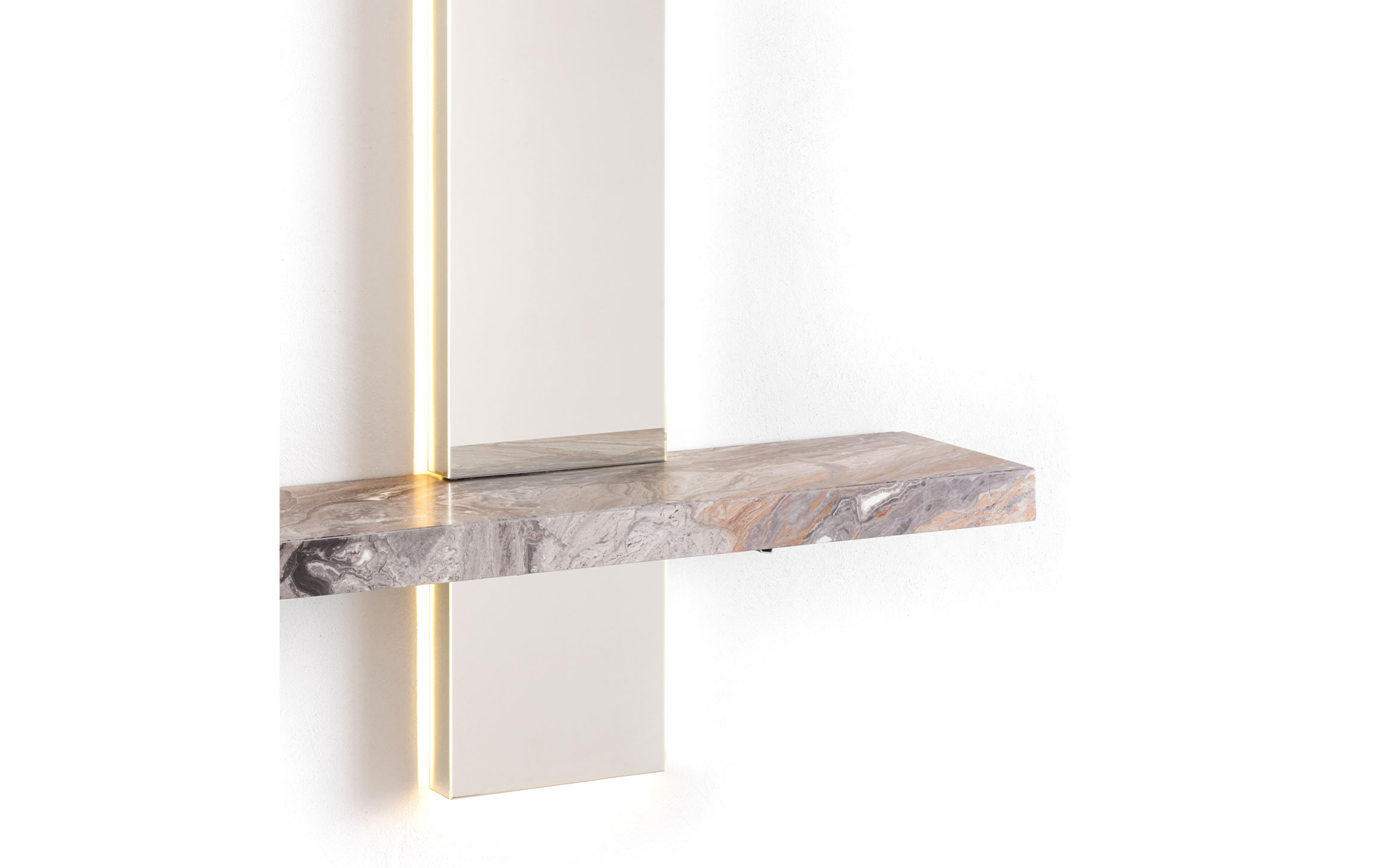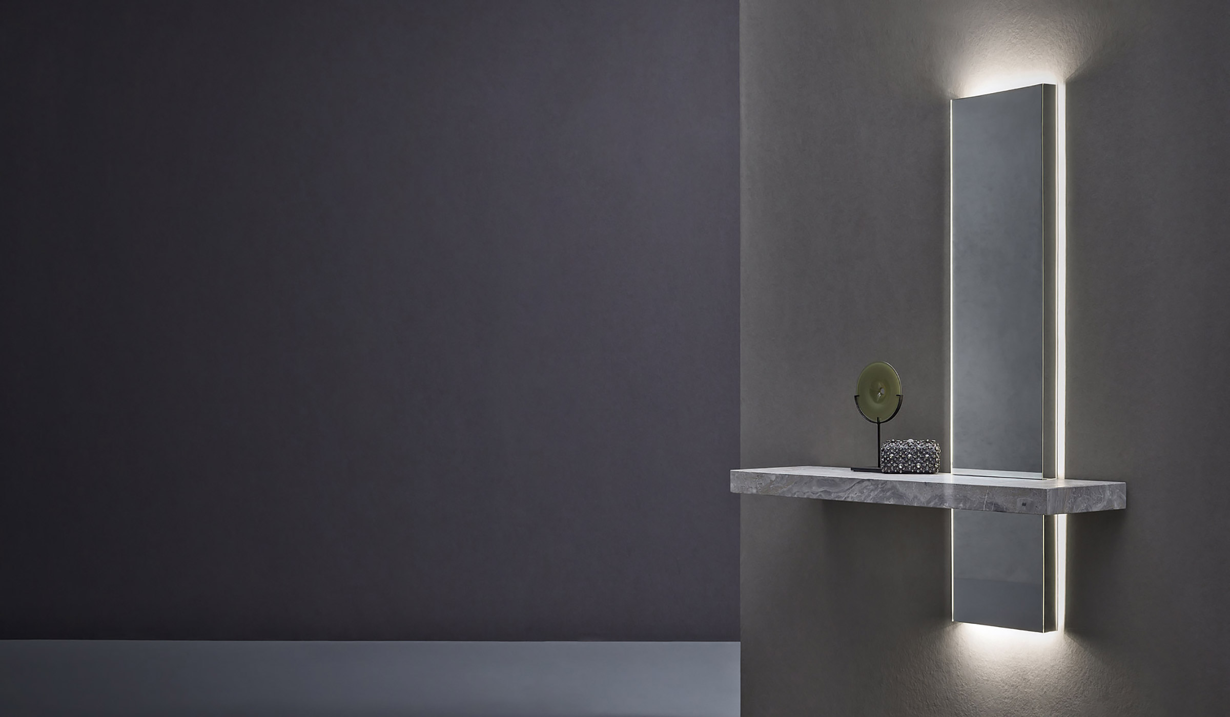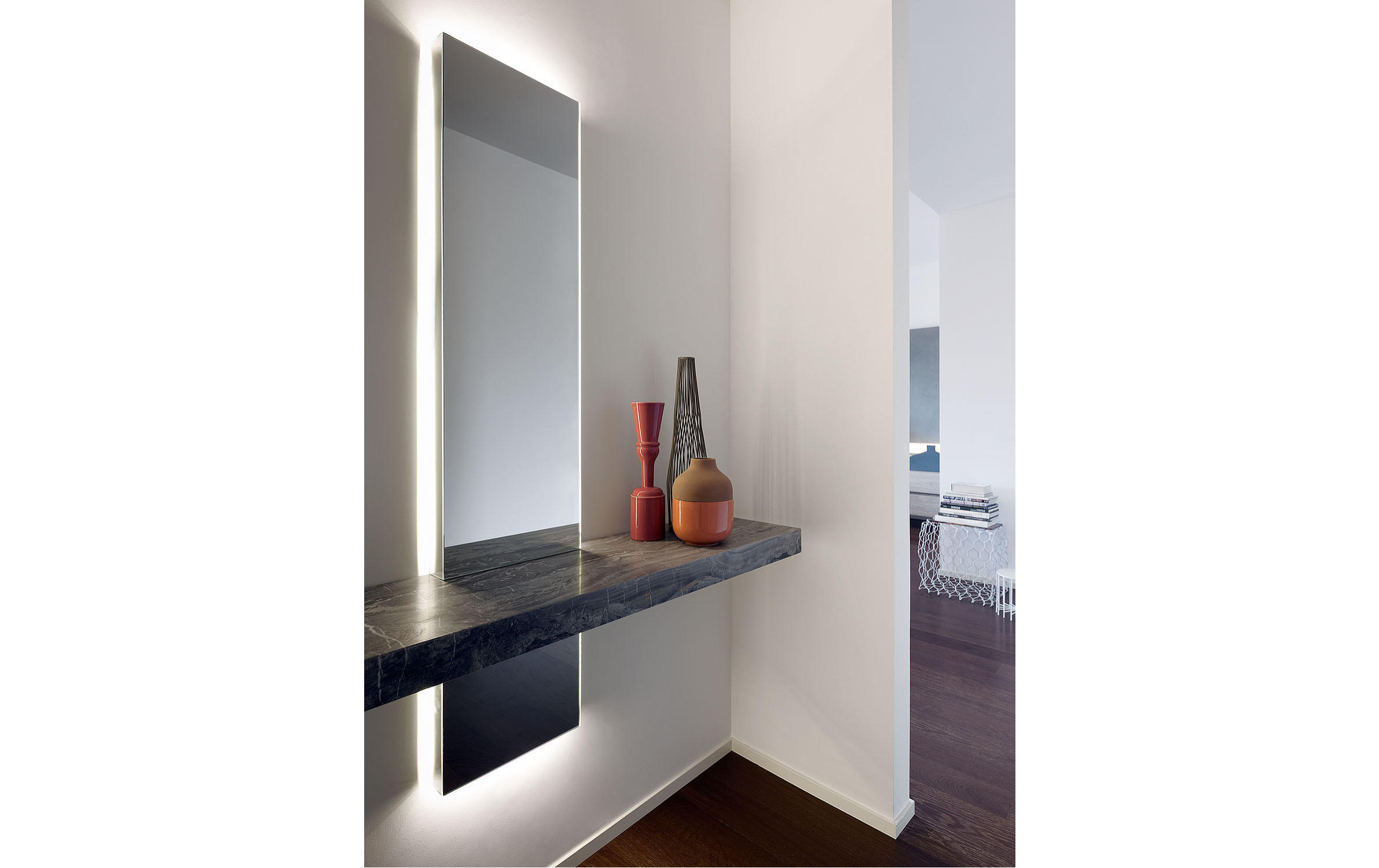Современный стиль зеркала / консоли Peak оживляет и освещает переходные зоны в доме, такие как прихожие, вестибюль и холл, которые часто игнорируются. Используемый как поверхность для размещения предметов, он также является источником света благодаря встроенным в конструкцию светодиодам. Большое прямоугольное зеркало пересекает роскошная полка из матового серого мрамора Orobico, вырезанная, чтобы подчеркнуть характерные прожилки. В качестве альтернативы полка доступна в черном или сверхпрозрачном стекле.