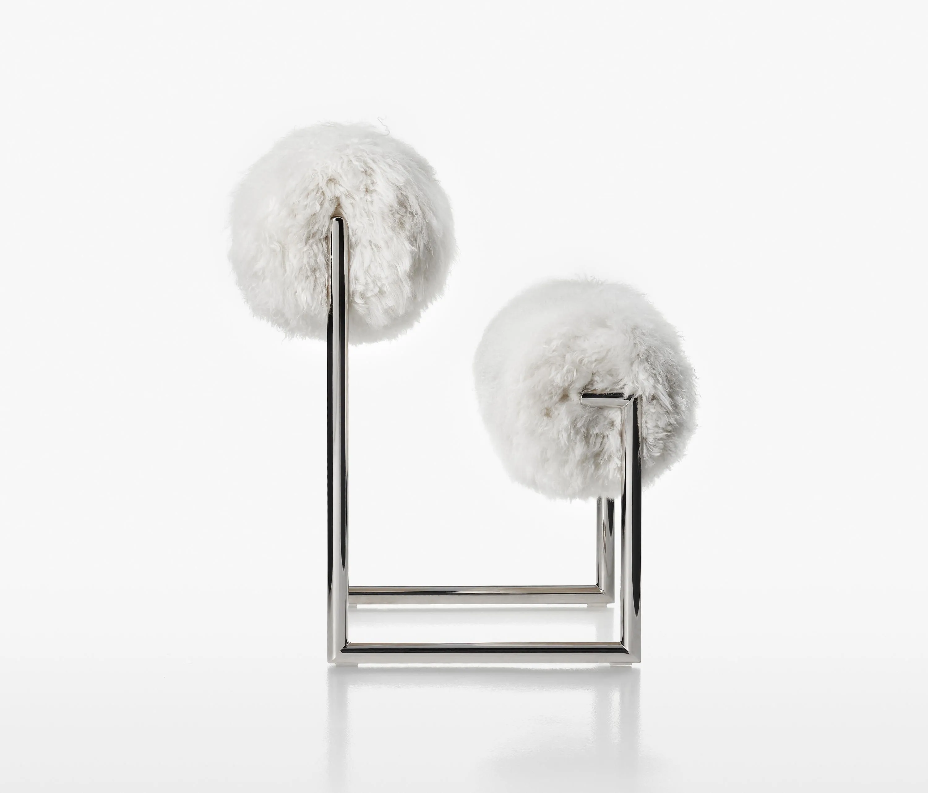 Кресло Нанды Виго, известное как Due Più, представляет собой удивительный, загадочный предмет, в котором использование двух роликов, которые выглядят так, словно они плавают, создает поистине уникальные характеристики. Футуристичный в аспекте, мы можем рассматривать его как символический дизайн, сочетающий в себе две души Виго: дух геометрии, который просвечивает сквозь минималистичную металлическую конструкцию с ее отражением света, и эксцентричный, новаторский дух, проявляющийся в использовании монгольского меха. В настоящее время представлен Acerbis со стальным каркасом и мехами, переработанными из отходов пищевой промышленности, в соответствии с принципами круговой экономики, которые делают его совместимым с современной этикой.
