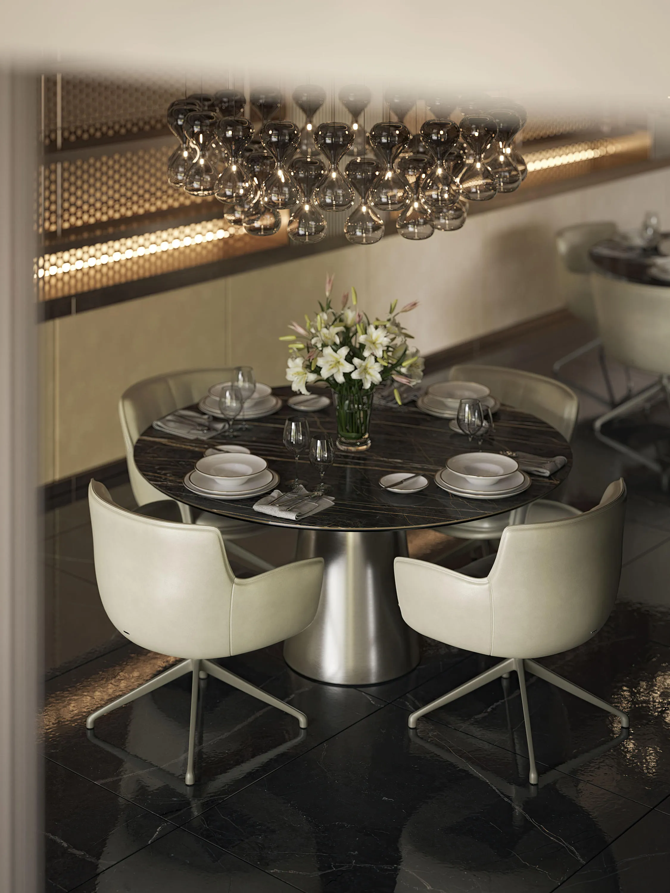 Округлые формы кресел и табуретов семейства Rhonda излучают естественную элегантность, что делает их идеальными для оформления удобных и гостеприимных дизайнерских столовых. Мягкие складки, украшающие внутреннюю часть спинки, контрастируют с растянутым каркасом, который облегает тело.