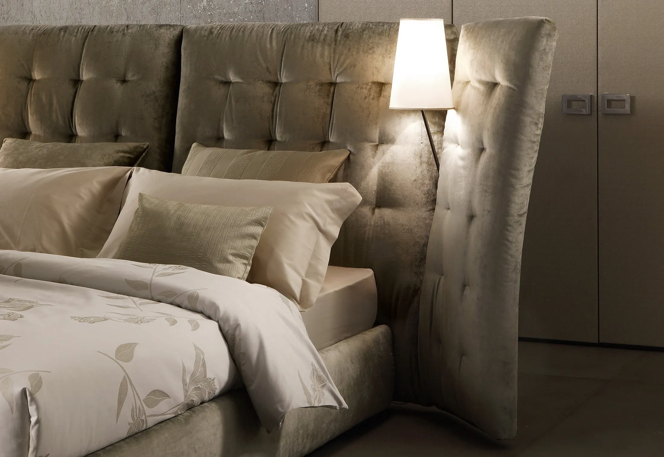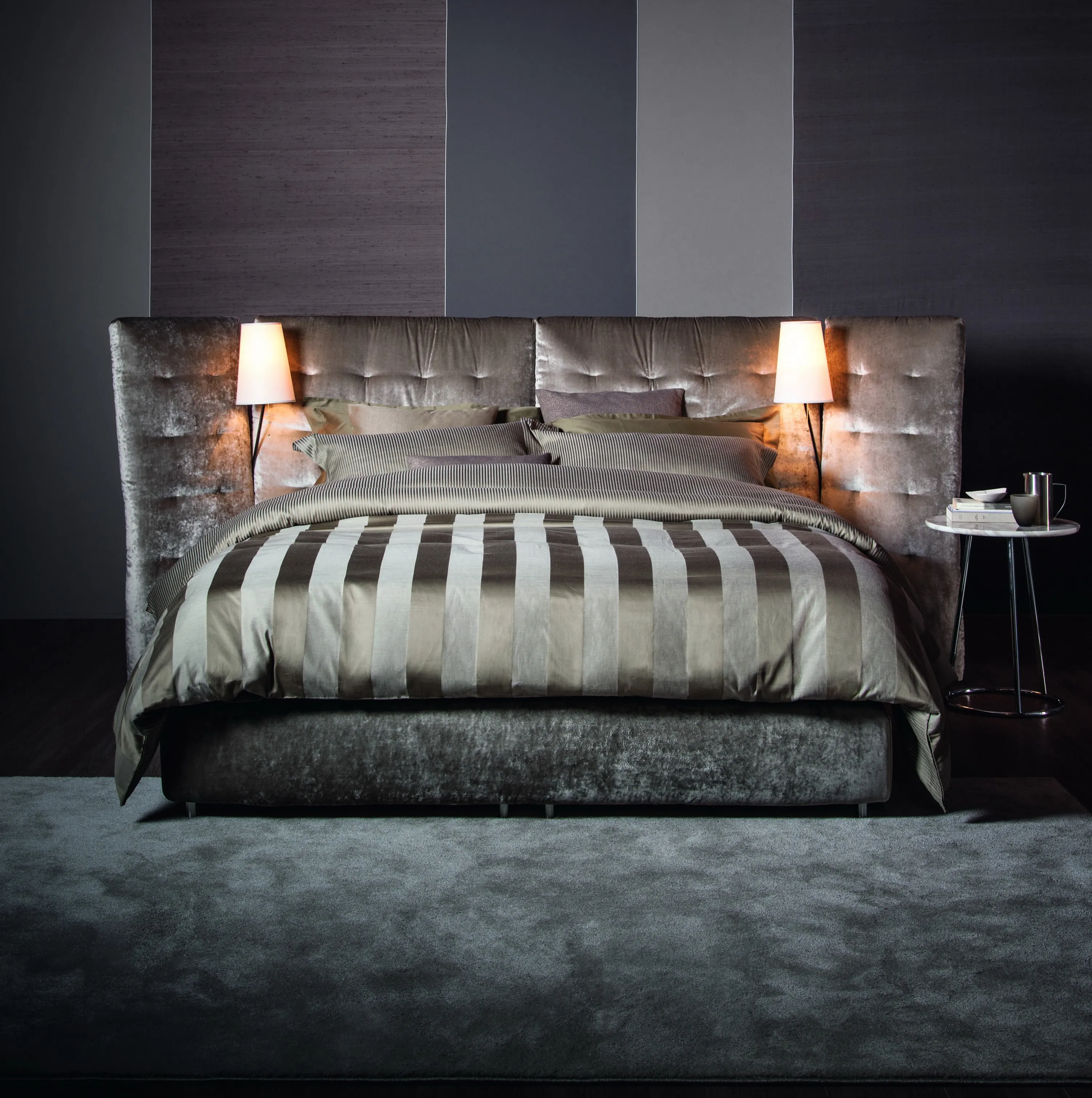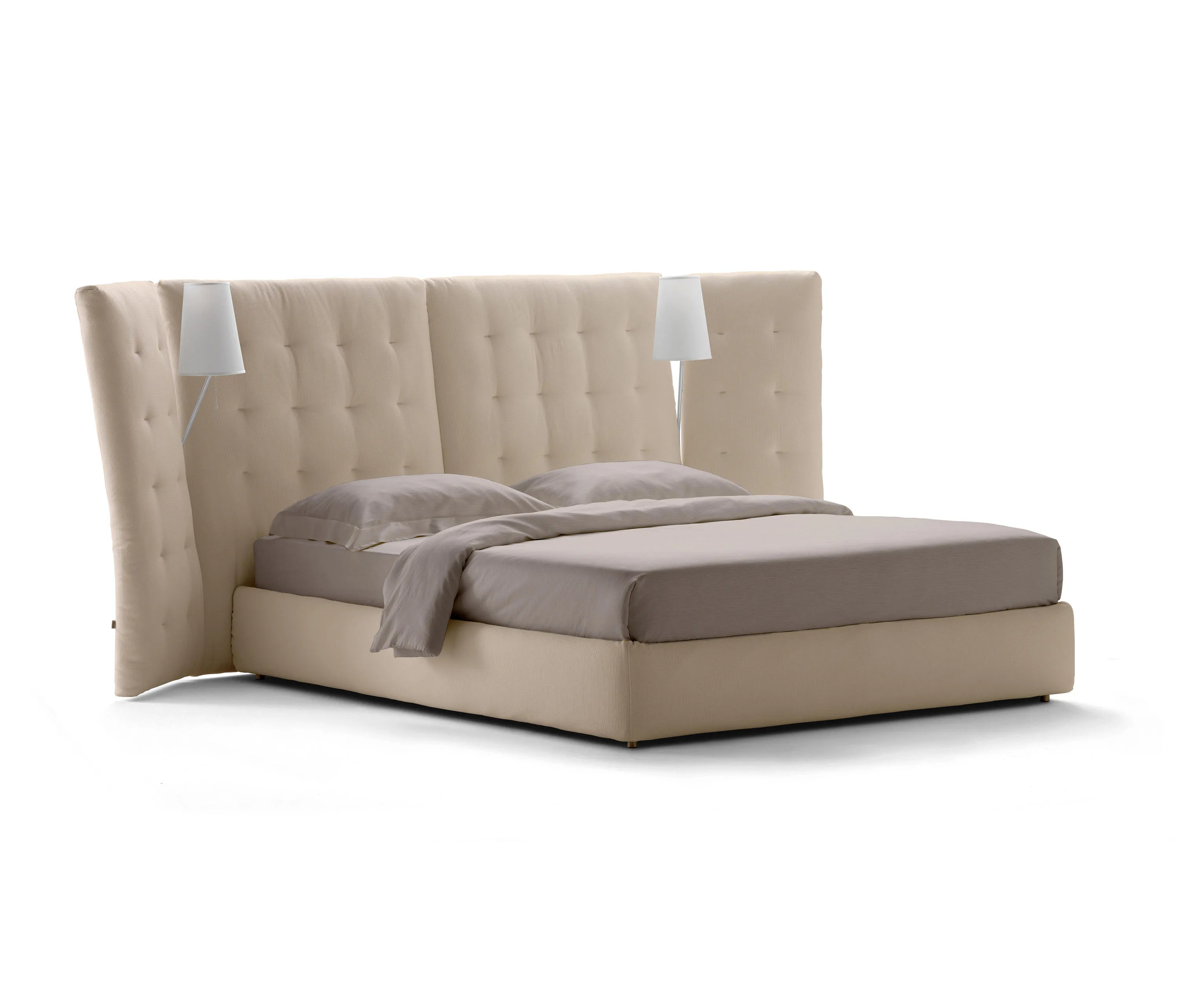 Двуспальная кровать с впечатляющими линиями, доступная в версиях с простым изголовьем или с боковыми панелями. Мягкое и стеганое изголовье с полностью съемными чехлами из ткани или кожи. Поставляется с пружинным основанием Comfort, фиксированным основанием h 25 с,; складским основанием или основанием с электрическими механизмами. Две лампы Angle с полированной хромированной, золотой или бронзовой трубчатой структурой могут быть установлены в выемке на пересечении между изголовьем и панелями кровати Angle с боковыми панелями.