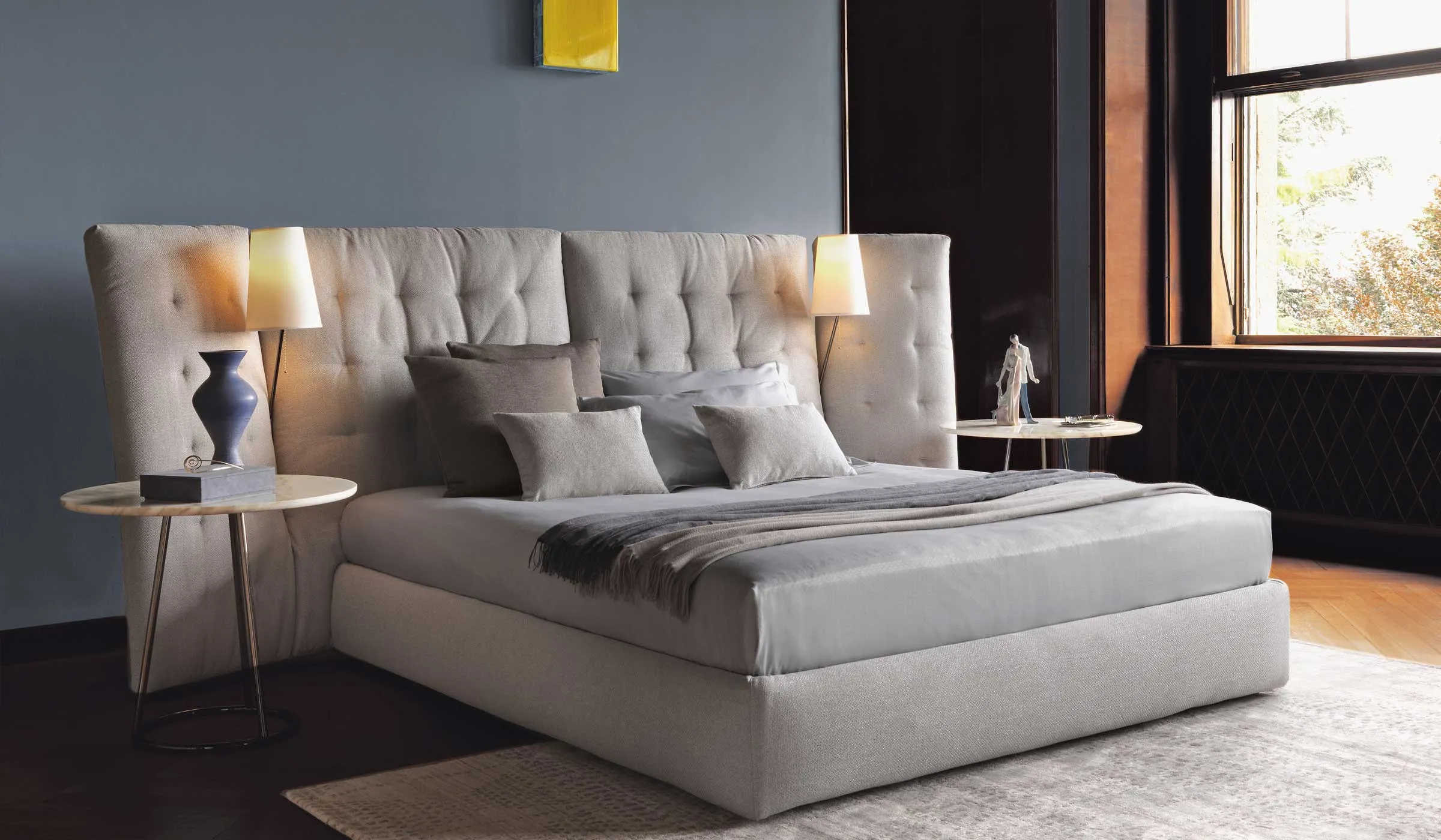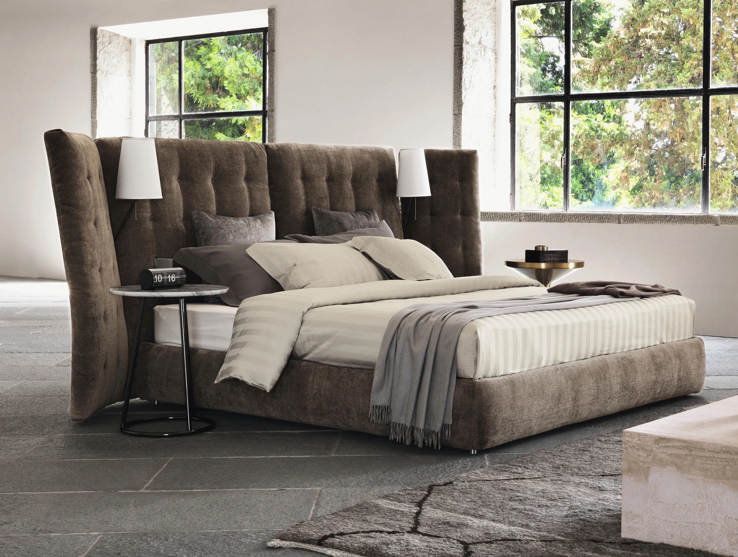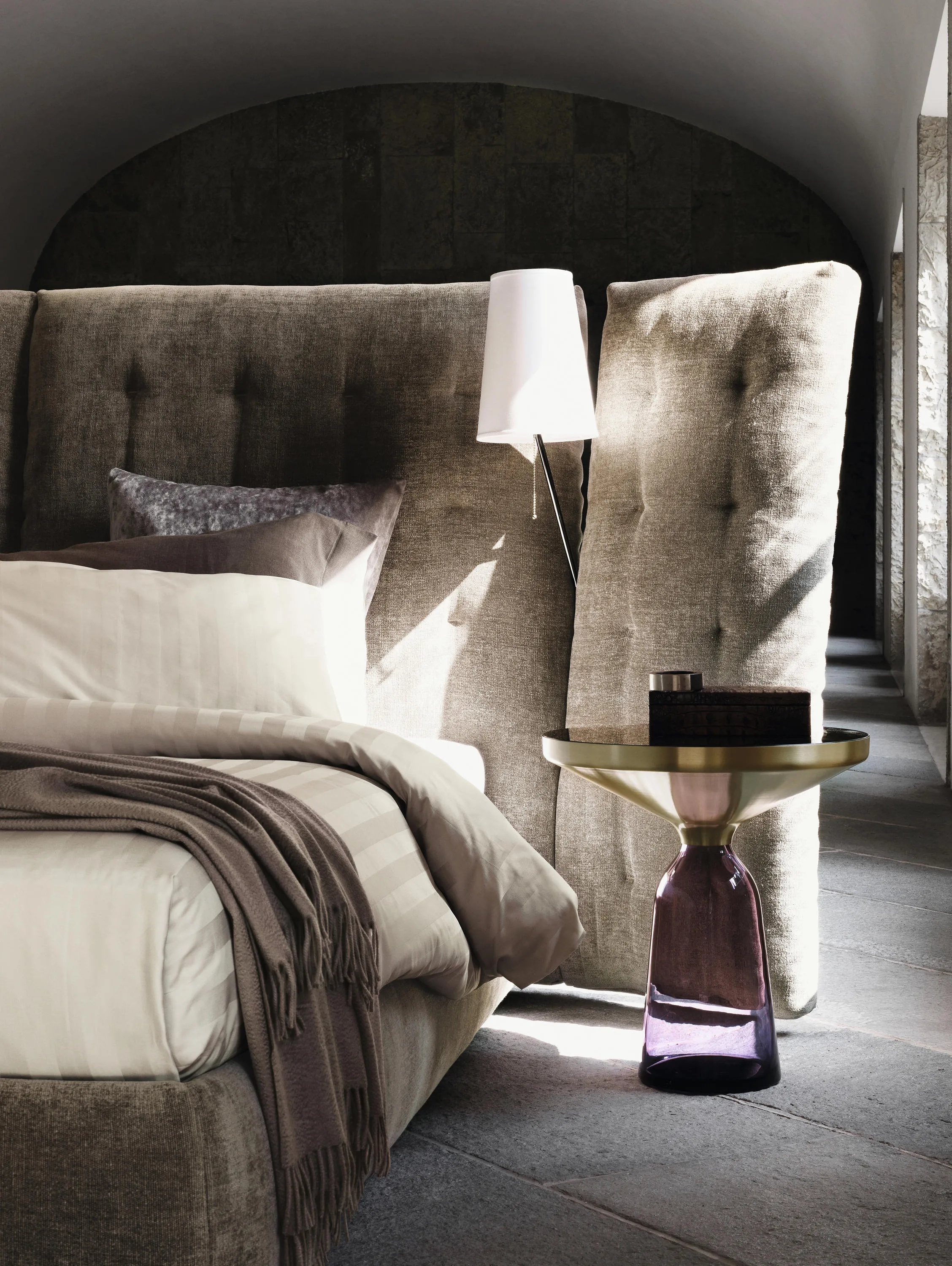 Двуспальная кровать с впечатляющими линиями, доступная в версиях с простым изголовьем или с боковыми панелями. Мягкое и стеганое изголовье с полностью съемными чехлами из ткани или кожи. Поставляется с пружинным основанием Comfort, фиксированным основанием h 25 с,; складским основанием или основанием с электрическими механизмами. Две лампы Angle с полированной хромированной, золотой или бронзовой трубчатой структурой могут быть установлены в выемке на пересечении между изголовьем и панелями кровати Angle с боковыми панелями.