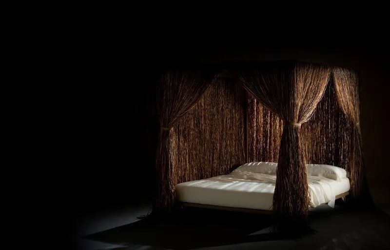 Незабываемая, чувственная и загадочная кровать CABANA от итальянского бренда Edra, выполненная в стиле туземных хижин. В основании этой удобной кровати – металлическая труба, окрашенная и покрытая синтетической вуалью из рафии. Рафия- натуральное волокно, которое производят из листьев пальмы Raphia farinifera.Волокно получается мягким, пластичным и не ломким. При этом рафия довольно эластична и прочна — её можно скручивать, сплетать или завязывать в узлы. Рафия устойчива к воздействию влаги, от воды не размокая, но расправляясь (исчезает её гофрированная структура) и становясь более прозрачной. Естественный цвет рафии — светло-бежевый. Её красят натуральными и искусственными красителями в любые цвета. Кожаные ремешки с магнитными зажимами регулируют и фиксируют драпировку материала.