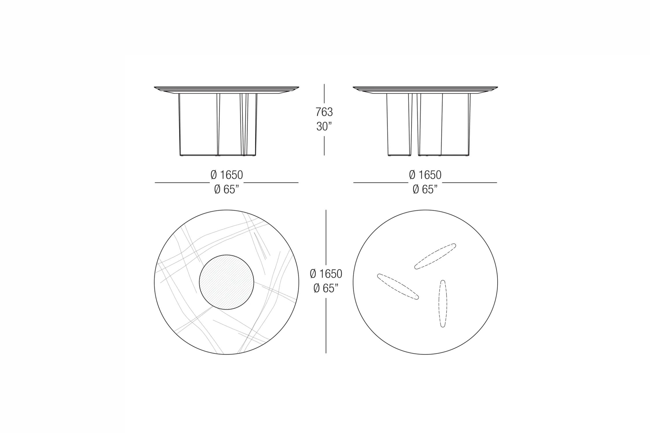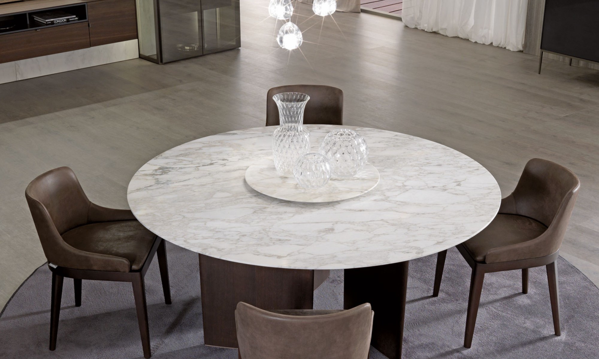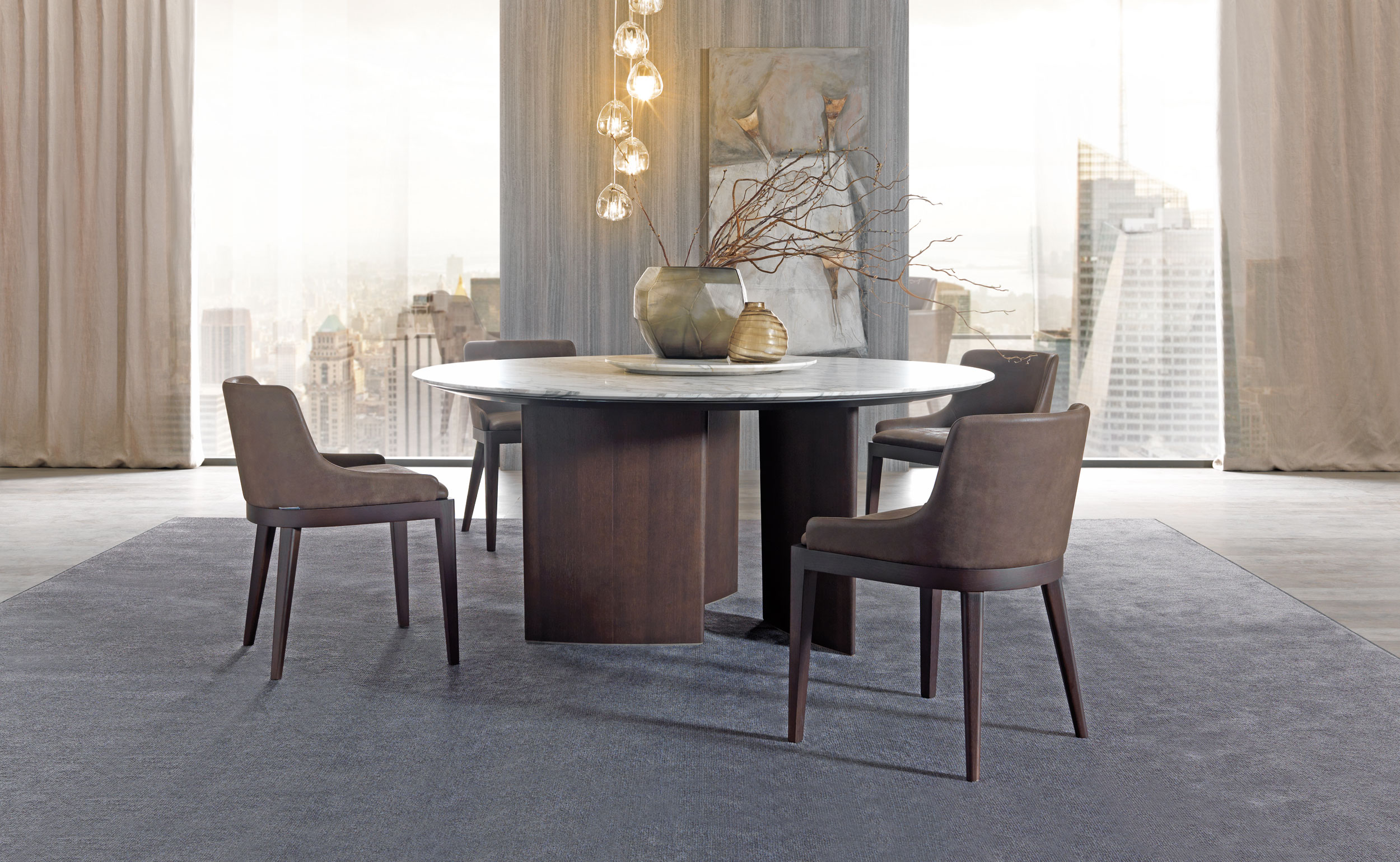 Столы с деревянным основанием, облицованным шпоном или покрытым матовым лаком. Литая столешница доступна в двух вариантах: овальная столешница доступна в мраморной столешнице во всех вариантах или из прозрачного стекла. Круглая столешница из формованного мрамора и нижняя часть из формованного дерева с той же отделкой, что и основание. Для круглой столешницы доступна дополнительная вращающаяся формованная столешница из мрамора (Lazy Susan), доступная в двух размерах.
