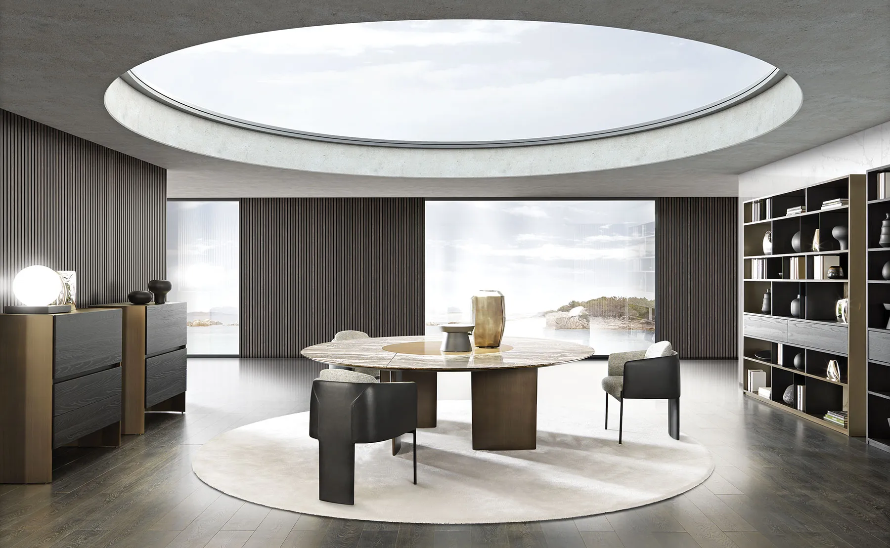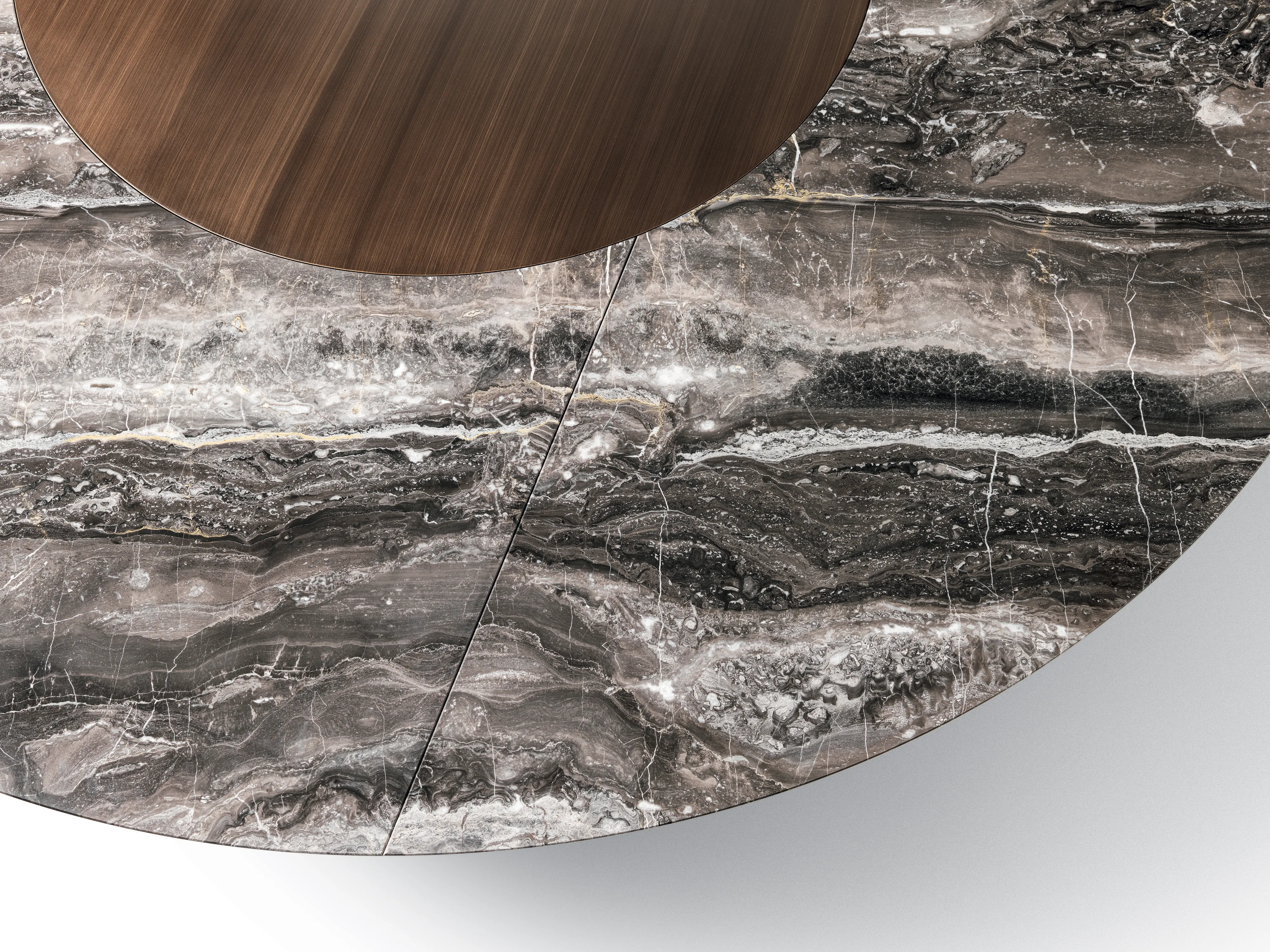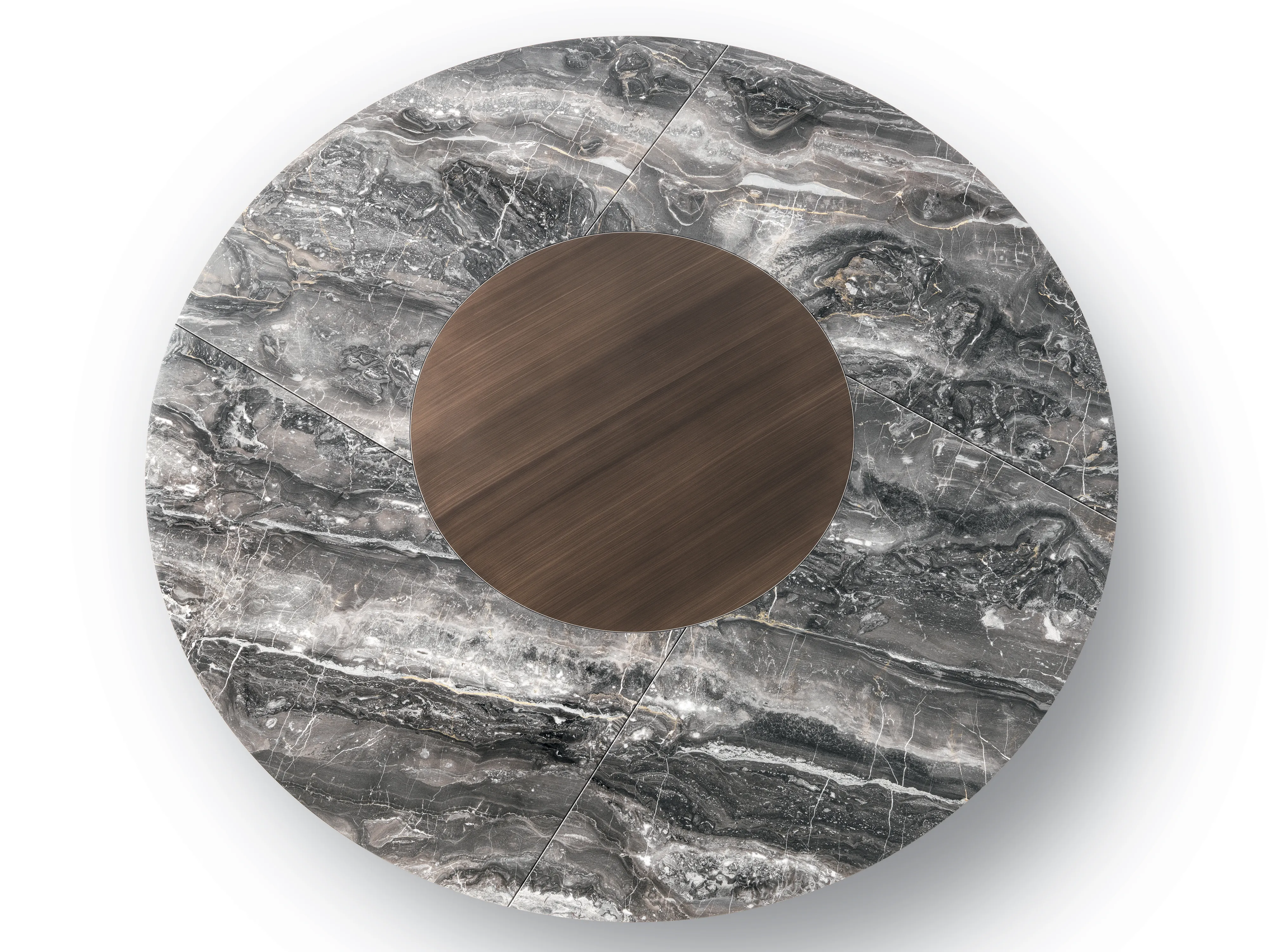 Столы с деревянным основанием, облицованным шпоном или покрытым матовым лаком. Литая столешница доступна в двух вариантах: овальная столешница доступна в мраморной столешнице во всех вариантах или из прозрачного стекла. Круглая столешница из формованного мрамора и нижняя часть из формованного дерева с той же отделкой, что и основание. Для круглой столешницы доступна дополнительная вращающаяся формованная столешница из мрамора (Lazy Susan), доступная в двух размерах.