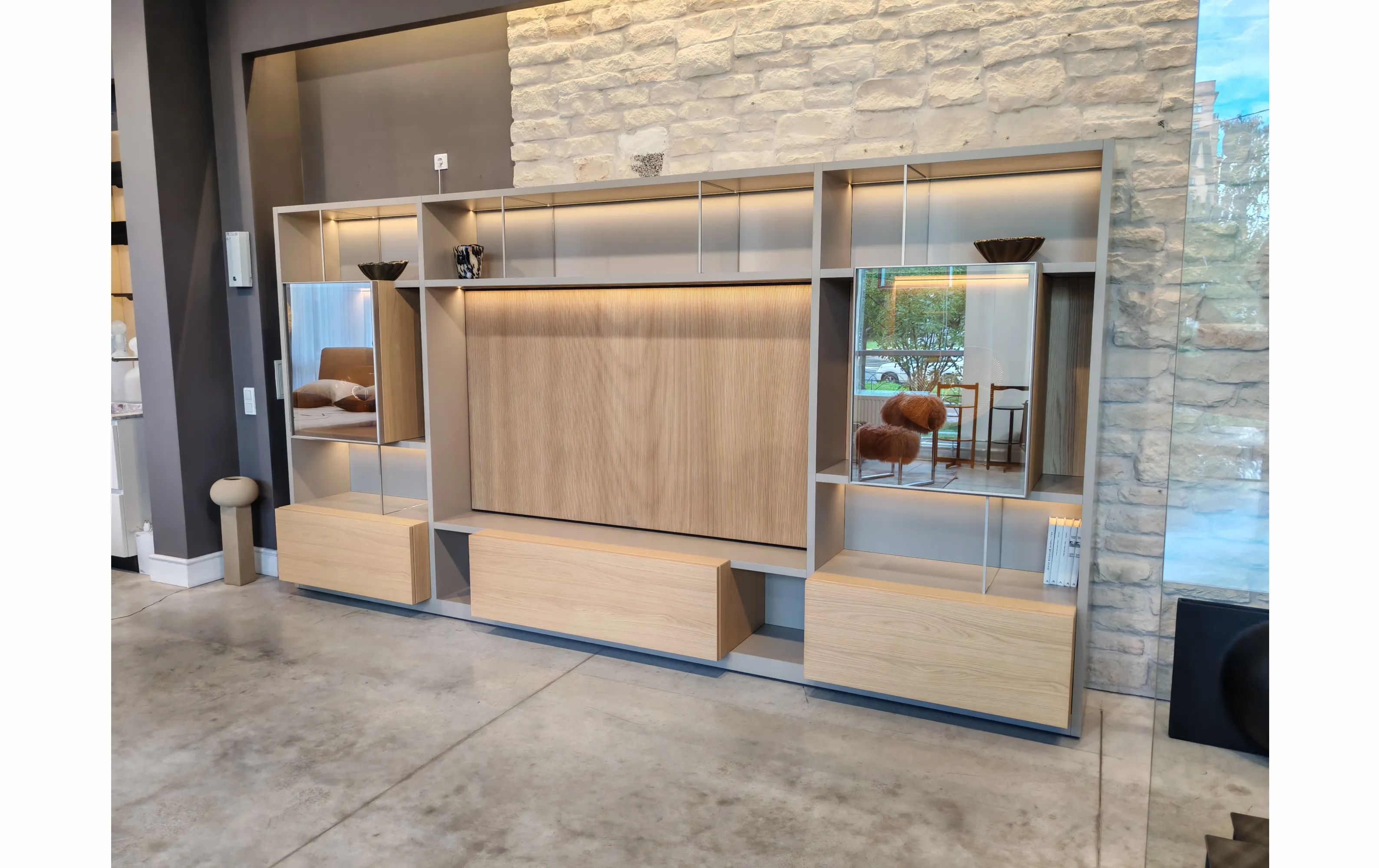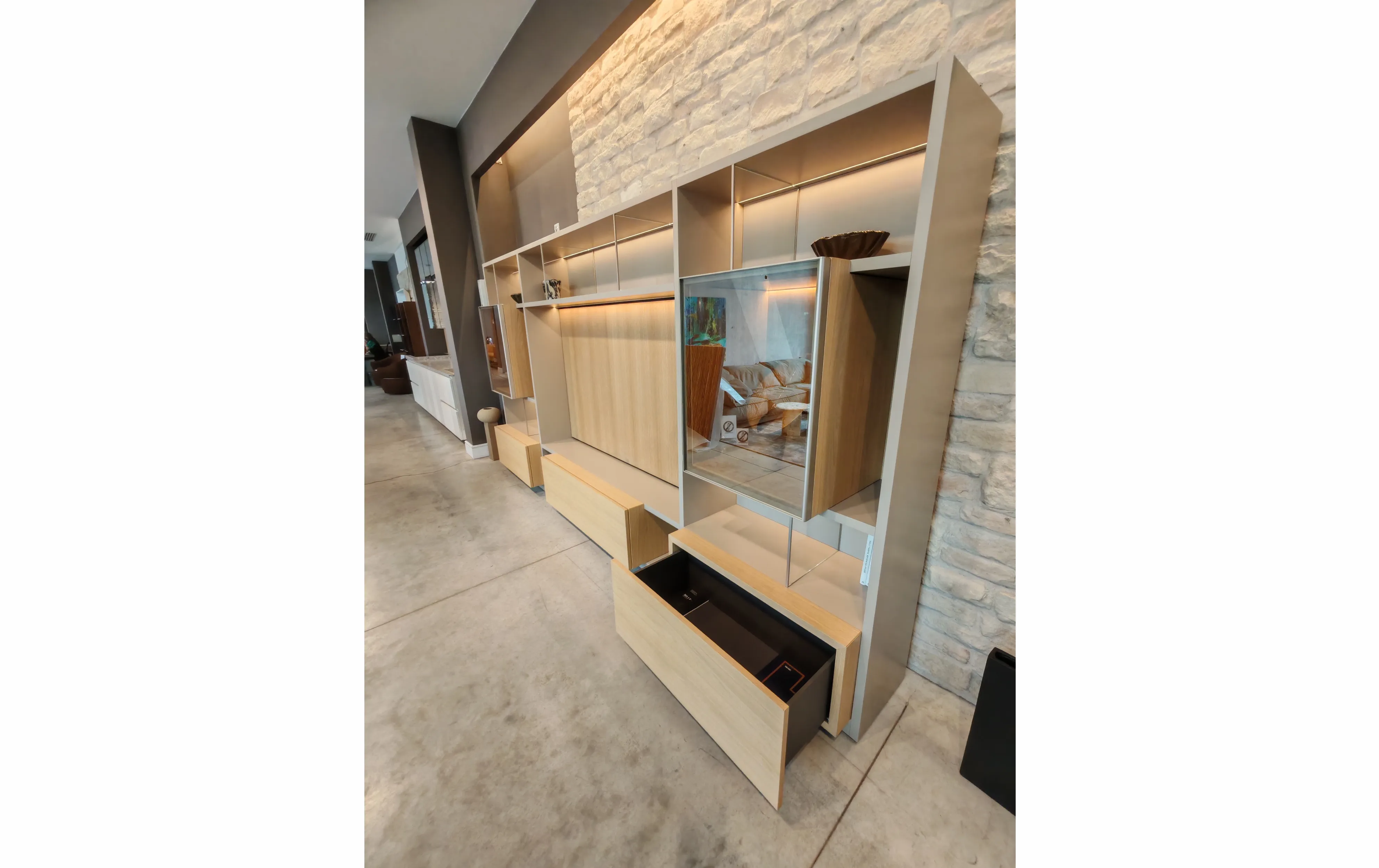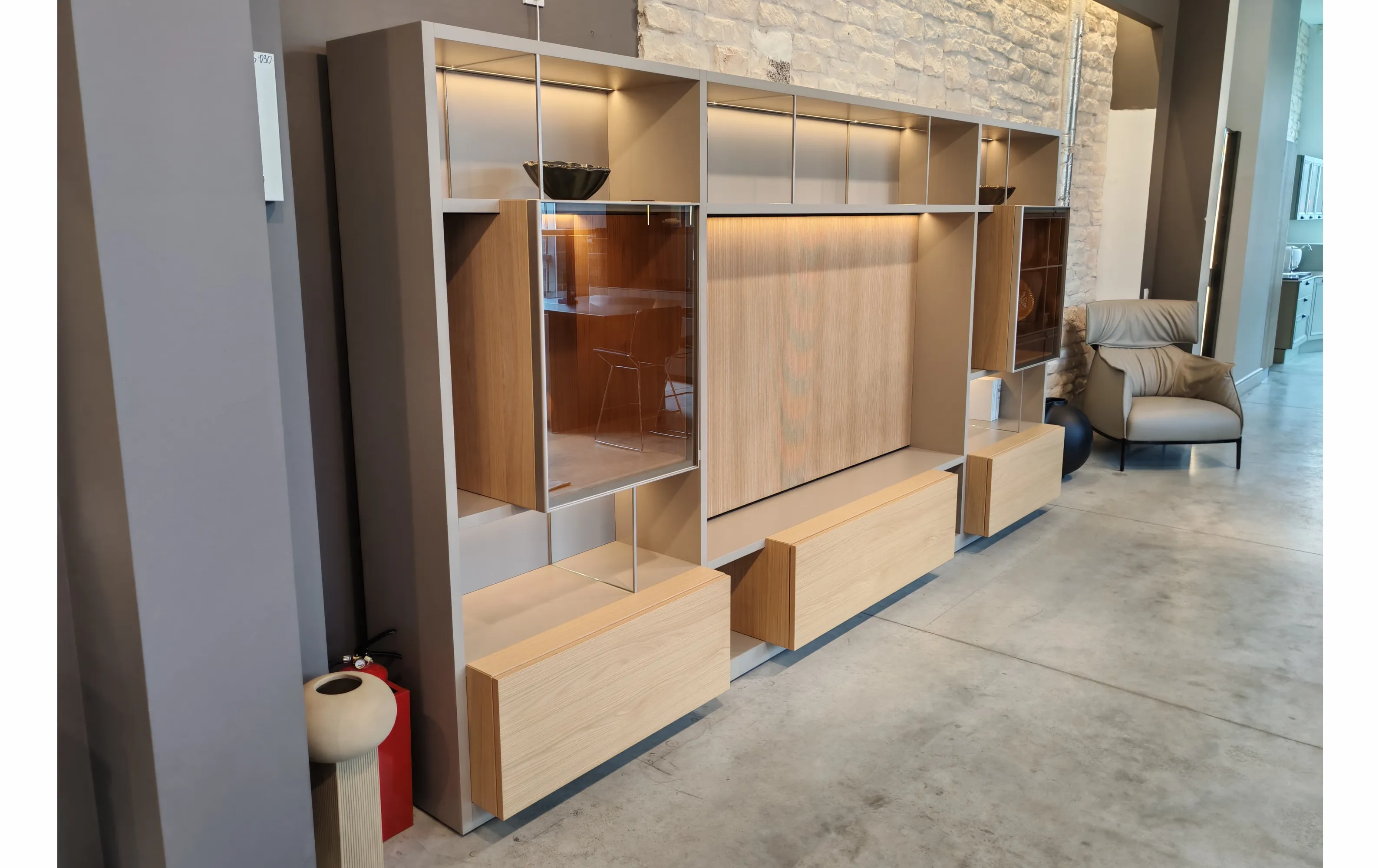 Система 505 Up, созданная с учетом индивидуальных предпочтений, выходит за рамки традиционных функций книжного шкафа. Примером тому служит инновационный выступающий шкаф Display, который повышает композиционную и стилистическую гибкость. Шкафы Display выполнены в шпоне светлого дуба. Дверца из закаленного стекла STOPSOL толщиной 5 мм. с объемной рамой из окрашенного экструдированного алюминия. Шкаф со стеклянной дверцей подсвечен встроенной, горизонтальной Led подсветкой. Выступающий элемент Display, так же представлен в нижней части композиции, как просторное место для хранения с откидной, деревянной дверью и удобными выдвижными ящиками.