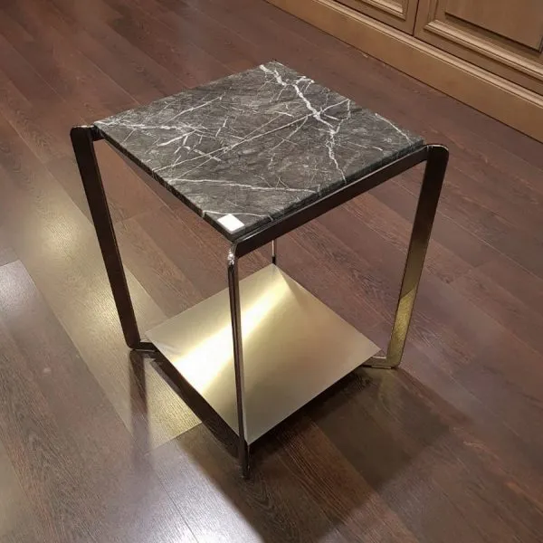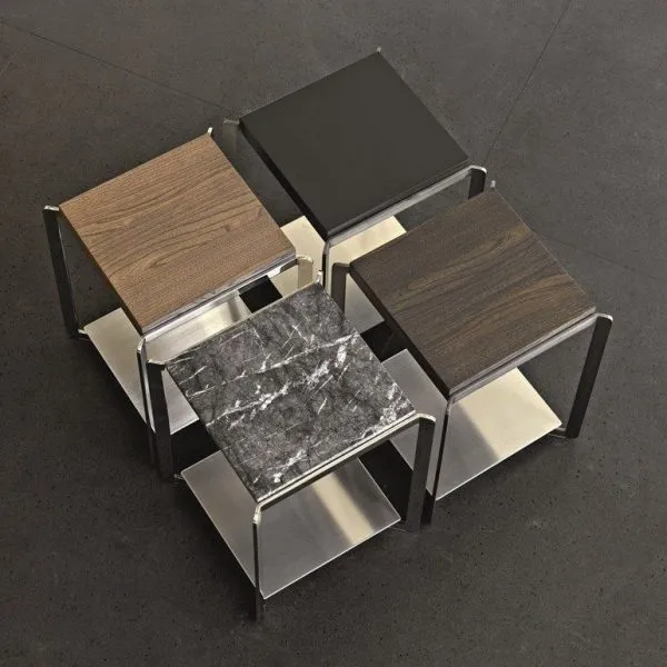 Журнальный столик Portfolio итальянской фабрики Molteni & C – элегантная модель в современном стиле, способная украсить любой домашний, офисный или общественный интерьер. Небольшие по размеру столики квадратной формы можно составить в единую композицию, или использовать отдельно. Для заказа также доступен вариант прямоугольной консоли. Фигурно вырезанный лазером стальной каркас (хромированная или оловянная отделка) прочно удерживает двойную столешницу, которая может быть выполнена из древесины (эвкалипт; дуб; вяз), мрамора (White Carrara, Emperador Dark или Black Marquina) или покрыта матовым лаком (возможны различные варианты цвета).