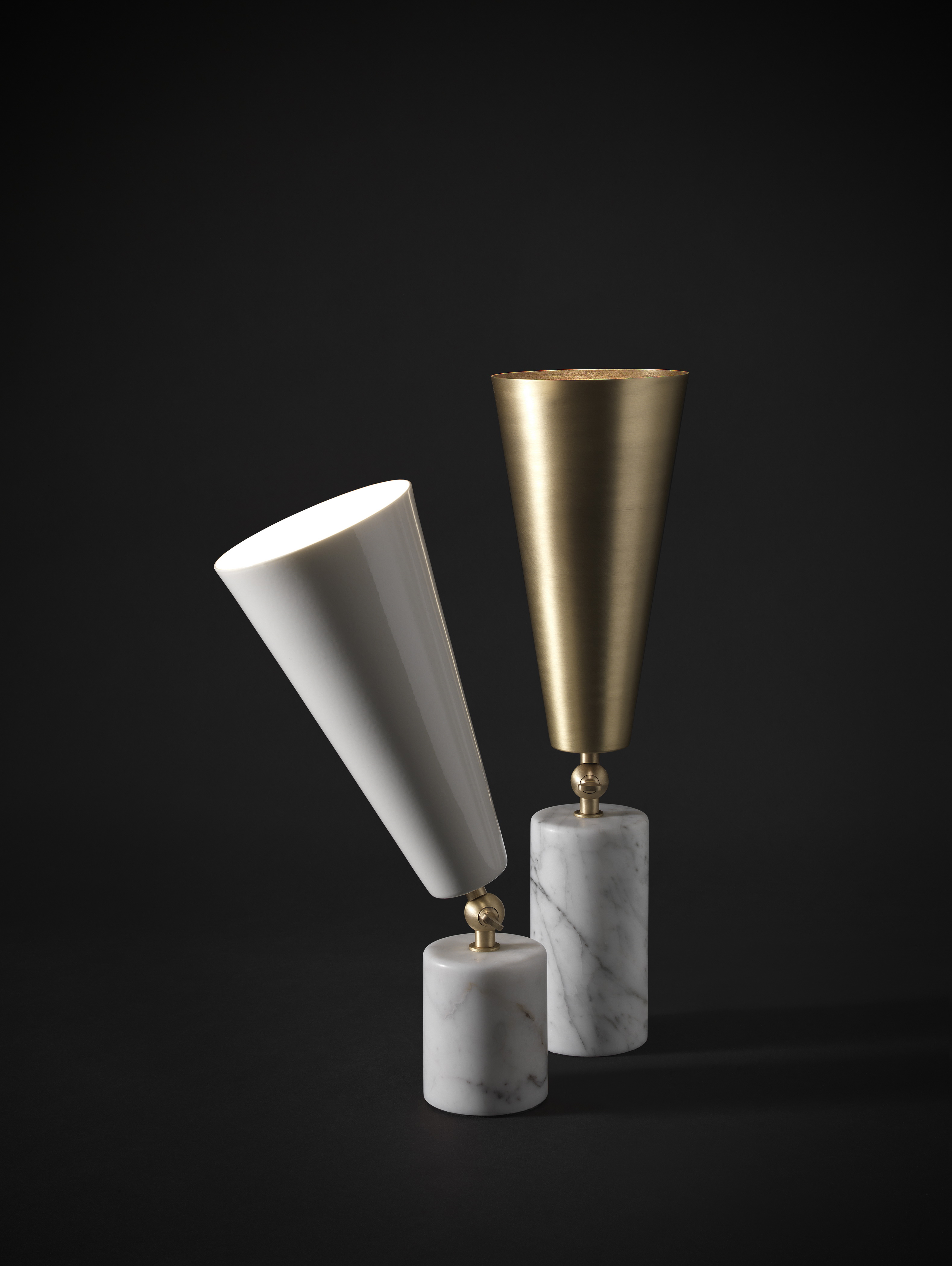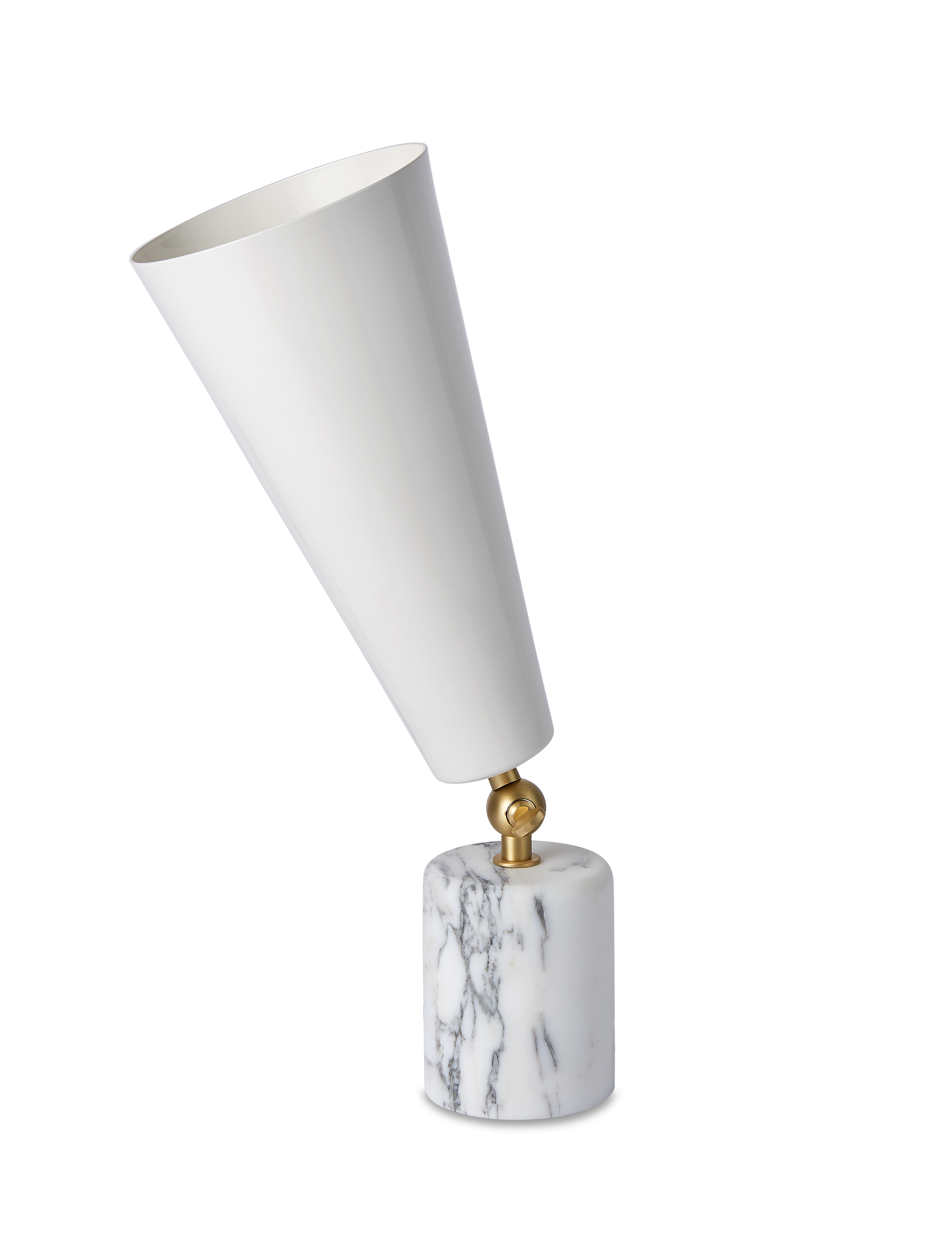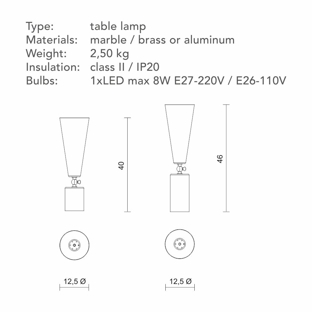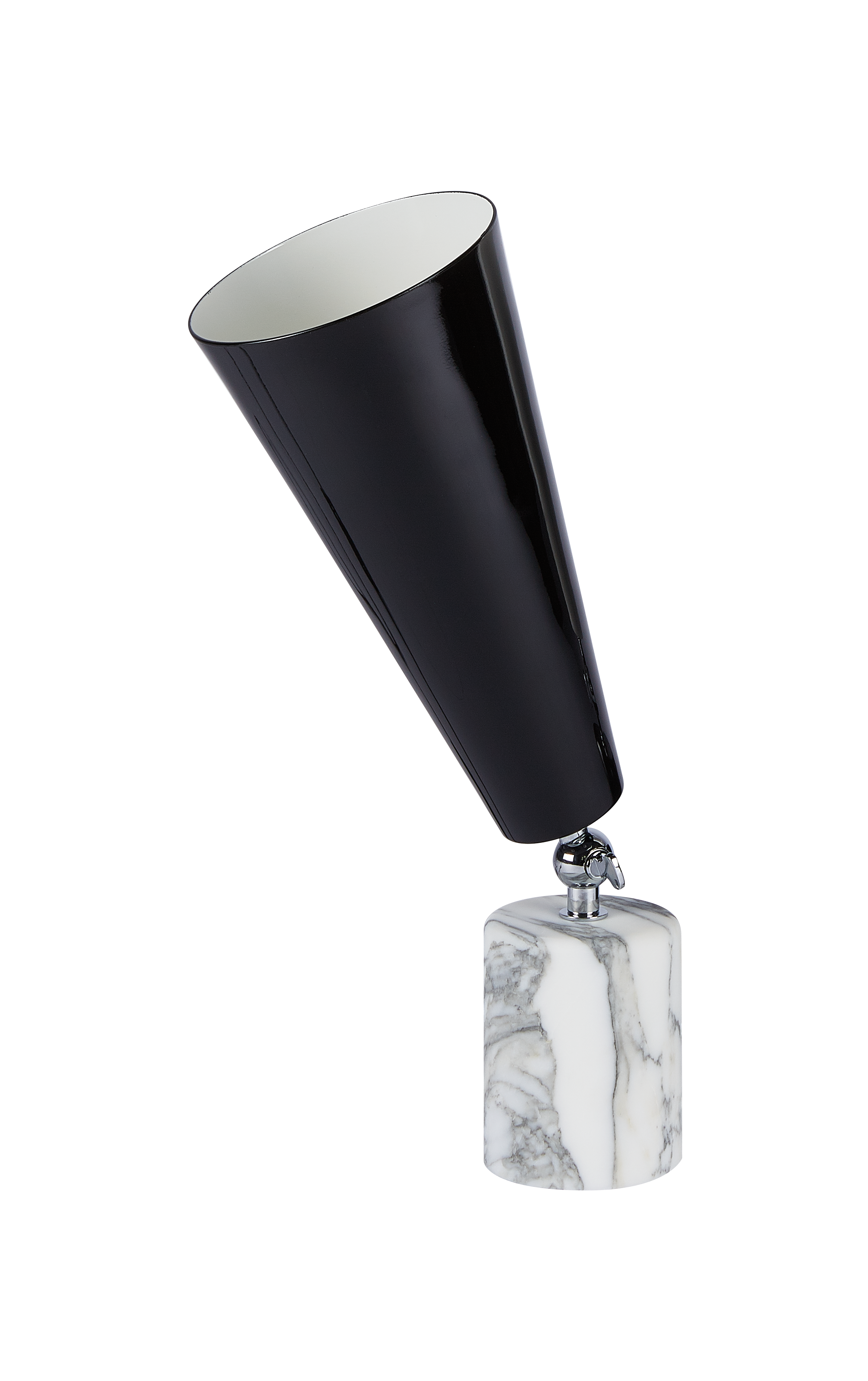 Vox - лампа с театральным призванием. Шарнир позволяет направлять свет в желаемом направлении, чтобы иметь возможность изменять атмосферу домашней сцены по своему желанию. Форма абажура напоминает старые граммофоны, отсюда и название. Основание из драгоценного мрамора делает его практичным и надежным.
