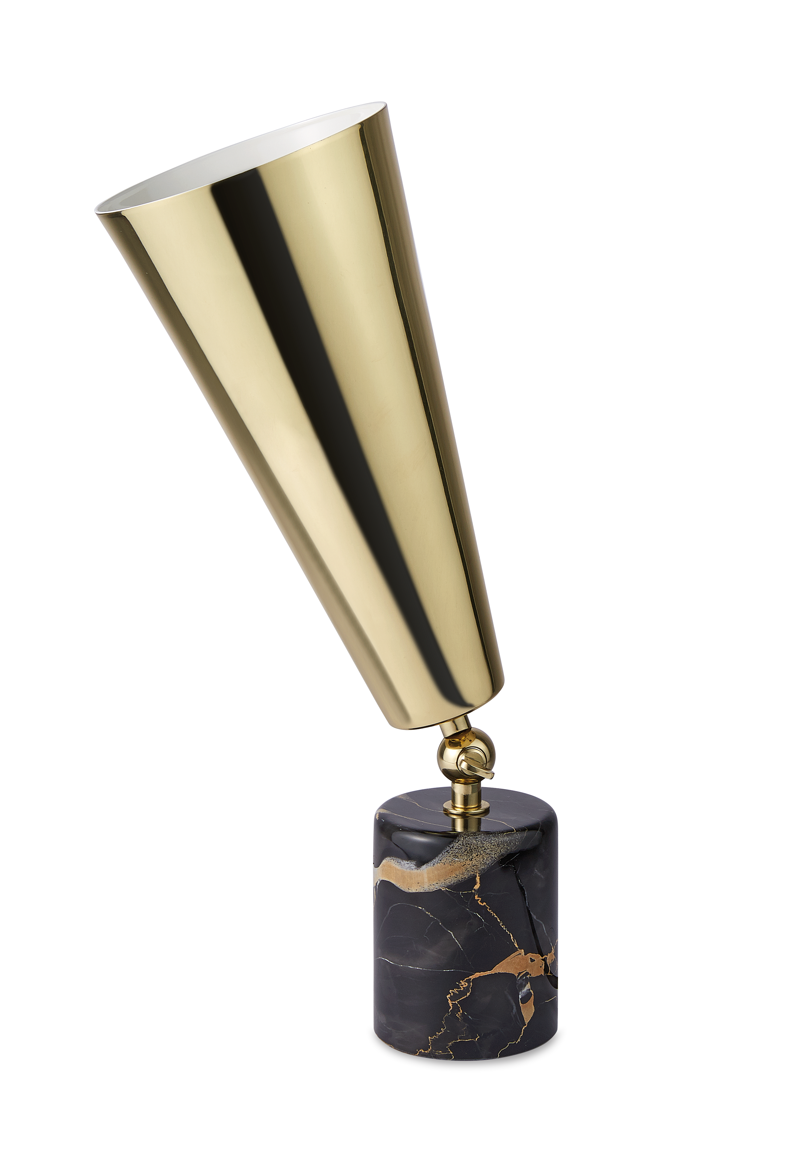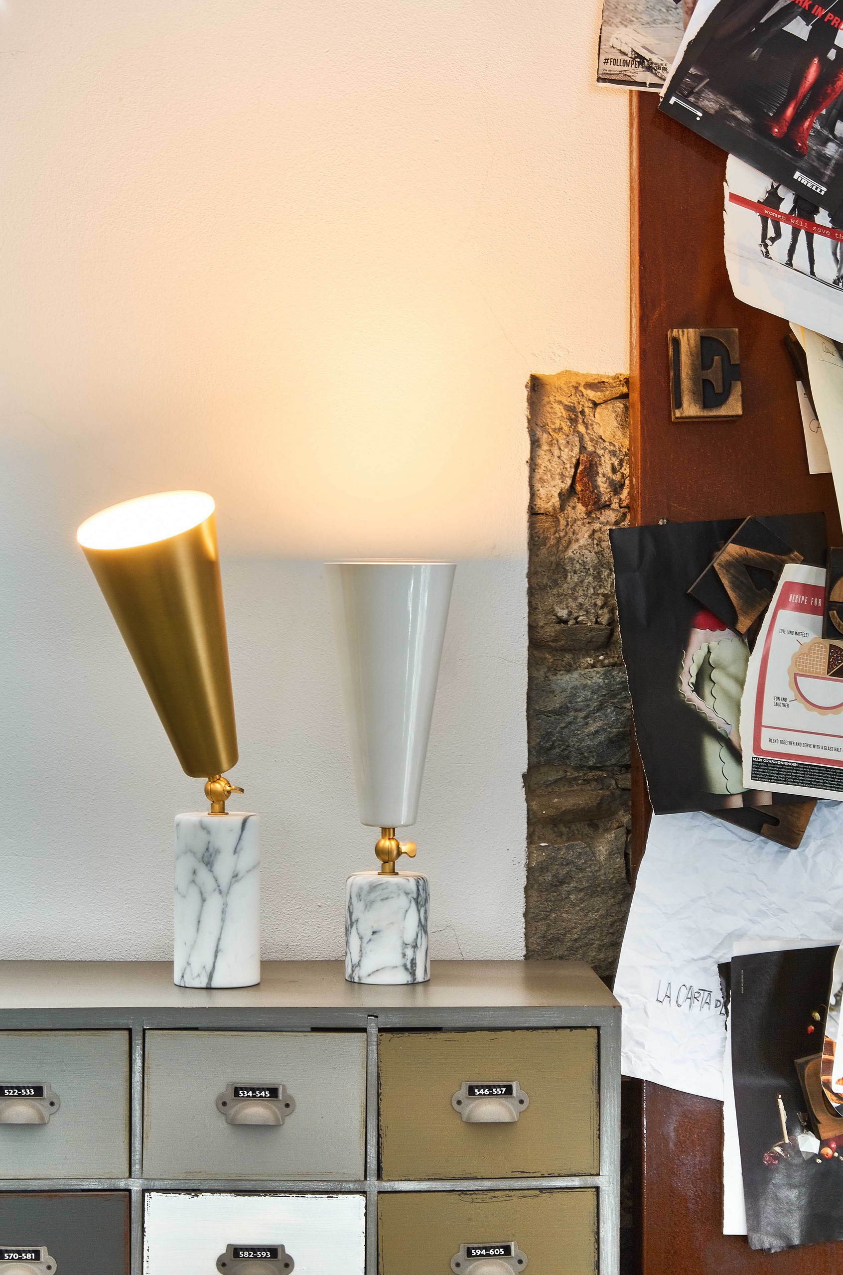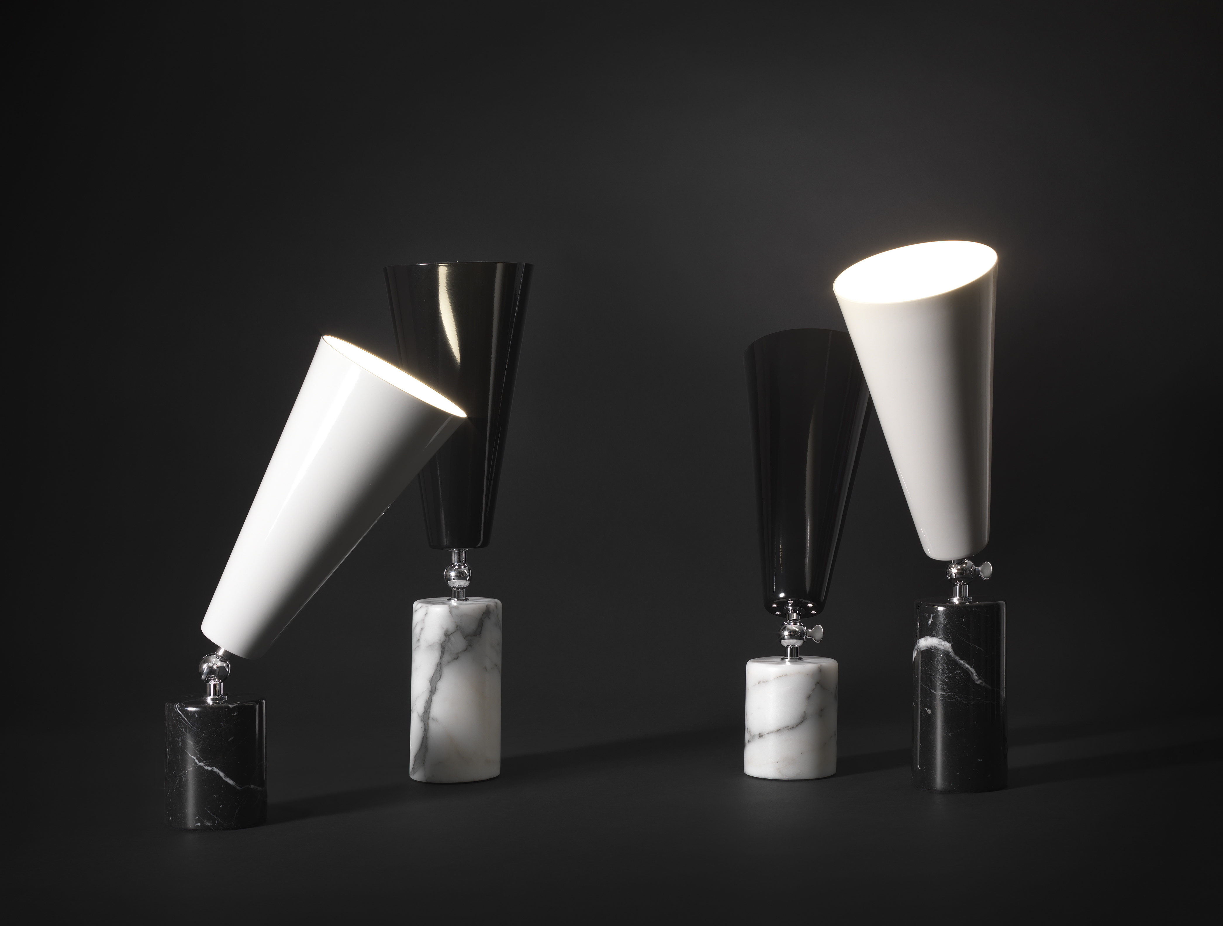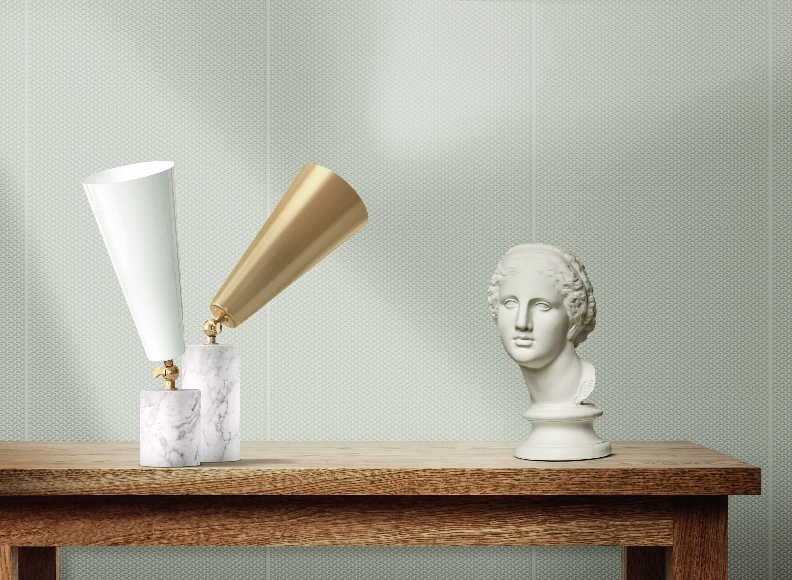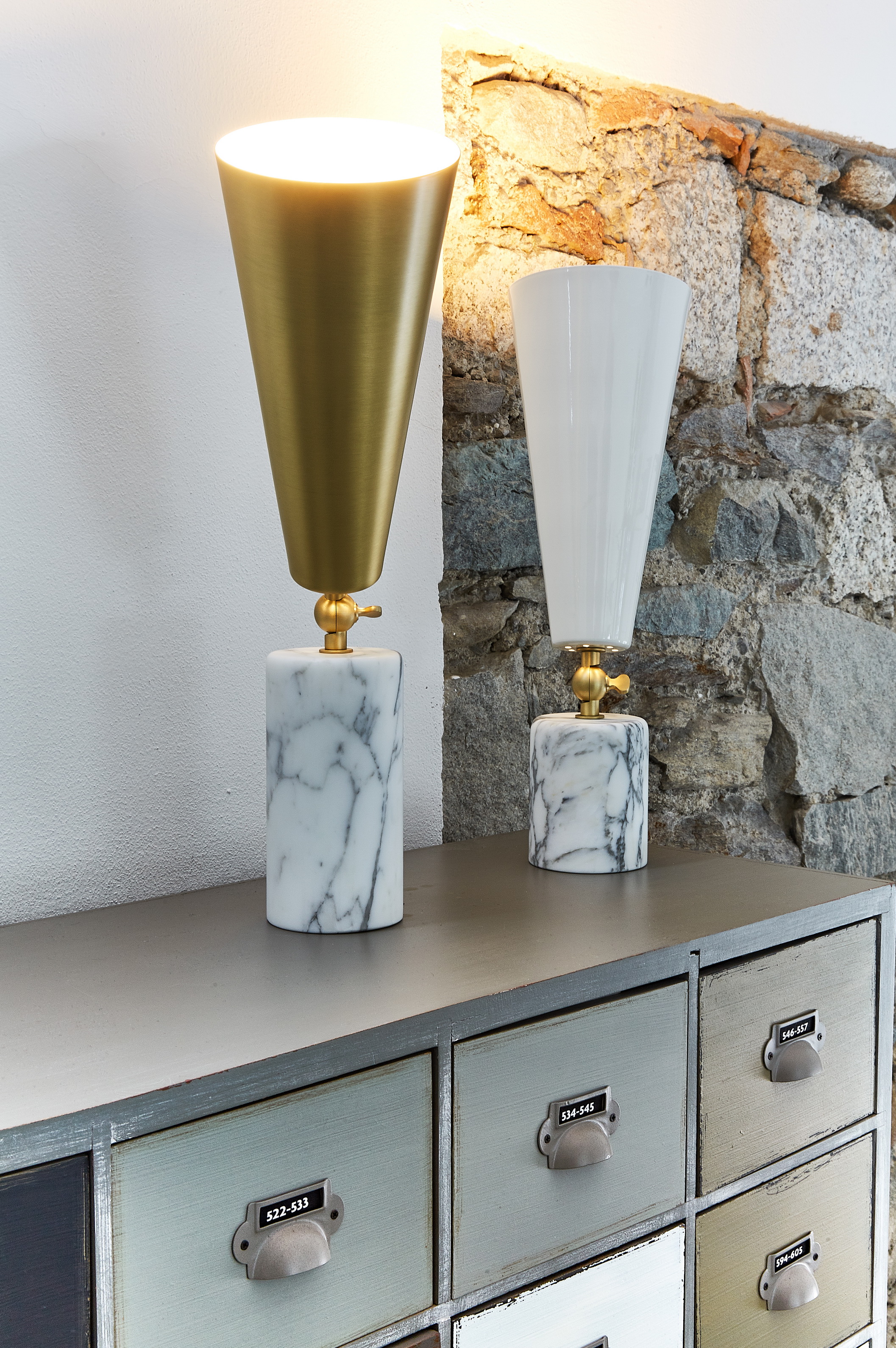 Vox - лампа с театральным призванием. Шарнир позволяет направлять свет в желаемом направлении, чтобы иметь возможность изменять атмосферу домашней сцены по своему желанию. Форма абажура напоминает старые граммофоны, отсюда и название. Основание из драгоценного мрамора делает его практичным и надежным.