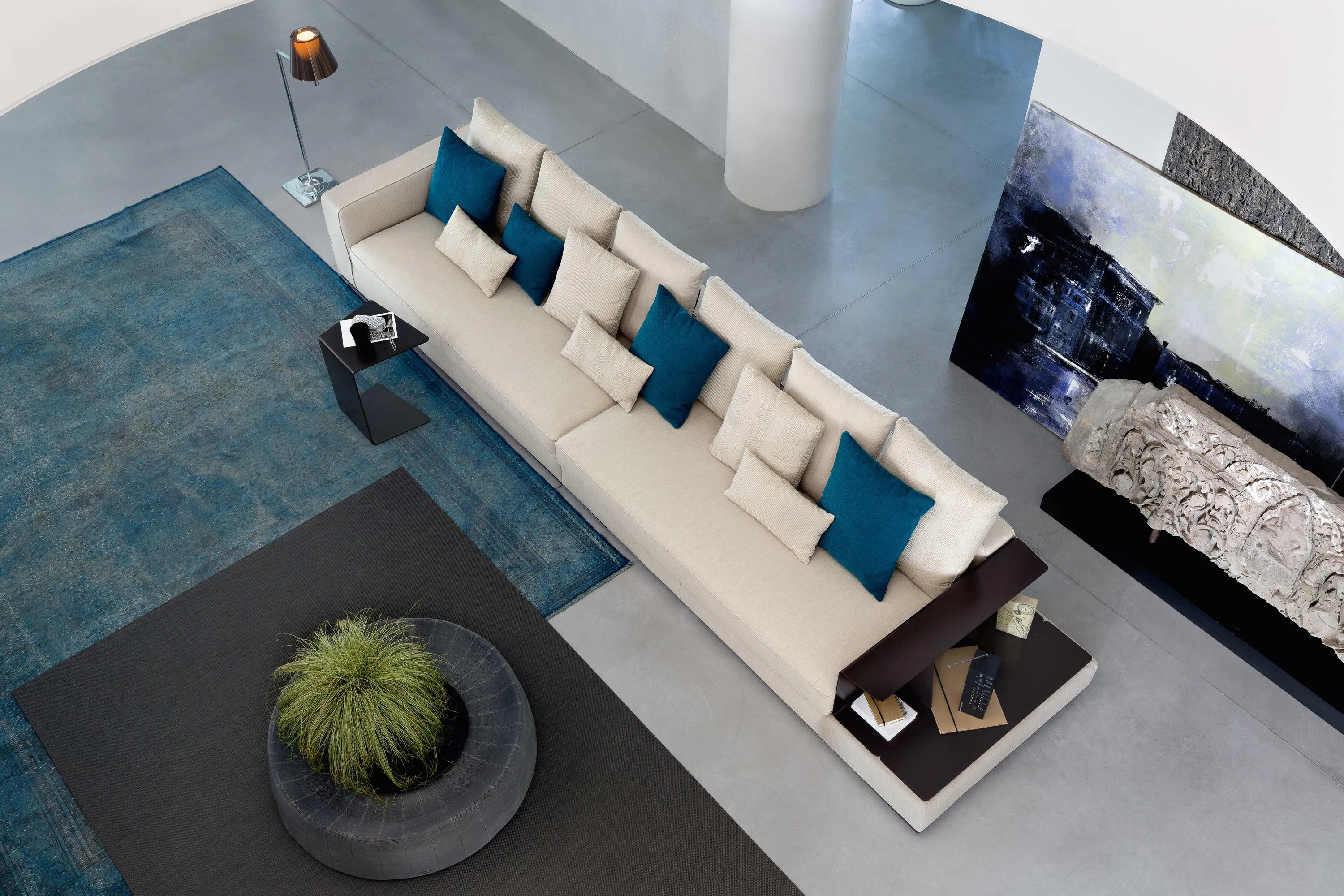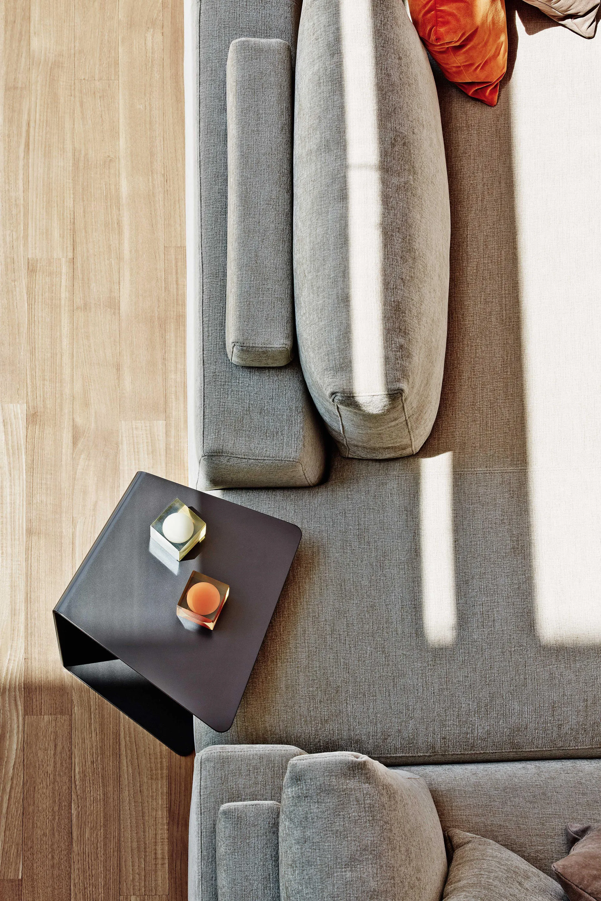 Серия аксессуаров, созданная для диванов Loman и Bijoux, включает стеллаж, полки и журнальный столик из окрашенной листовой стали.
