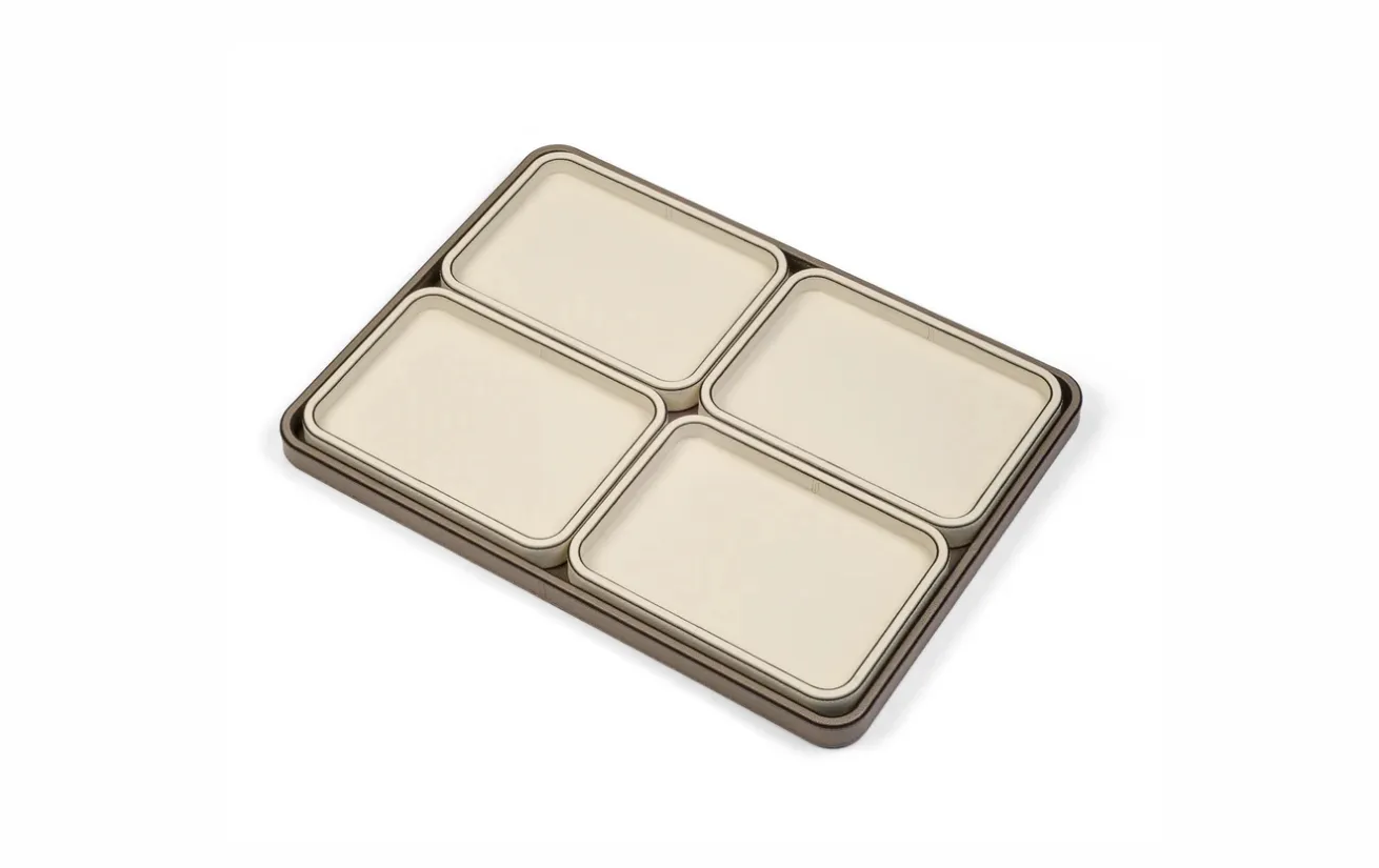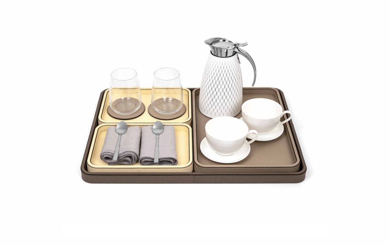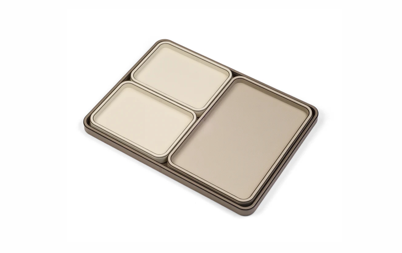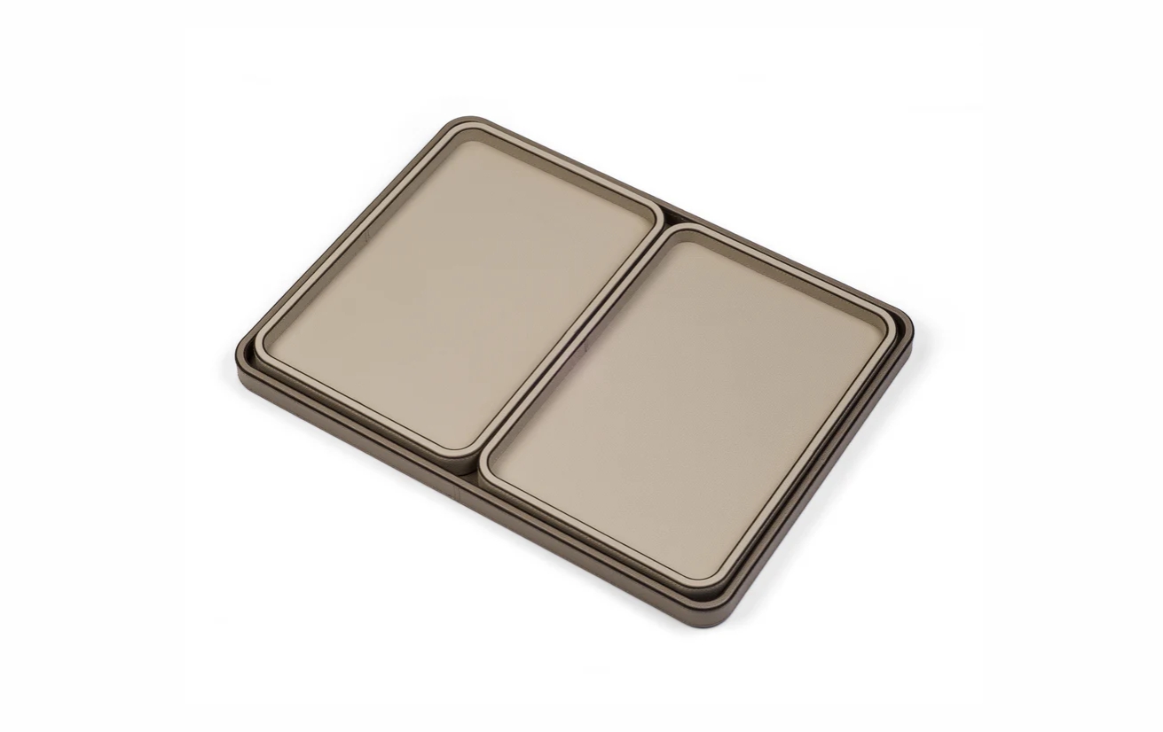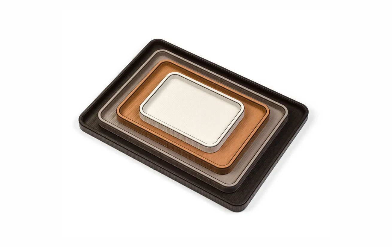 Прямоугольная деревянная конструкция с закруглёнными углами обтянута мягкой телячьей кожей, прошитой вручную. Поднос Jane доступен в 4 размерах, имеет нескользящее основание и водонепроницаемую поверхность, устойчивую к царапинам. Вам остаётся только выбрать подходящую конфигурацию.