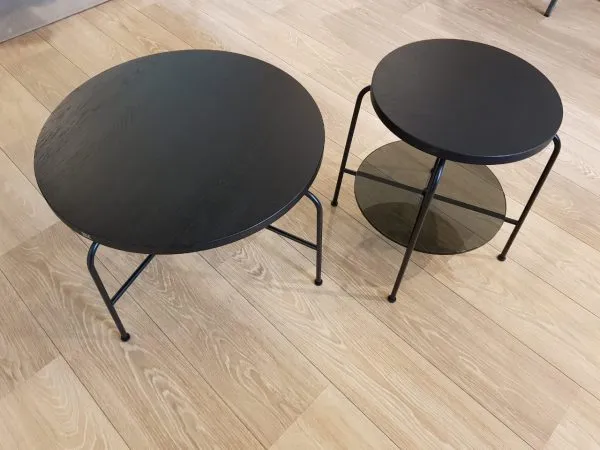 Столешница выполнена из массива дуба или американского ореха либо из натурального графита коричневого цвета. Каркас выполняется из стали; окрашенной в чёрный цвет. Вы можете выбрать пару столиков разной высоты. Использование журнальных столиков группами сейчас в тренде.