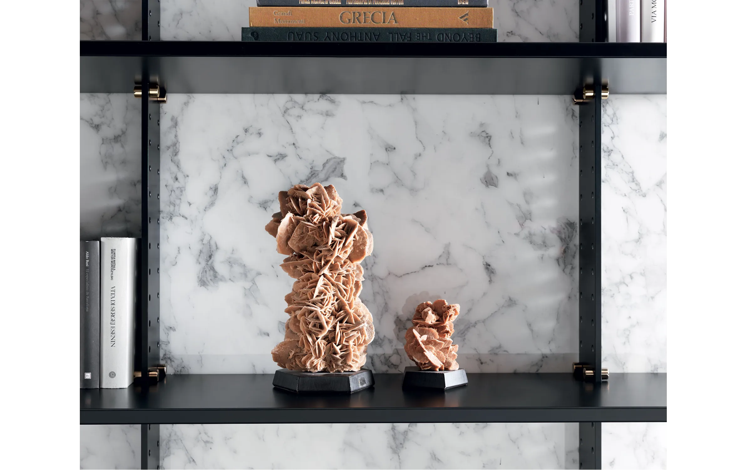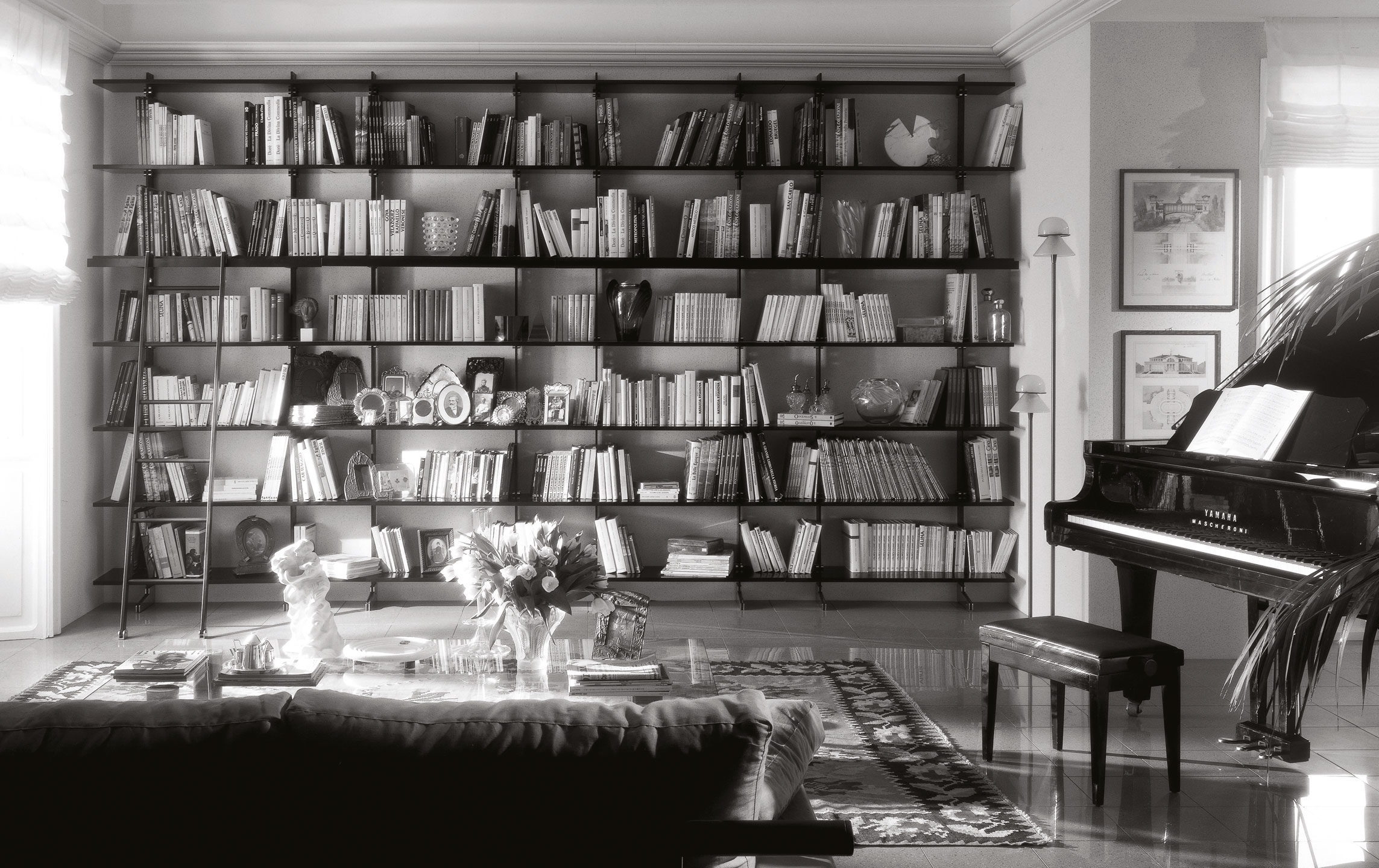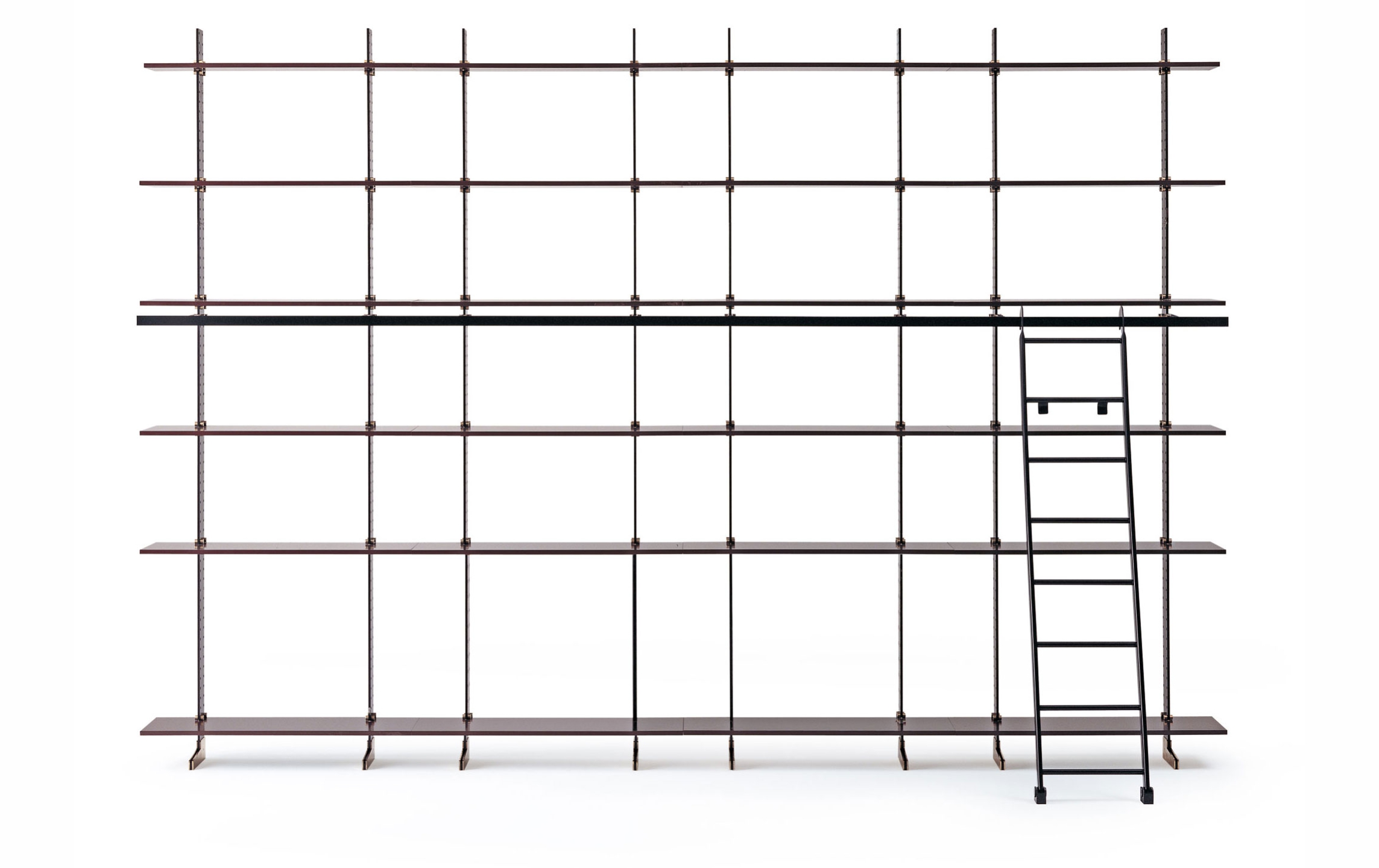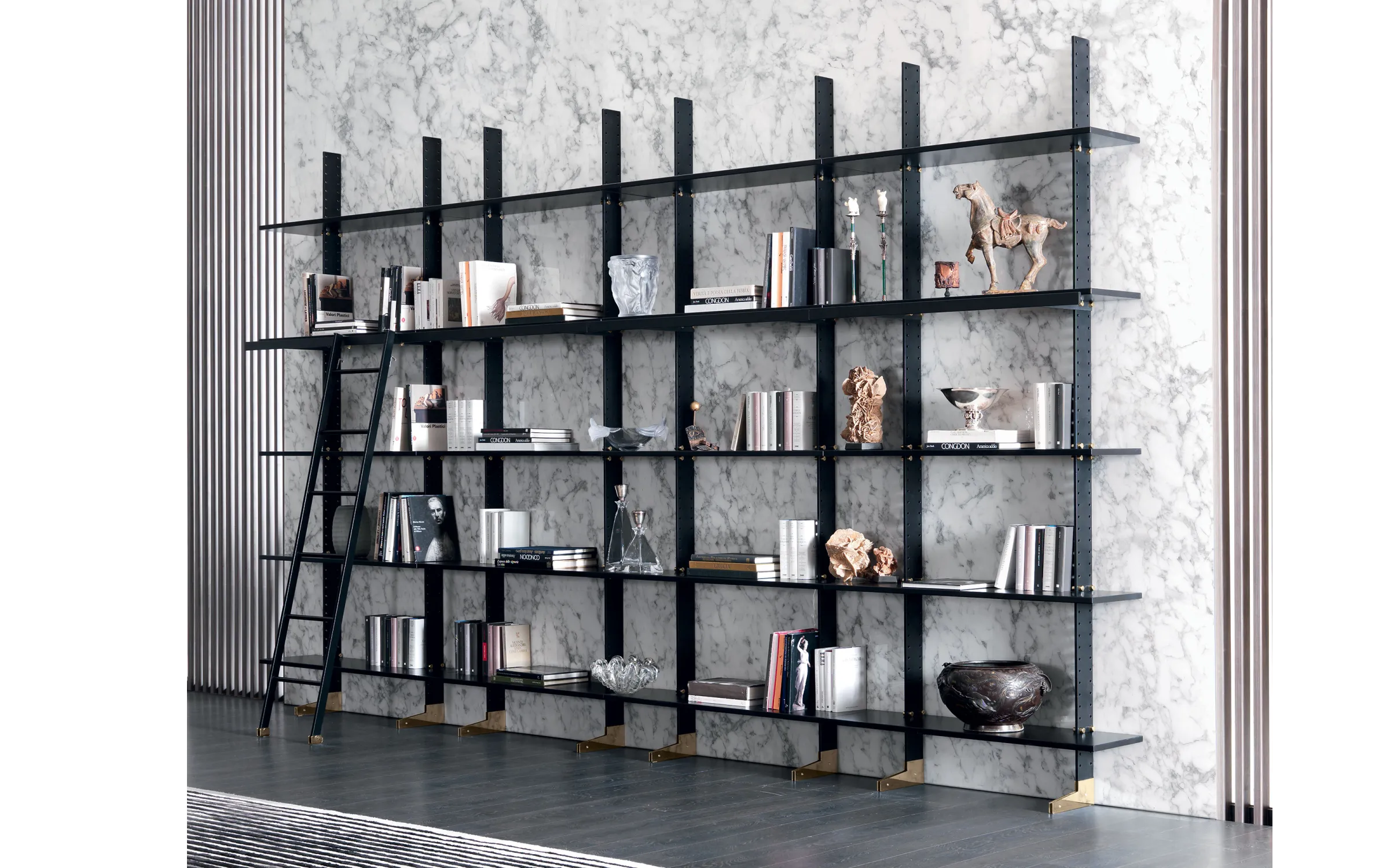 Модульная система Elegie позволяет создавать индивидуальные композиции, адаптированные под различные потребности и размеры помещений. Комбинируя несколько модулей, можно организовать как компактные, так и масштабные системы хранения. Для удобства использования предусмотрена металлическая лестница с черным покрытием и хромированными латунными деталями, облегчающая доступ к верхним полкам.