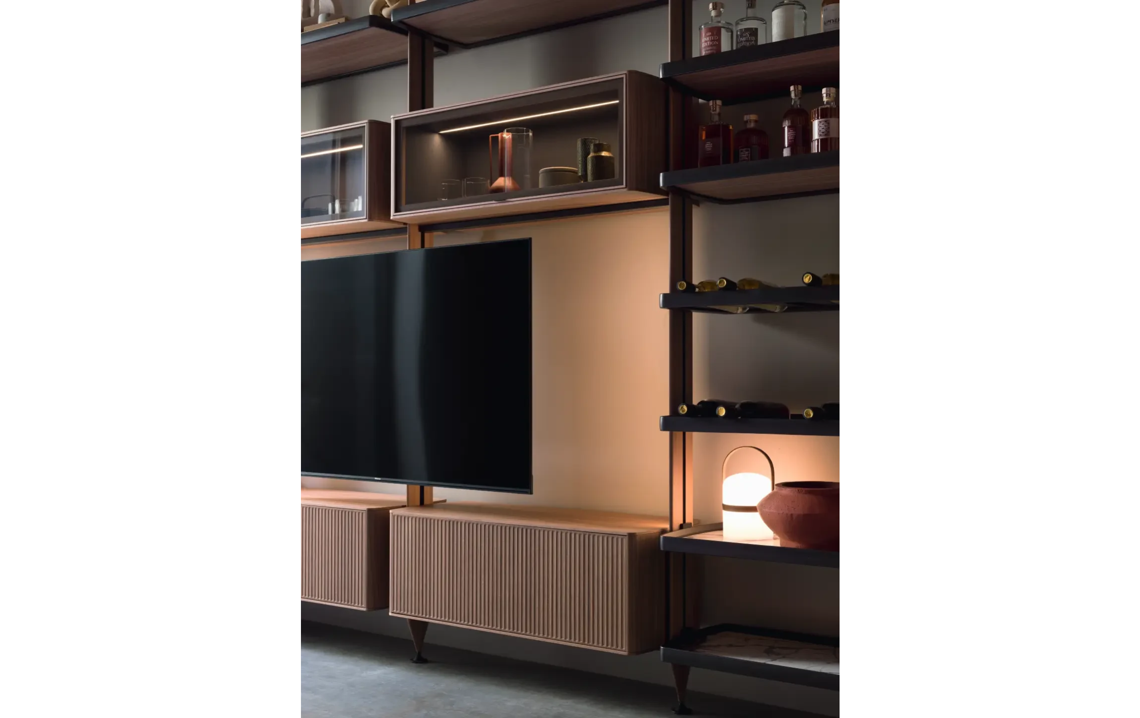 - Полная модульность — свободное сочетание полок, шкафов, ниш и ТВ-зон.