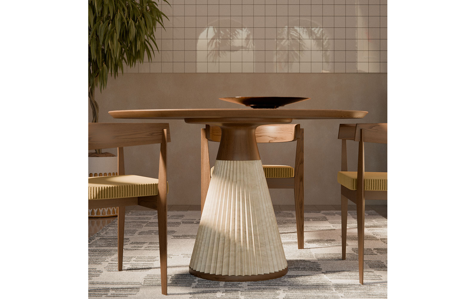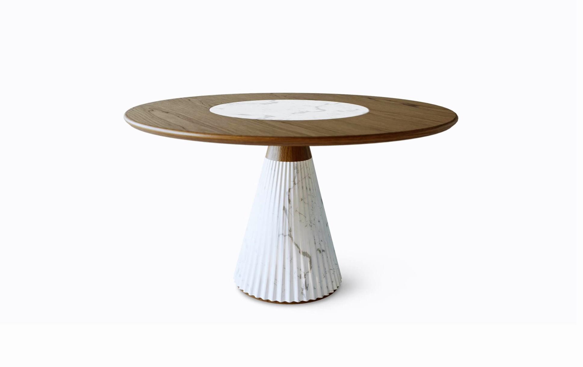 - Уникальный дизайн: Плиссированный мрамор и ясень создают скульптурный эффект, превращая стол в центральный элемент интерьера.