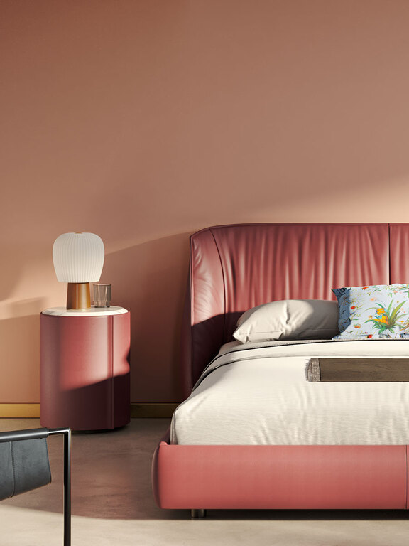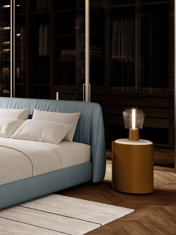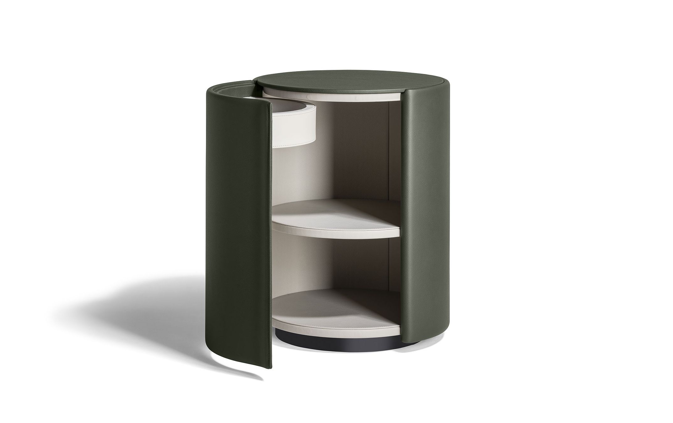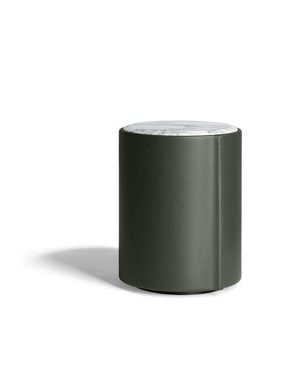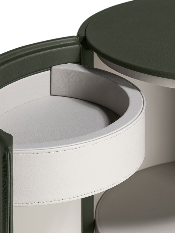 Несущая рама и дверца прикроватной тумбочки Stock’n Roll изготовлены из гнутой буковой фанеры и массива бука. Обивка выполнена из кожи Pelle Frau® с прострочкой в тон. Одним жестом дверца с небольшим внутренним подносом открывается, демонстрируя оборудованное отделение с полкой-органайзером. Полка и топ изготовлены из березовой фанеры и обработаны в тон внешней поверхности. Правое и левое открывание. В наличии 2 тумбы.