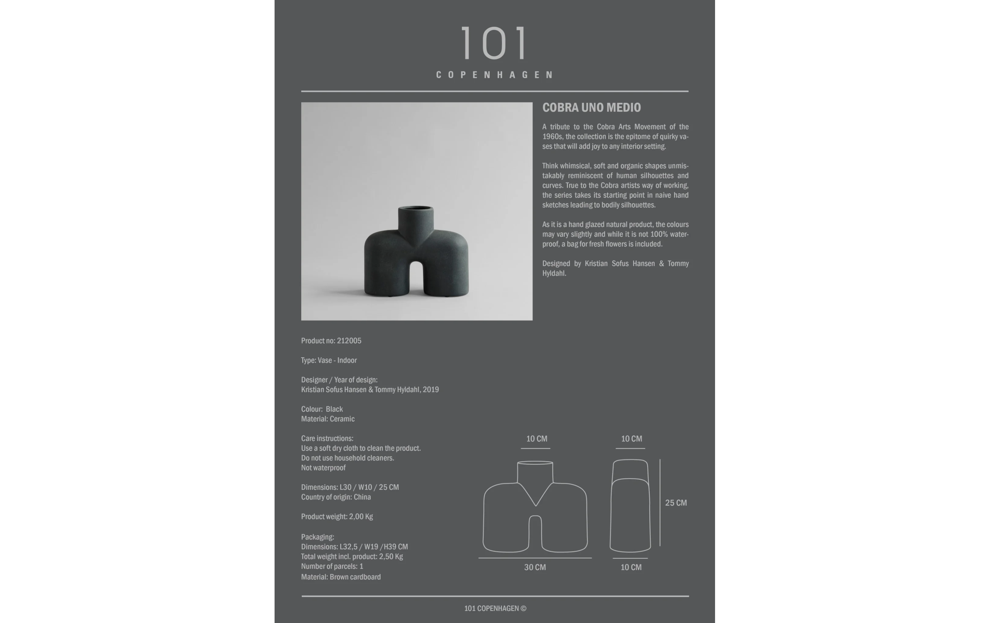 Cobra Medio Black от 101 Copenhagen — это не просто ваза, а выразительный арт-объект, вдохновлённый эстетикой движения CoBrA 1960-х годов. Её форма напоминает человеческий силуэт, сочетая в себе мягкие, органичные линии и архитектурную строгость. Дизайн, разработанный Кристианом Софусом Хансеном и Томми Хюльдалем, превращает функциональный предмет в элемент современного искусства. Изготовленная вручную из керамики и покрытая чёрной матовой глазурью, ваза обладает уникальной текстурой, напоминающей замшу. Каждое изделие индивидуально, благодаря ручной отделке и особенностям глазурования. Ваза не является водонепроницаемой, но в комплект входит специальный пакет для свежих цветов.