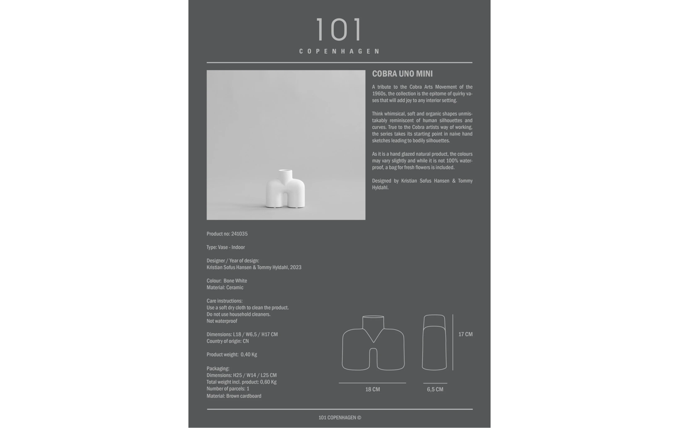 Cobra Mini Bone White от 101 Copenhagen — это не просто ваза, а выразительный арт-объект, вдохновлённый эстетикой движения CoBrA 1960-х годов. Её форма напоминает человеческий силуэт, сочетая в себе мягкие, органичные линии и архитектурную строгость. Дизайн, разработанный Кристианом Софусом Хансеном и Томми Хюльдалем, превращает функциональный предмет в элемент современного искусства. Изготовленная вручную из керамики и покрытая белой матовой глазурью, ваза обладает уникальной текстурой, напоминающей замшу. Каждое изделие индивидуально, благодаря ручной отделке и особенностям глазурования. Ваза не является водонепроницаемой, но в комплект входит специальный пакет для свежих цветов.