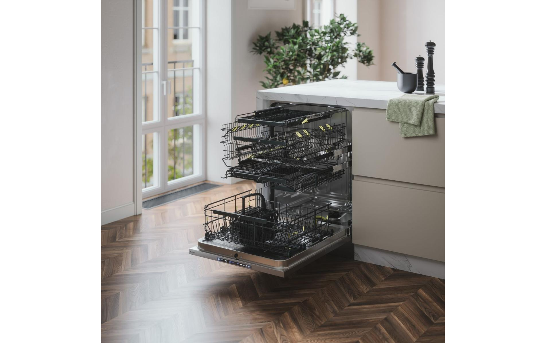 Благодаря увеличенному объему камеры вы можете загрузить одновременно до семнадцати комплектов посуды, разместив их на четырех уровнях: помимо верхней, средней и нижней корзины есть также съемный верхний лоток. Его и первую корзину можно регулировать по высоте для лучшего размещения тарелок и чашек разного размера. Внизу также есть отдельная корзинка для столовых приборов, которая ставится рядом с одним из разбрызгивателей.