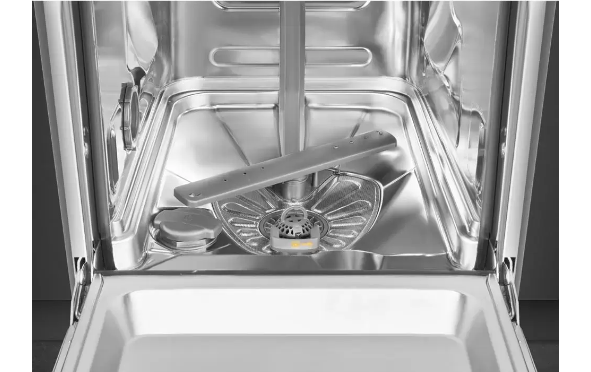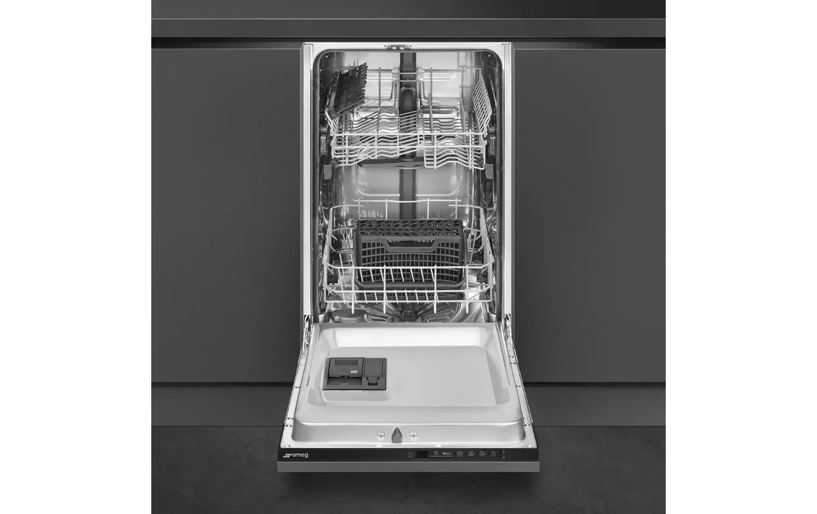 Встраиваемая посудомоечная машина Smeg ST4512IN — узкая модель шириной 45 см для установки в малогабаритной кухне. Она рассчитана на одновременную мойку 9 комплектов посуды — в каждый комплект входят глубокая и мелкая тарелки, салатник, чашка с блюдцем, вилка и ложка. На фронтальную часть машины может быть установлен мебельный фасад весом не более 7,5 кг на скользящих петлях. Рабочая камера и фильтр изготовлены из нержавеющей стали, а дверца — из оцинкованной стали. Для защиты от протечек в посудомоечной машине Смег ST4512IN предусмотрена система «полный Aquastop». Имеется возможность подключения к горячей воде — экономия электроэнергии при этом может составить до 35%.