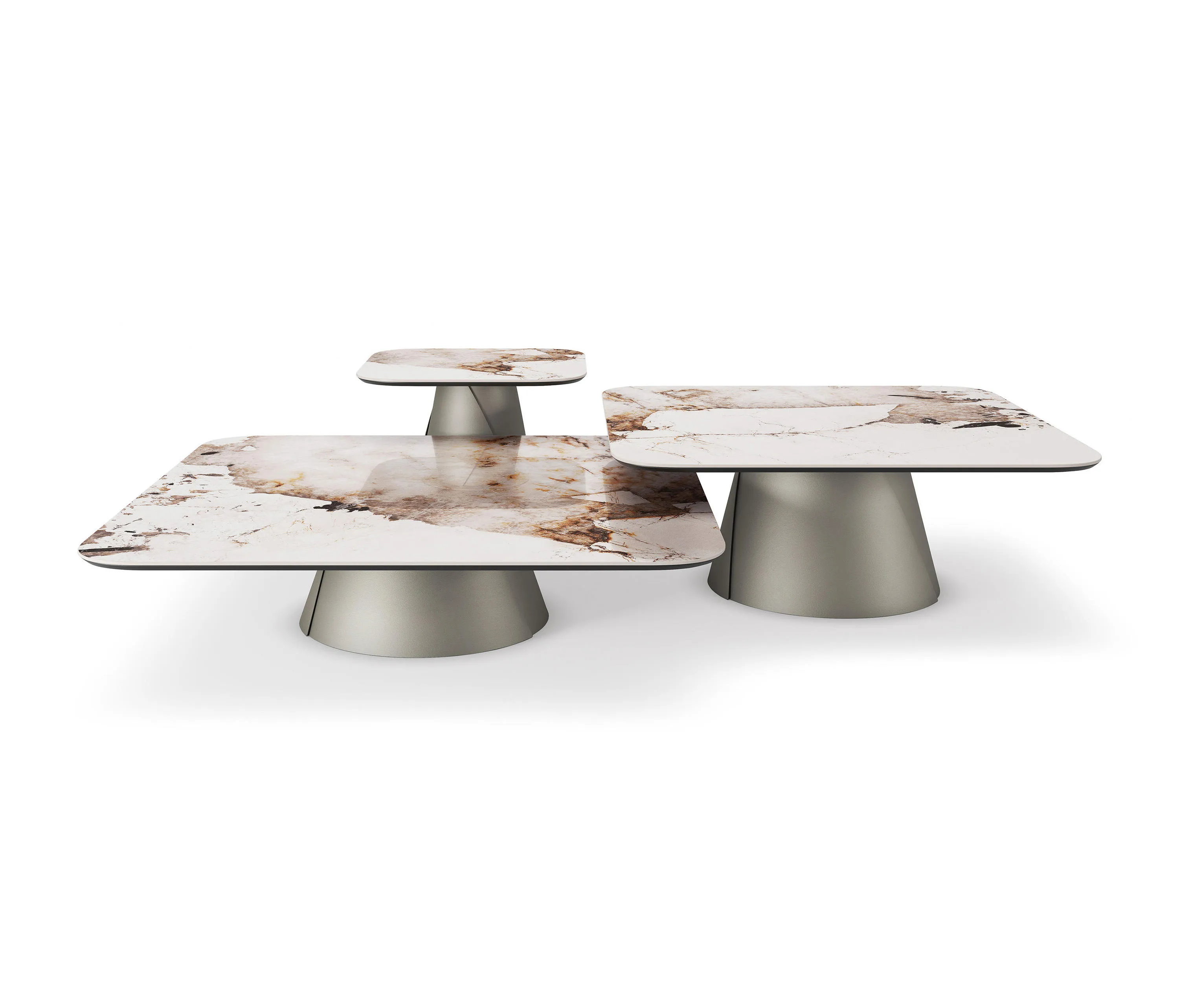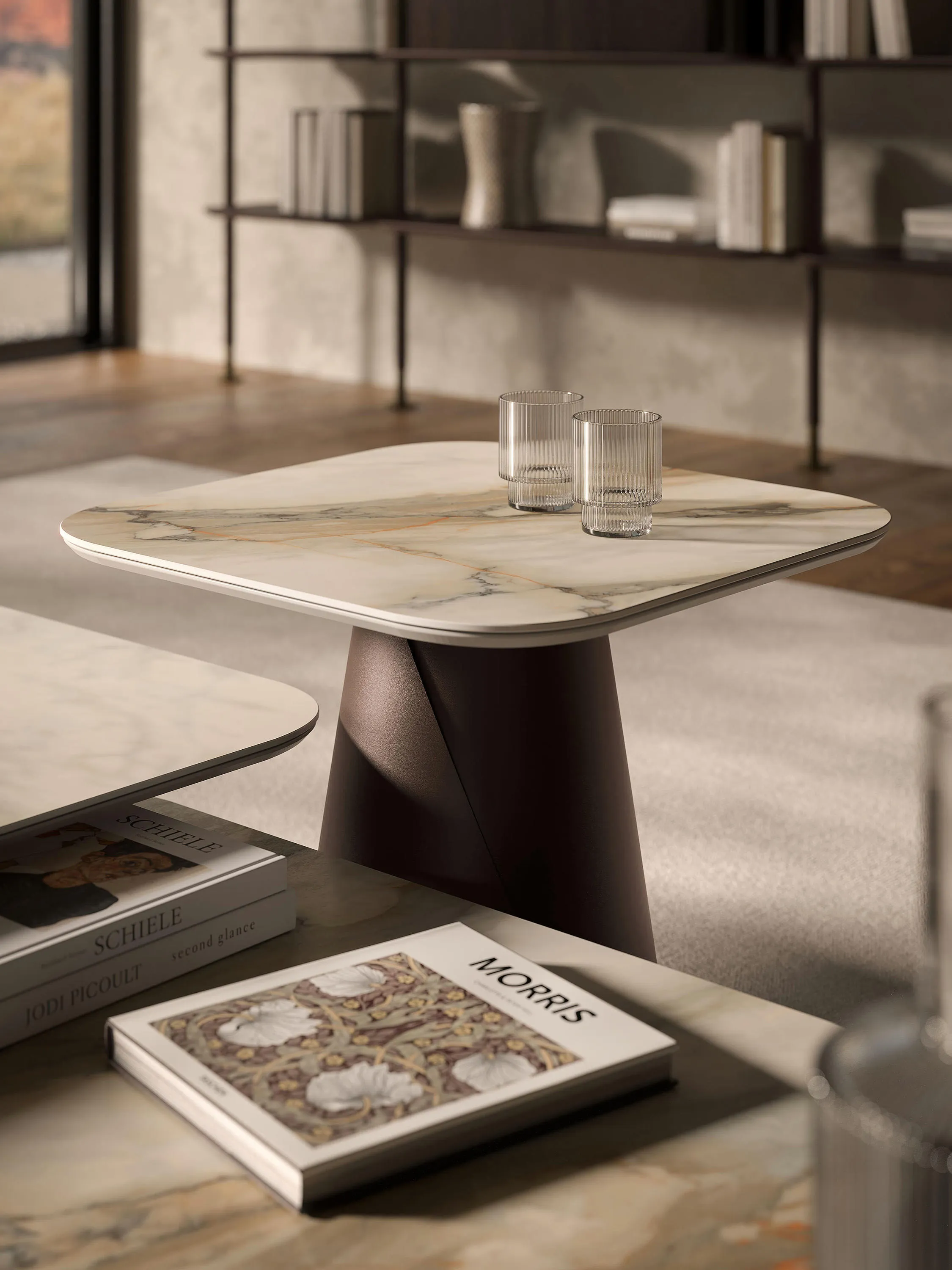 Современные журнальные столики Albert Keramik в квадратной версии привносят стиль и изысканность в любую дизайнерскую гостиную. Эти дизайнерские журнальные столики, состоящие из двух простых фигур, поставленных одна на другую, находят свое наиболее полное выражение, когда их ставят рядом на разной высоте и размеров. Игра столешниц на нескольких уровнях придает динамизм любой обстановке, обставленной со сдержанной элегантностью, в которой эти современные керамические журнальные столики становятся звездами. Коническое металлическое основание, разработанное Джорджио Каттеланом, кажется громоздким, но имеет стройный силуэт благодаря двум диагональным деталям, которые напоминают две свернутые внахлест стальные пластины. Керамическая столешница может быть изготовлена по индивидуальному заказу, на выбор предлагаются круглые варианты или модель квадратного керамического журнального столика со скругленными углами, а также различные элегантные и роскошные оттенки с прожилками под мрамор. Баланс между простотой и вниманием к деталям делает семейство Albert элегантными и незаменимыми дизайнерскими журнальными столиками.