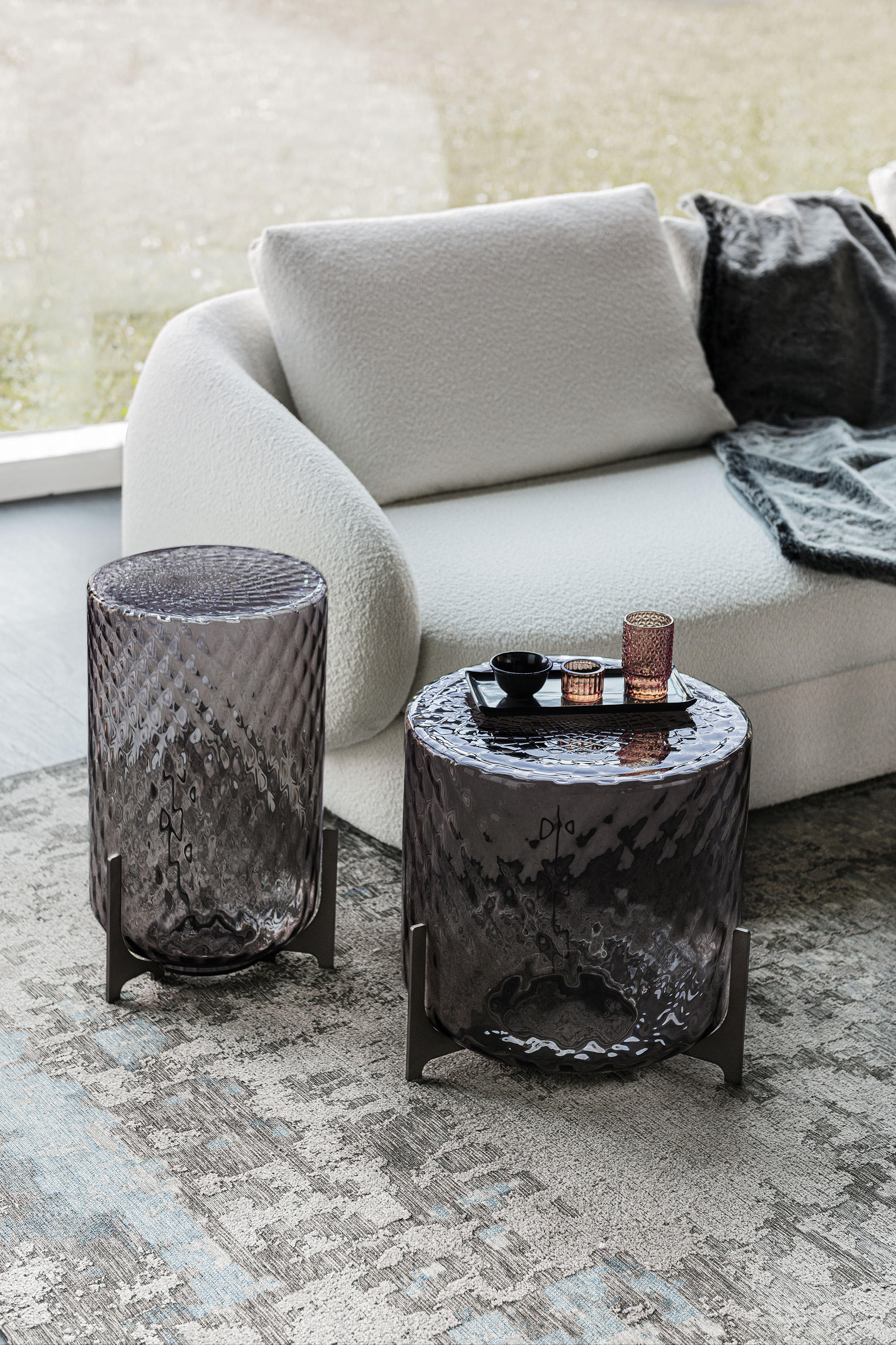 Три опоры, образующие ножки, имеют резкий внешний вид, который контрастирует с округлостью дизайнерского стола. Эта деталь также вносит свой вклад в общий эффект ретро-стиля, адаптированного к современному стилю. Этот журнальный столик является выражением великолепия изделий из стекла ручной работы.