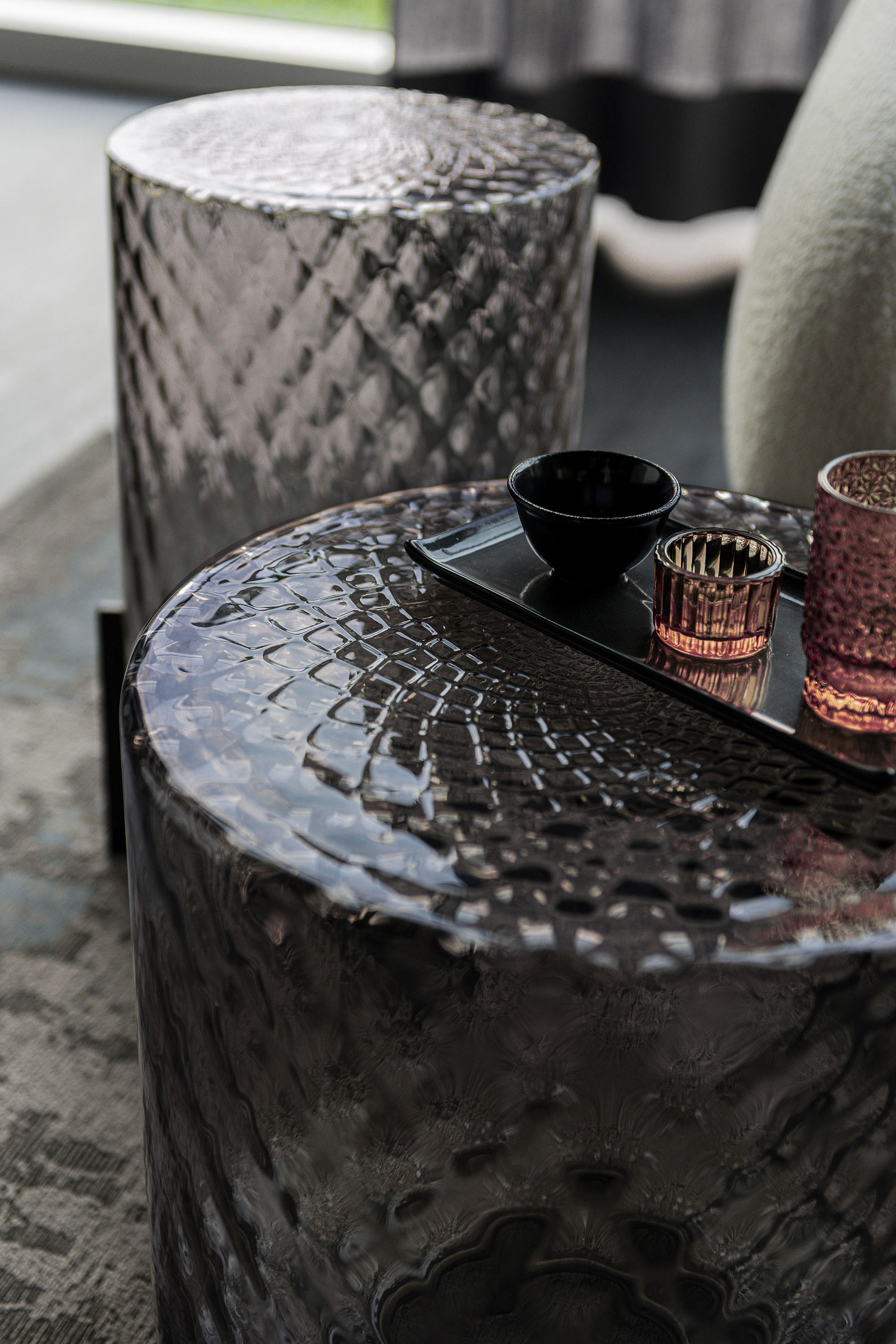 Корпус стеклянного журнального столика Dodo украшен трехмерным рисунком из перекрещивающихся ромбов, полученным по металлической форме. В результате выдувания наконечники внутри формы придают форму расплавленному стеклу и создают характерный эффект огранки, характерный для процесса balloton. В верхней части выполнен узор в виде мандалы, слегка смещенный от центра в месте соединения ромбов формы, создавая узор, напоминающий лепестки цветов или идеальные узоры буддийской традиции, с помощью которых природа выражает свое великолепие.